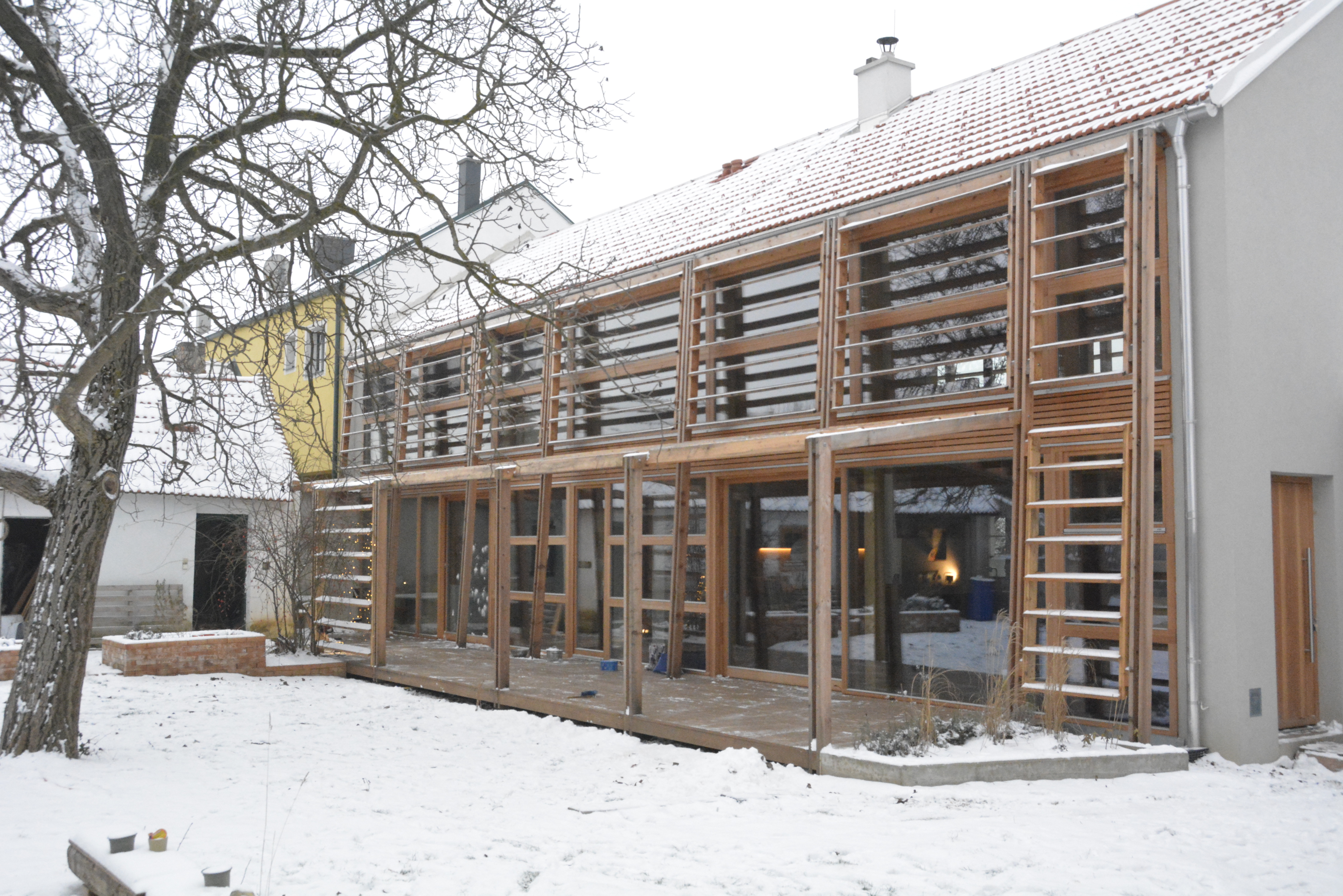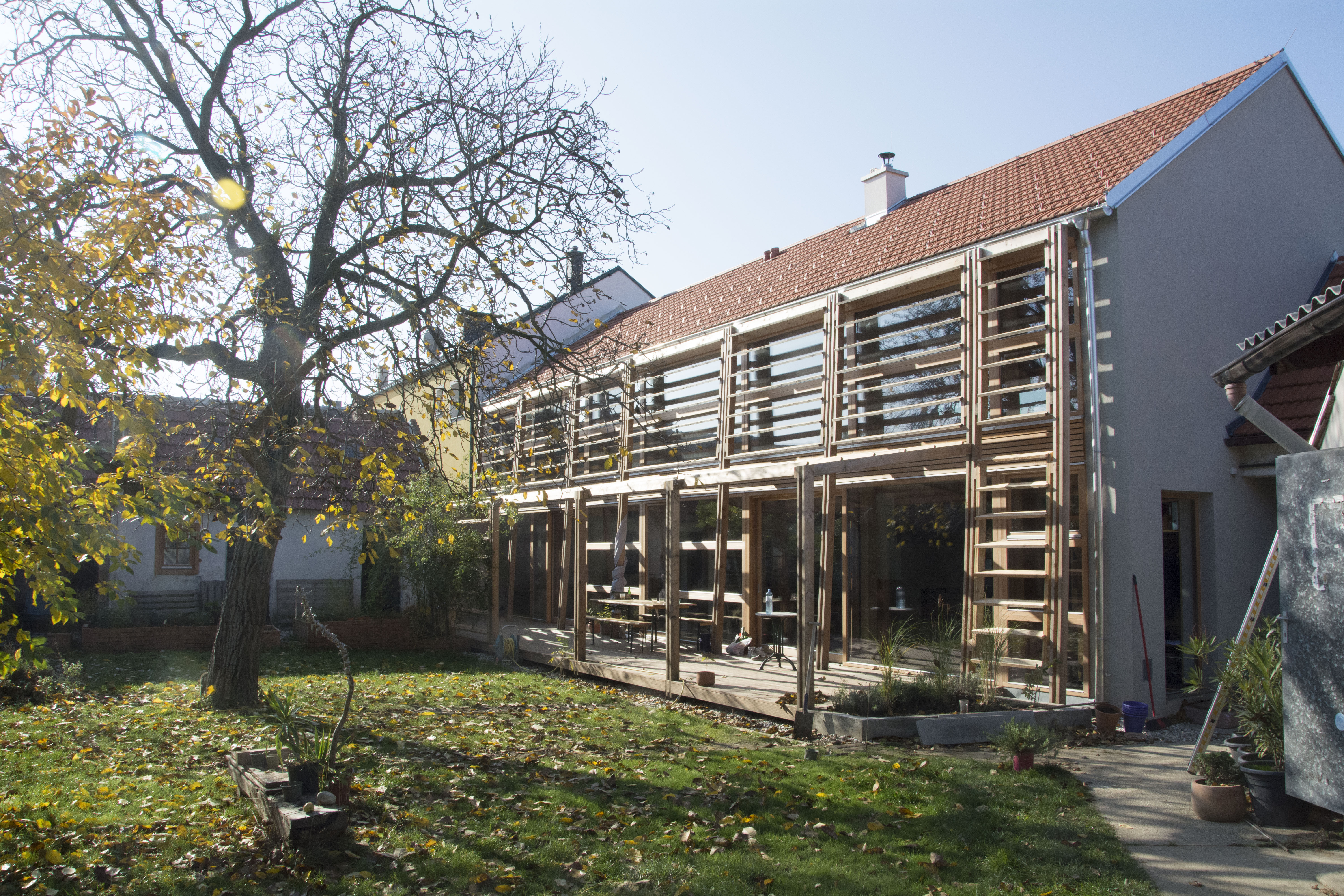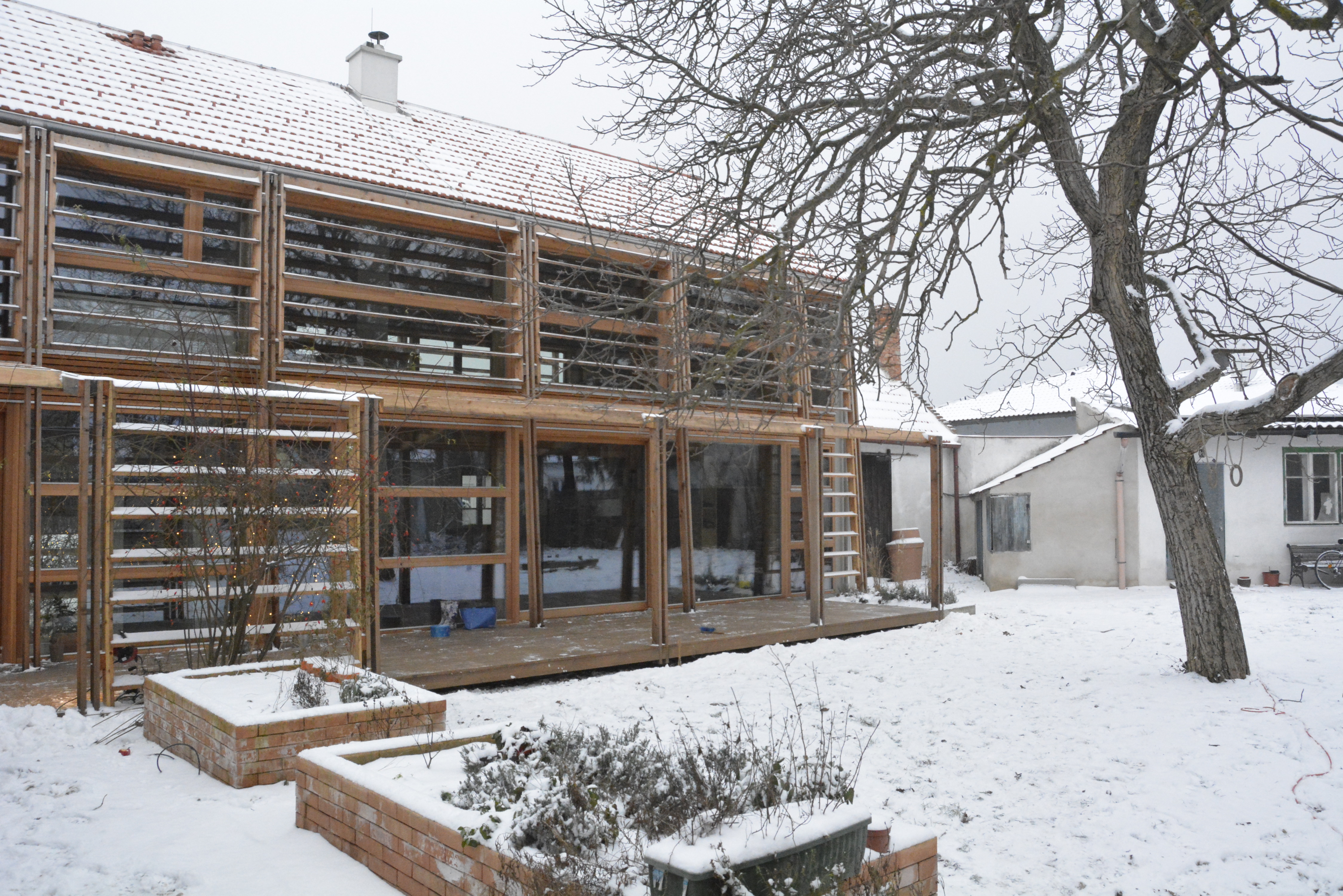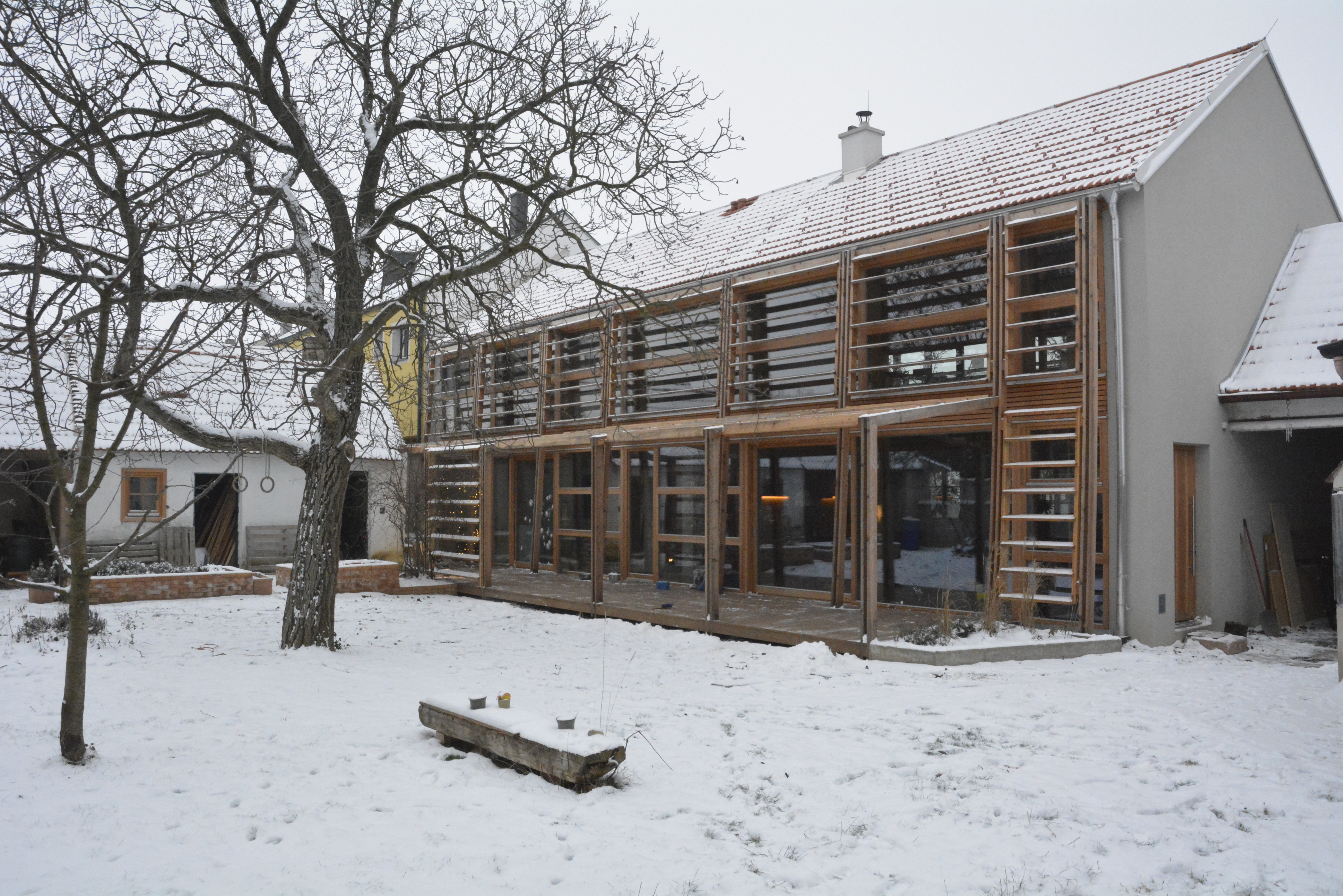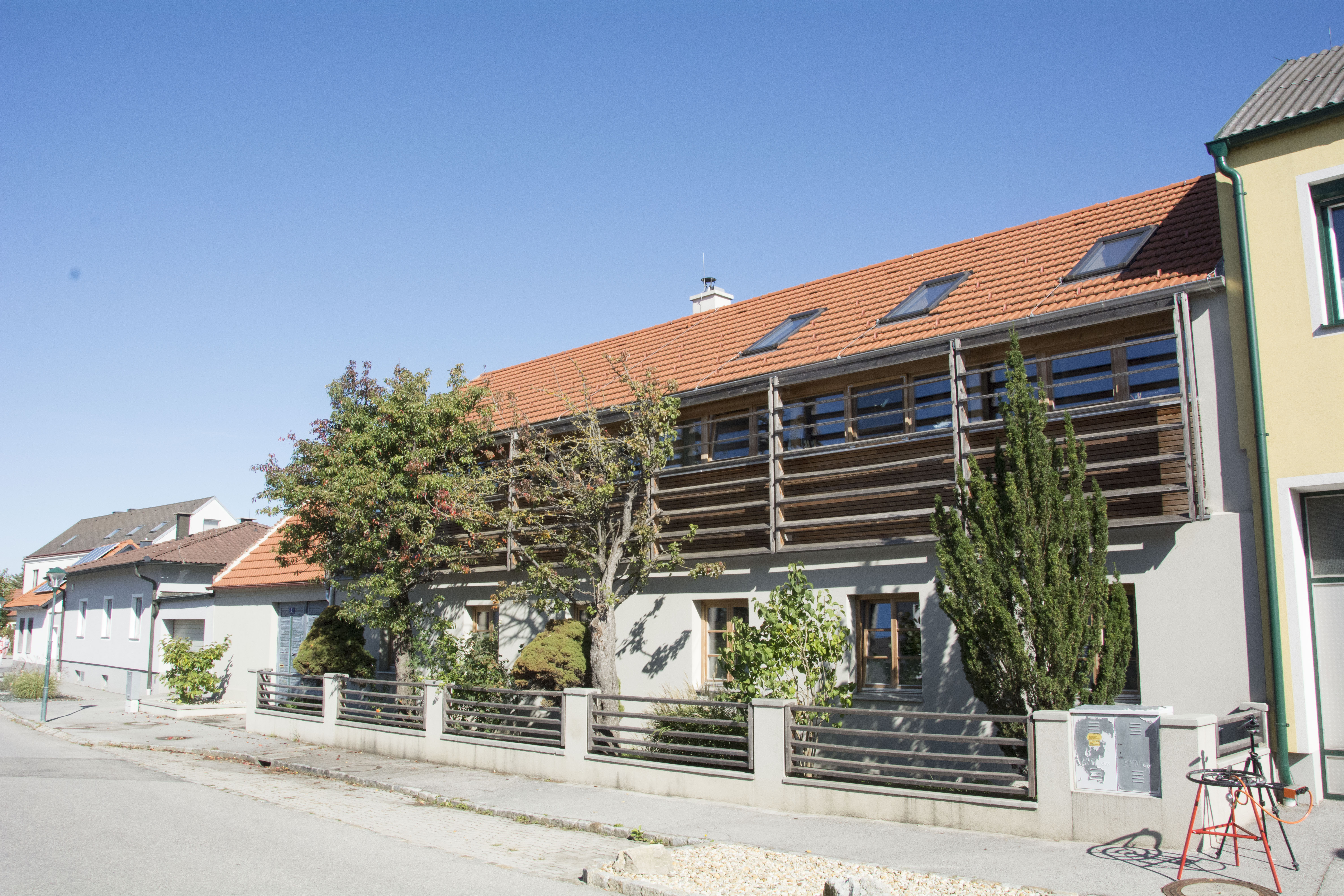 Ein Weinbauer erweitert seinen Hof um eine Wohneinheit. Der Entwurf schmiegt sich auf das bestehende Gebäude und versucht mithilfe der Höhenstaffelung die Aura des Innenhofes, der auch zeitweise als Heurigen genutzt wird nicht zu zerstören. Der Haupt-Wohnraum sitzt wie ein Vogelhäuschen ganz oben, und wird von zwei Terrassen – eine gegen Osten, die andere gegen Westen, begrenzt. Um die Leichtigkeit zu betonen ist die gesamte Konstruktion aus Holz. Um die Auflösung des Körpers zu unterstreichen, ist die Fassade in einzelne Lamellen aufgelöst.
