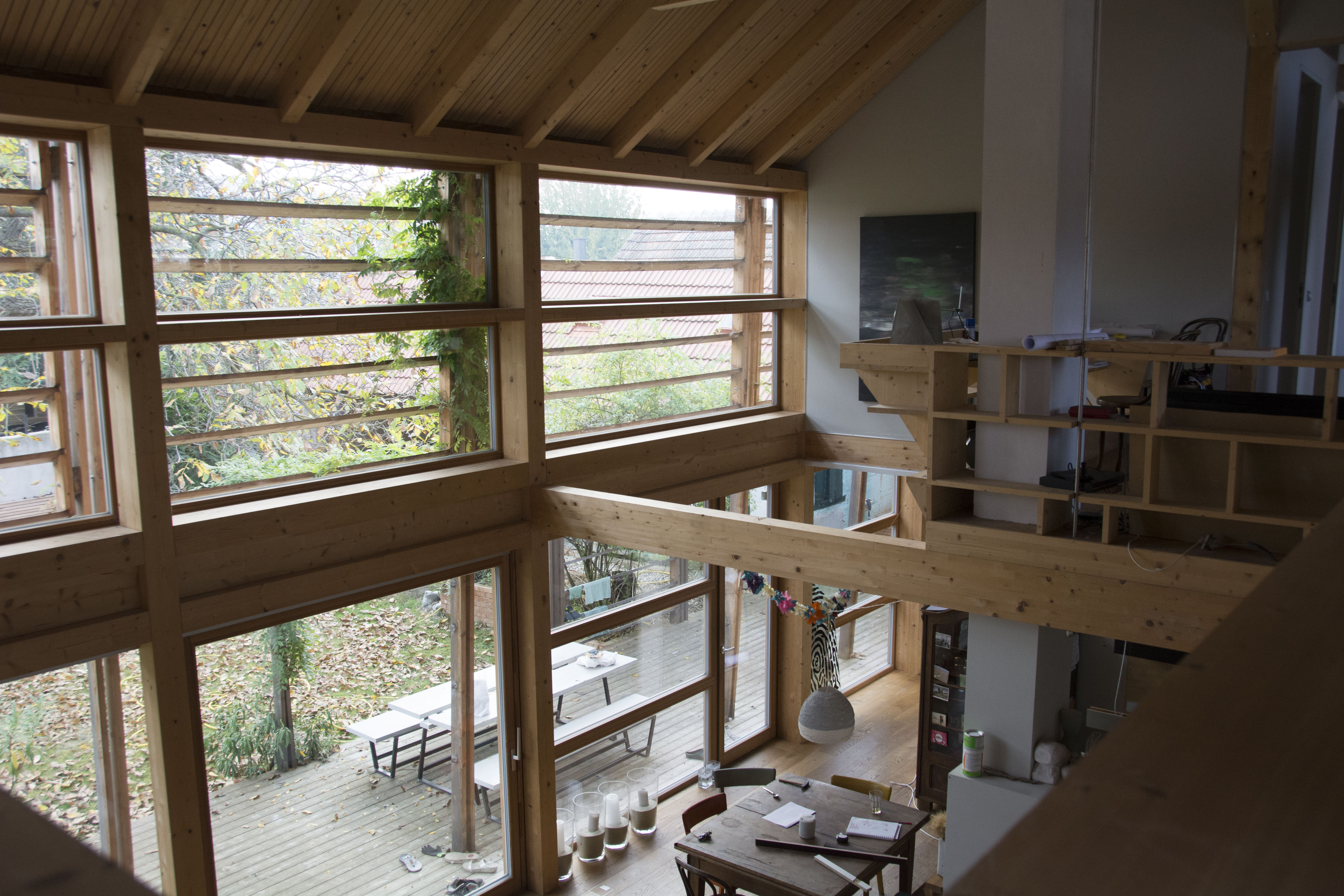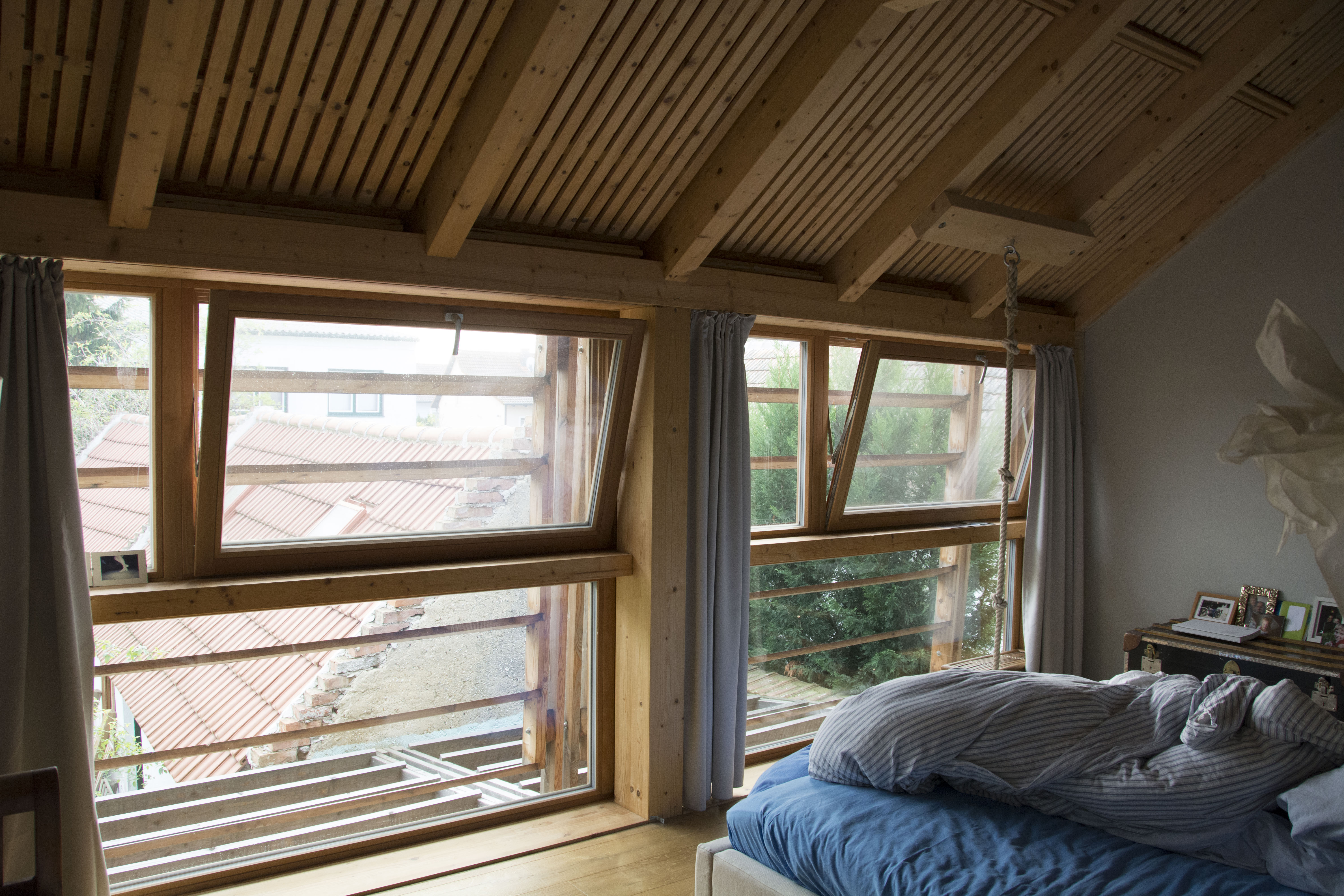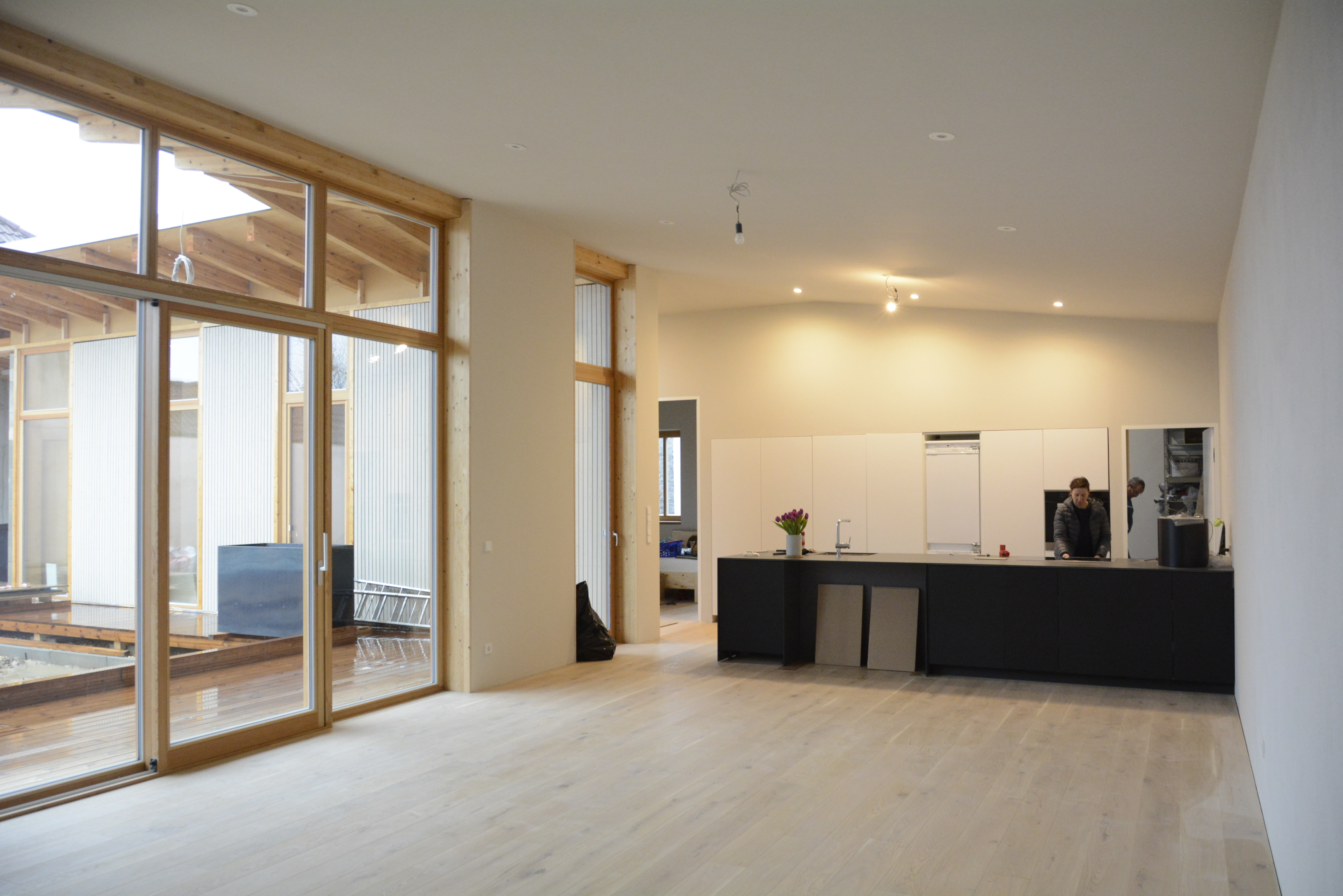 Ein Bestandshaus wird als neues Zuhause für einen Koch und Grillmeister und seine Familie in einen modernen Lebensraum transfomiert. Auch hier bildet ein Atrium das Zentrum des Geschehens im Aussenraum, wohin sich die Räume und das Leben orientierten. Ein zusätzlicher Dachaufbau im Westen des Hauses schenkt den zwei Söhnen einen neuen großzügigen Wohnraum. Der Hauptraum wird hingegen in seiner vollen Höhe genutzt. Der alte Dachstuhl bleibt mit sichtbaren Blaken sichtbar bestehen.