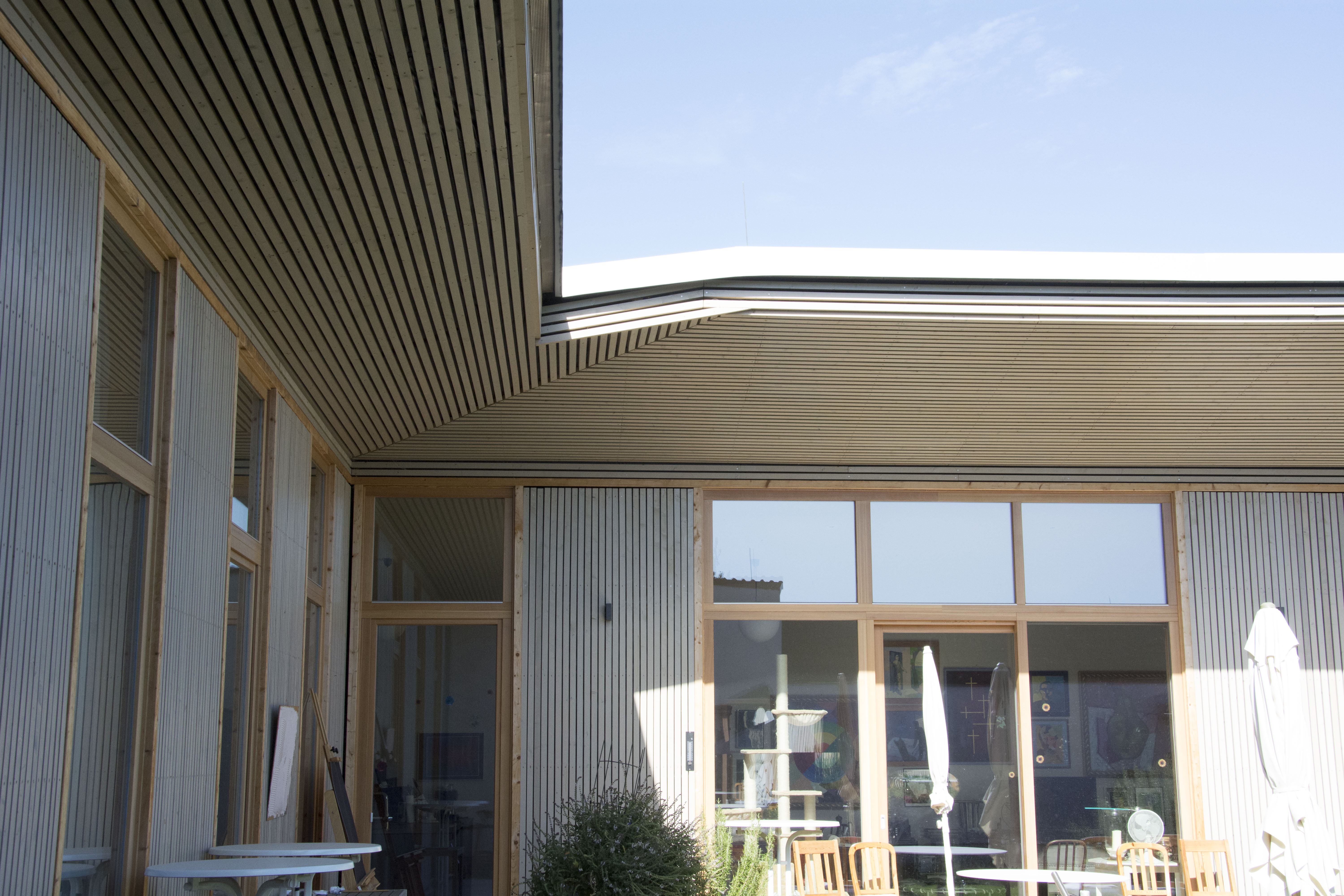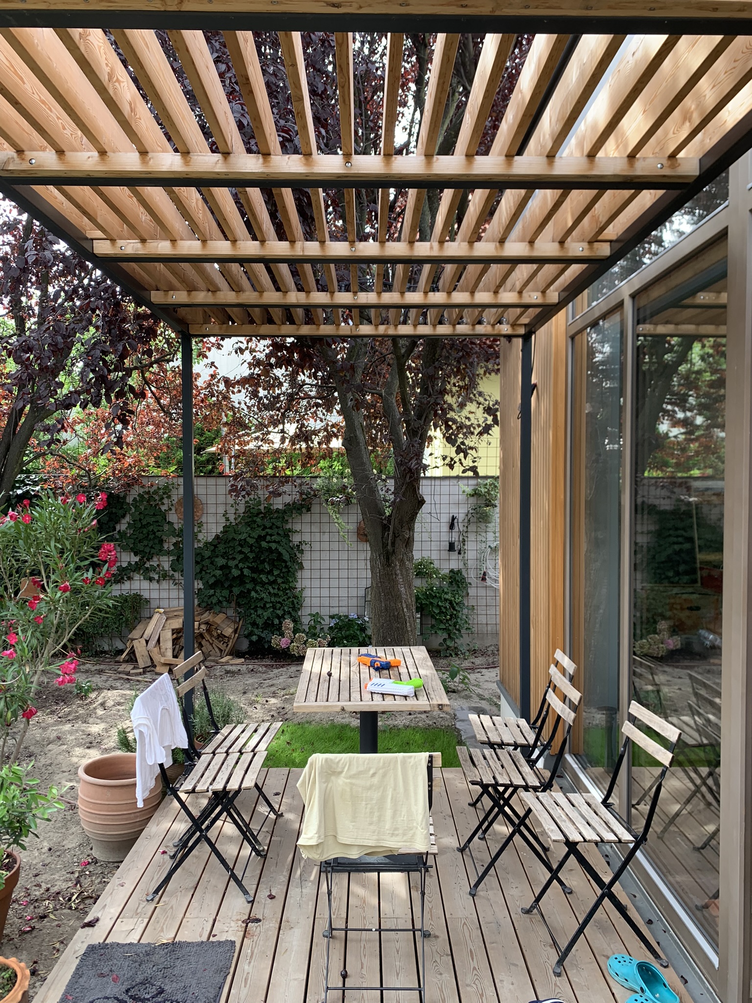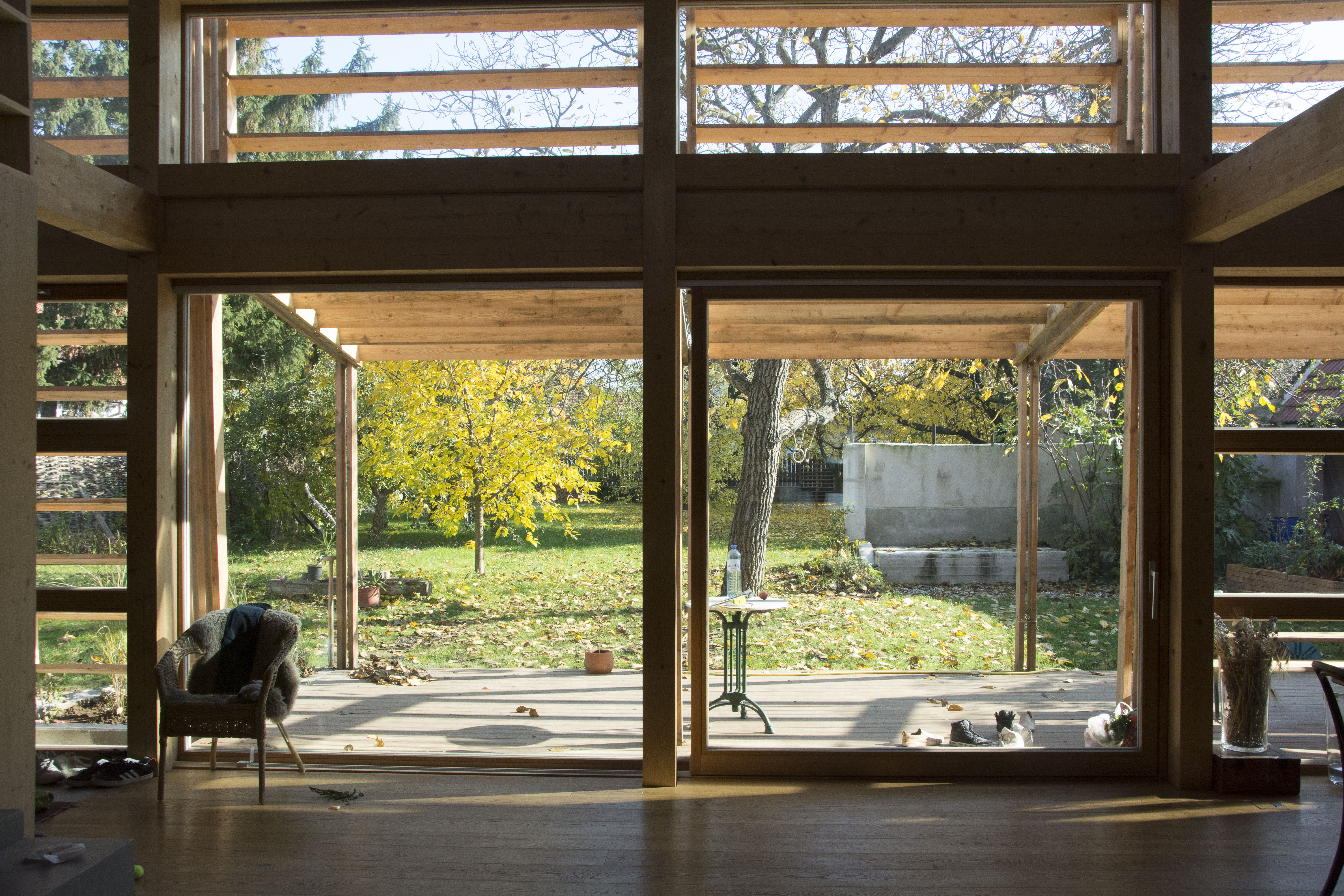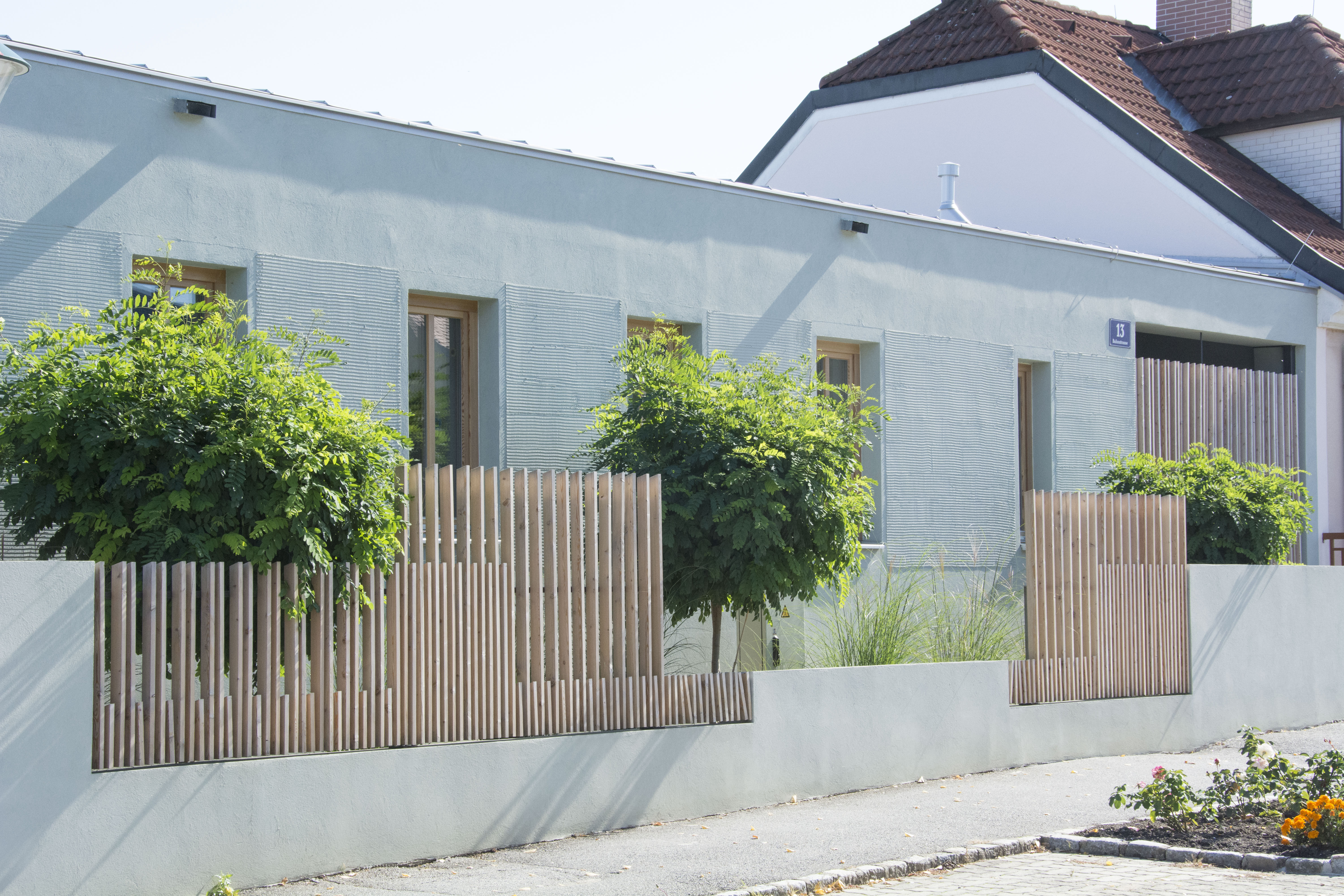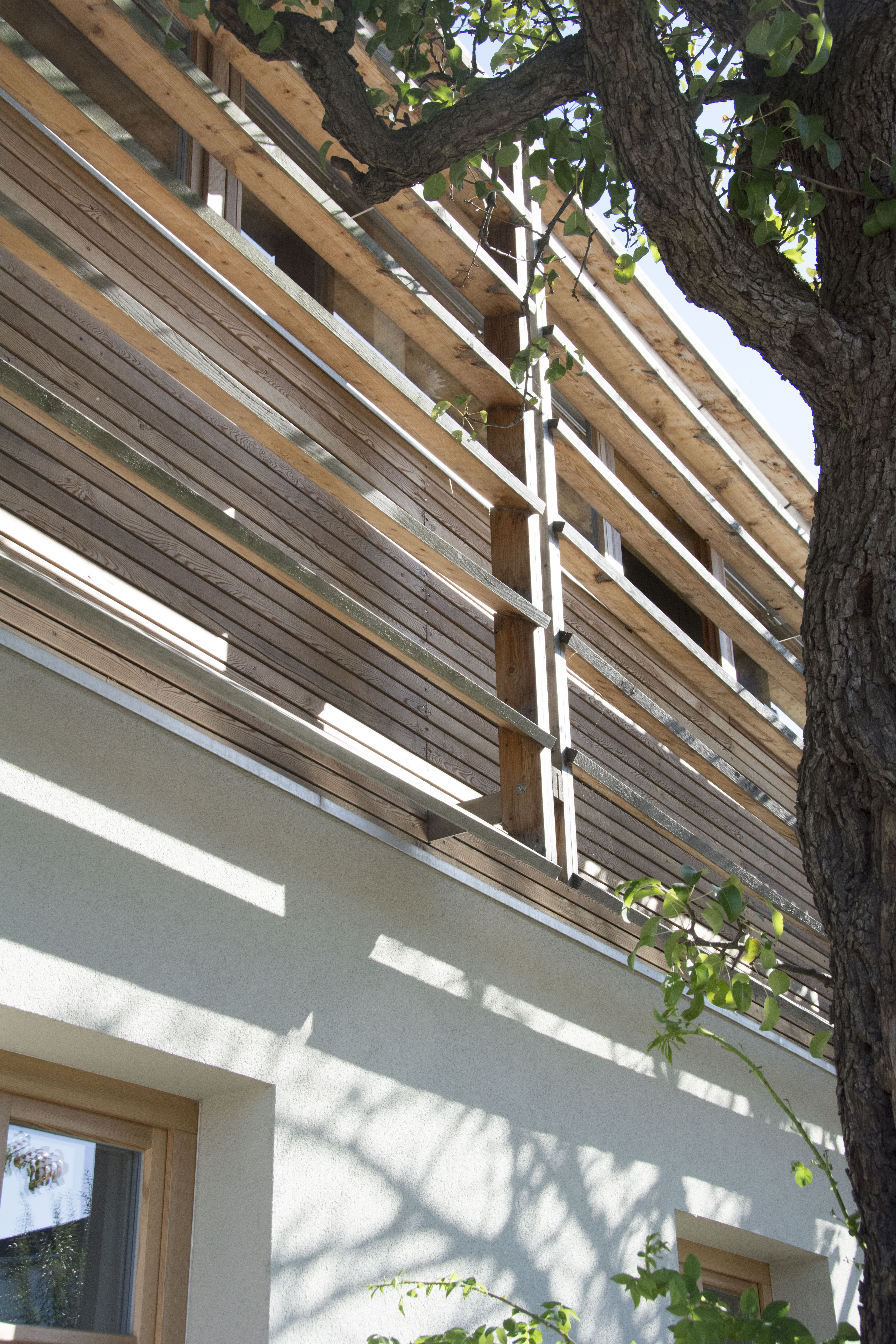 Die Holzschiebeelemente im Leichtbau ( Stahlkonstruktion d. Rahmen, beplankt mit naturbelassenen Holzlatten) bilden ein leicht transparentes wandelbares Wandelement, dass sich der Benutzung des Hauses anpasst und die Optik des Hauses je nach Verwendung verändert. Eine dritte schützende Haut bildet eine dichte Baumbepflanzung, welche nochmals Schatten spendet und als Wind und Sichtschutz dient.
