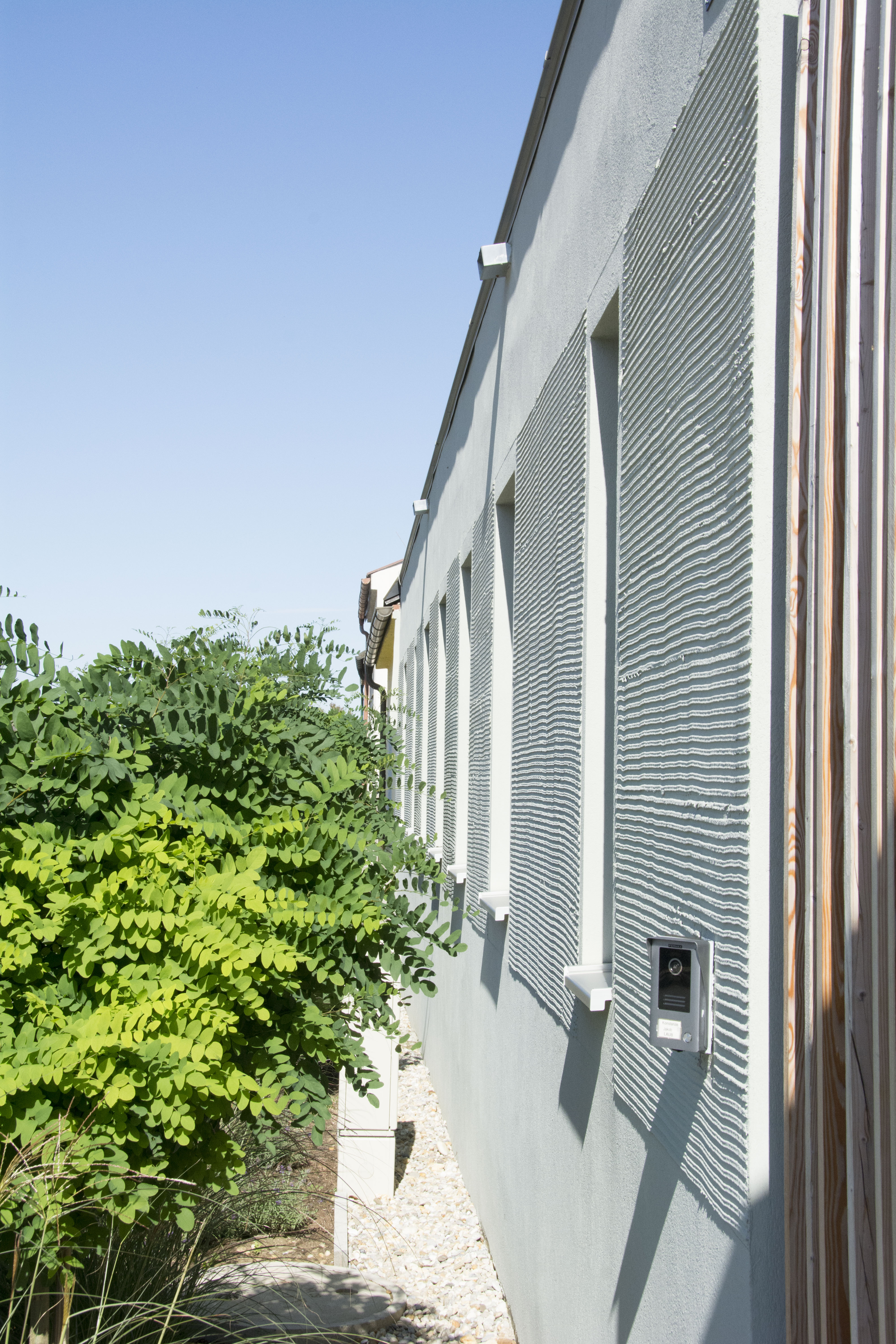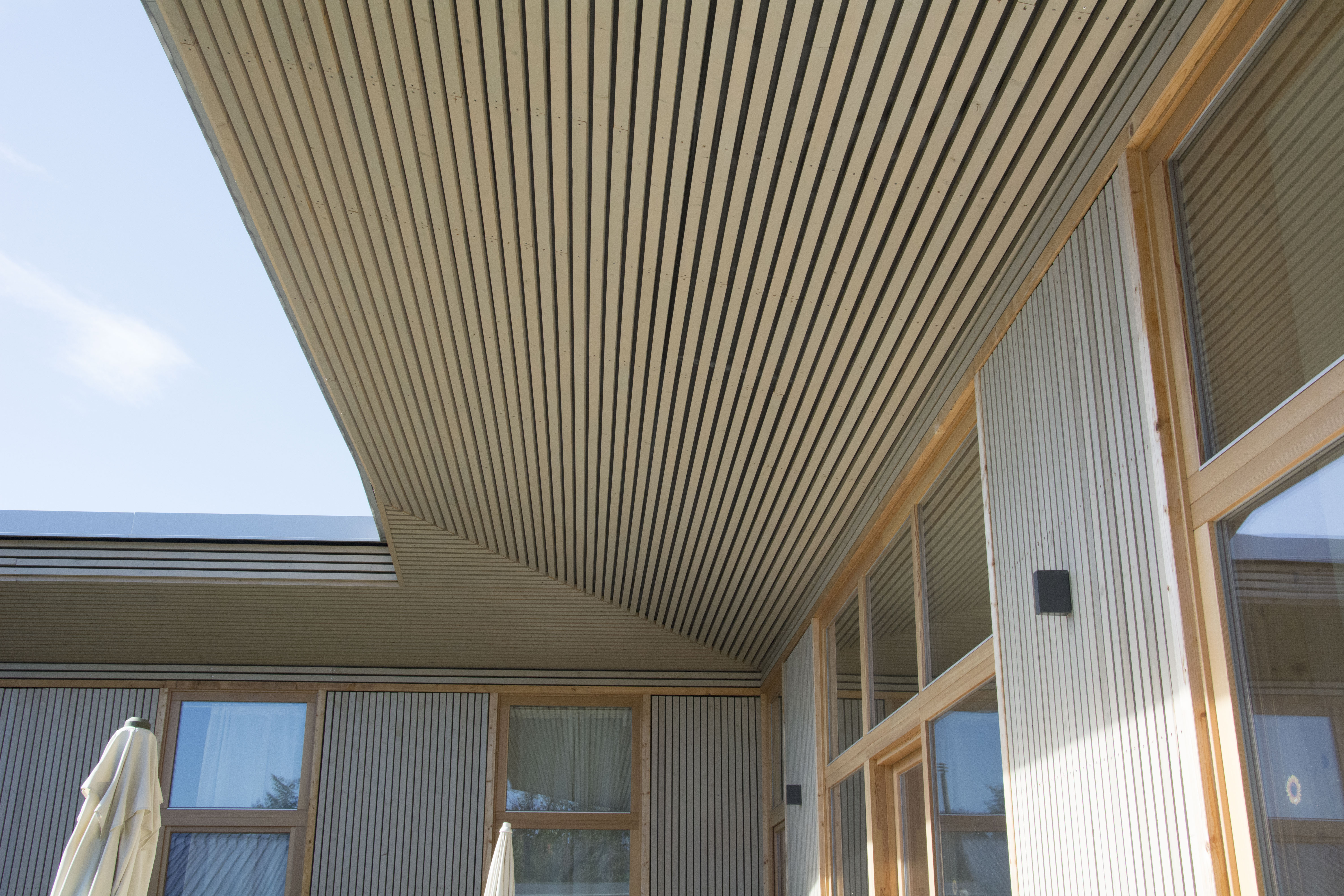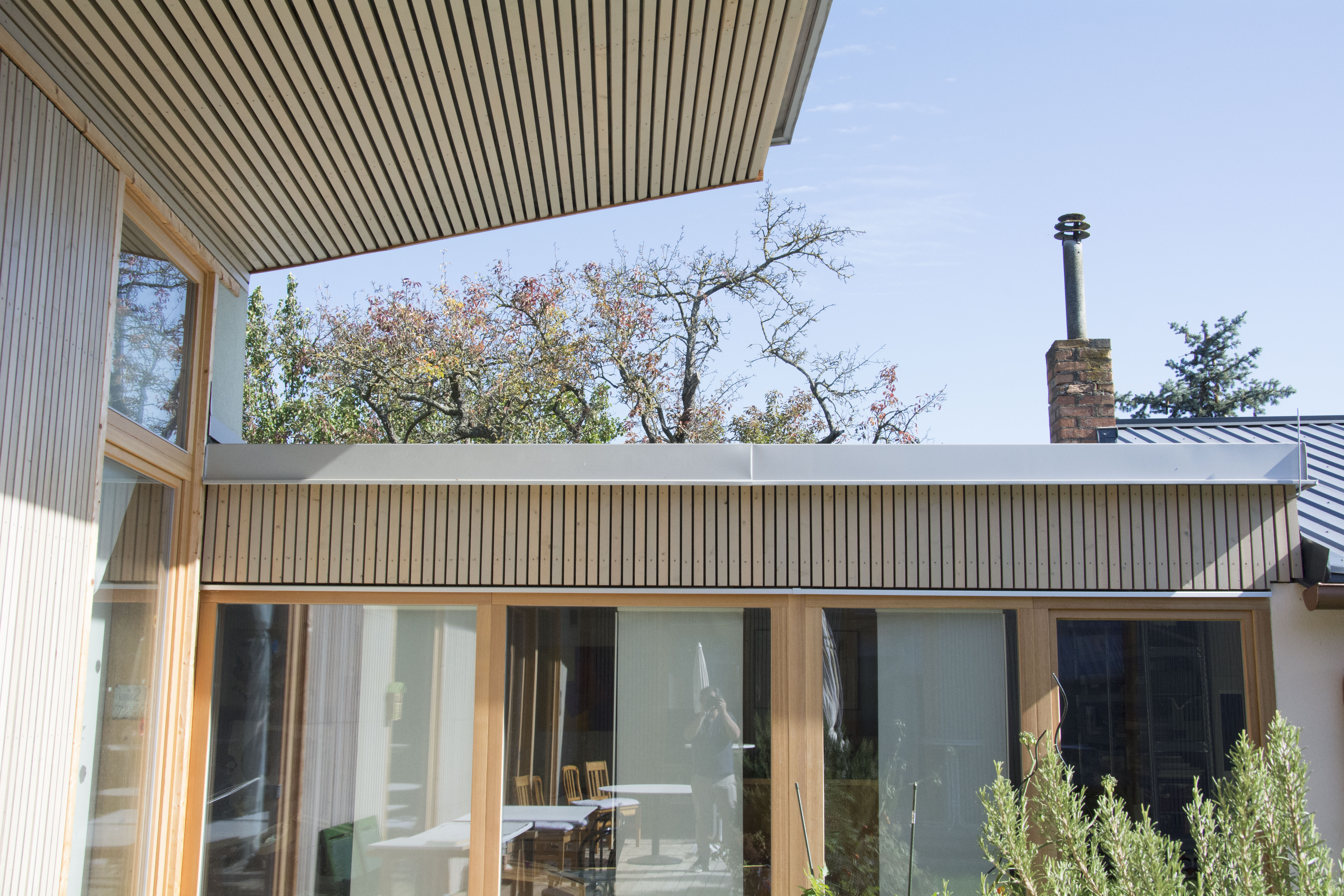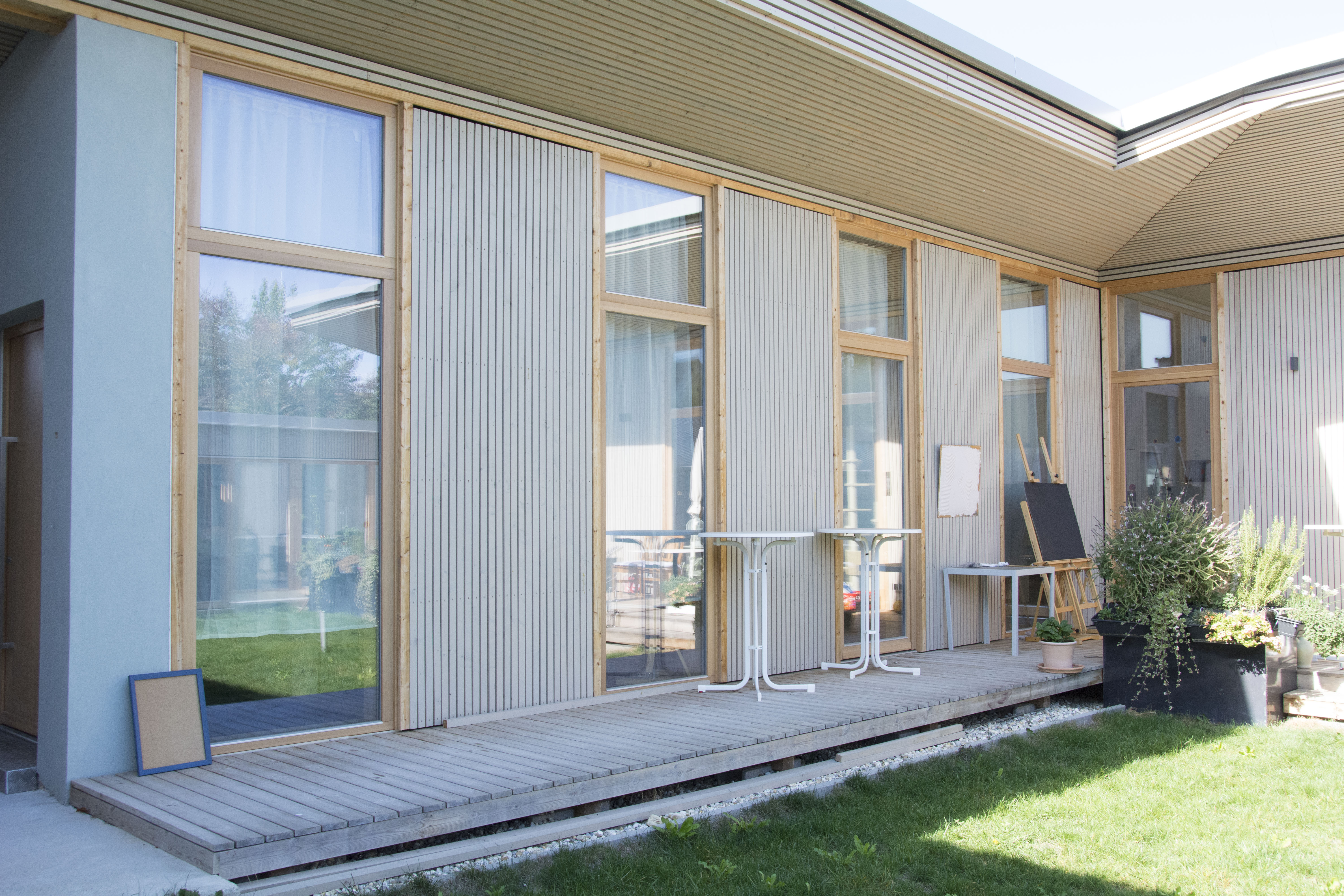 Die Holzschiebeelemente im Leichtbau ( Stahlkonstruktion d. Rahmen, beplankt mit naturbelassenen Holzlatten) bilden ein leicht transparentes wandelbares Wandelement, dass sich der Benutzung des Hauses anpasst und die Optik des Hauses je nach Verwendung verändert. Eine dritte schützende Haut bildet eine dichte Baumbepflanzung, welche nochmals Schatten spendet und als Wind und Sichtschutz dient.