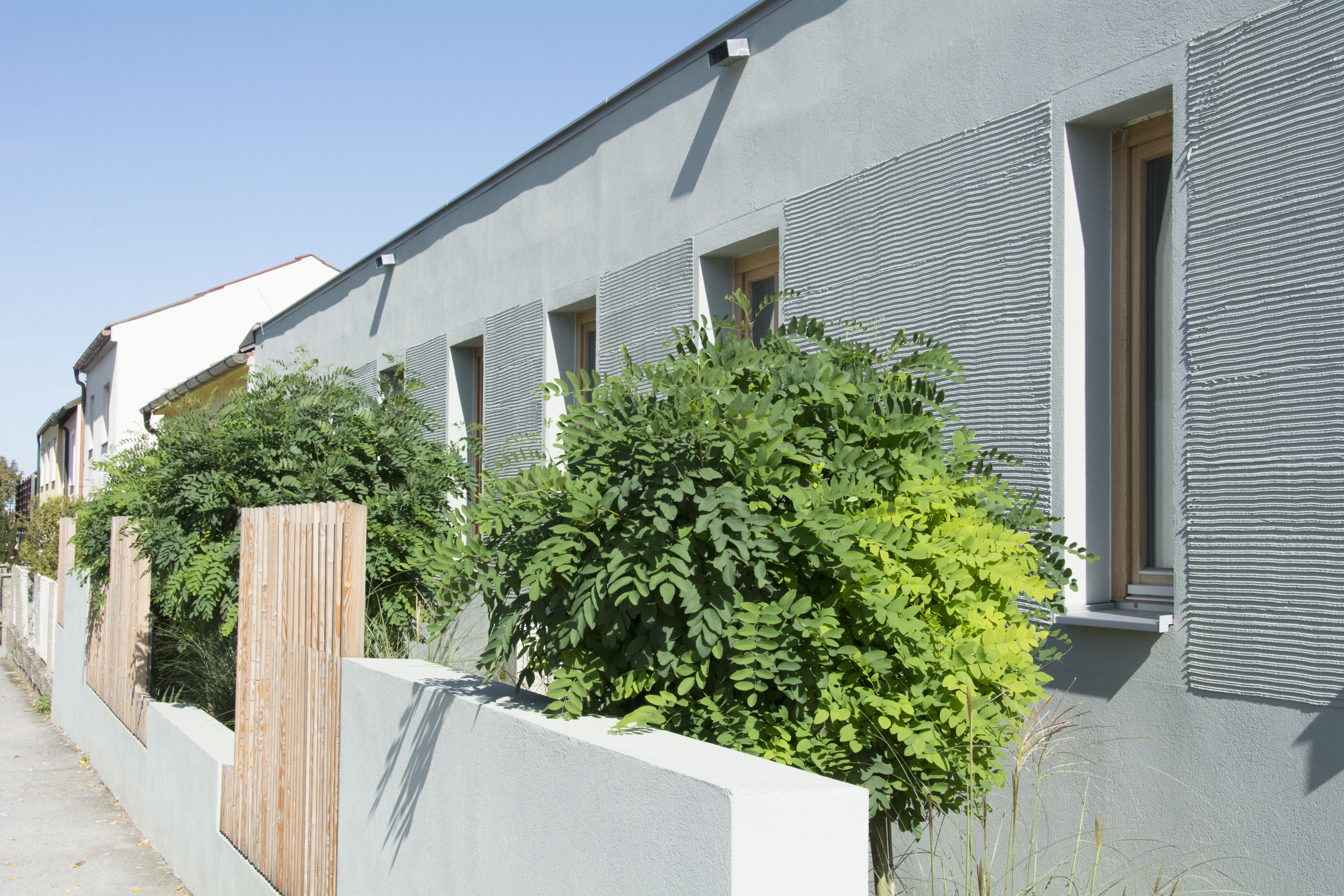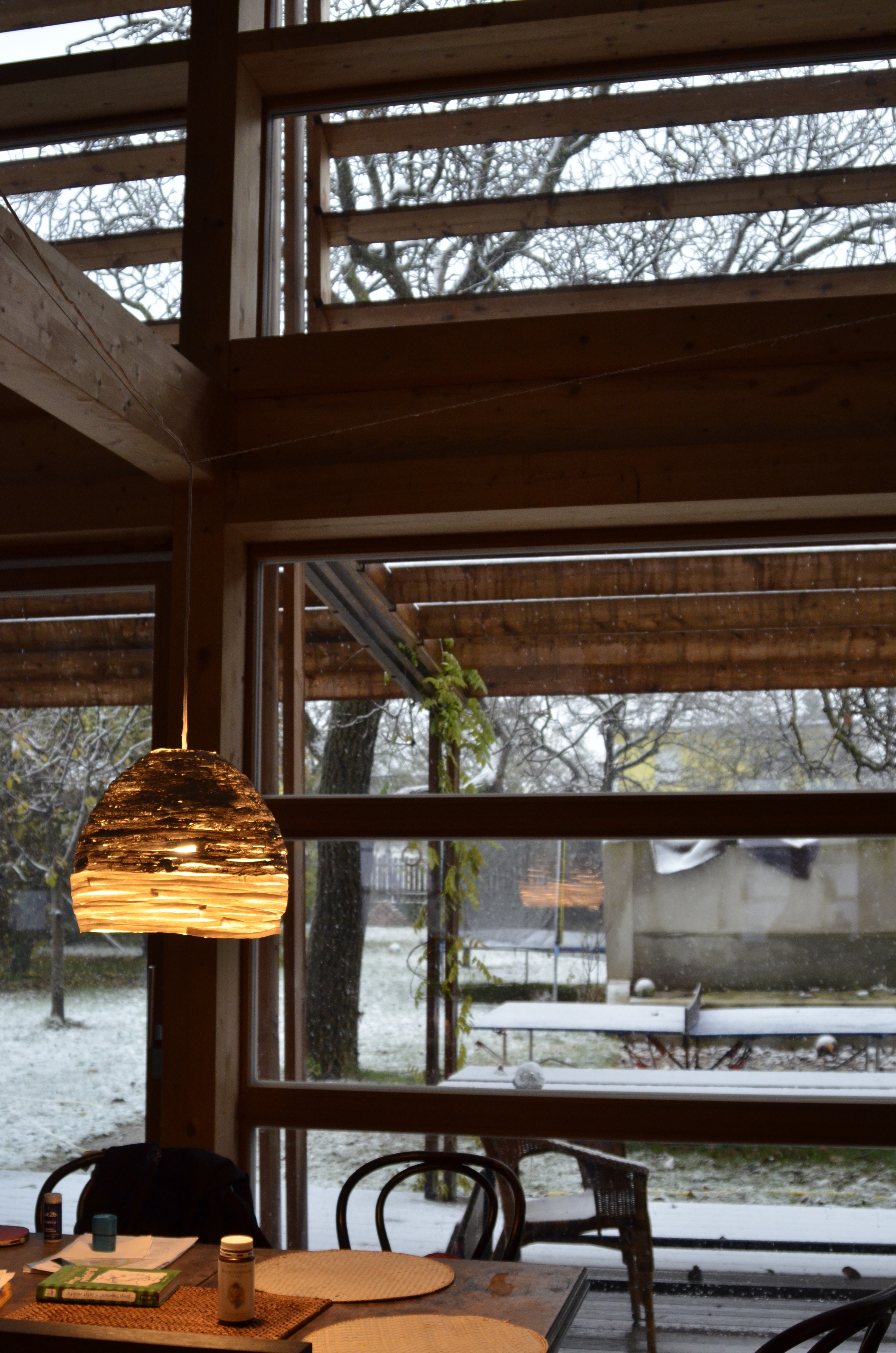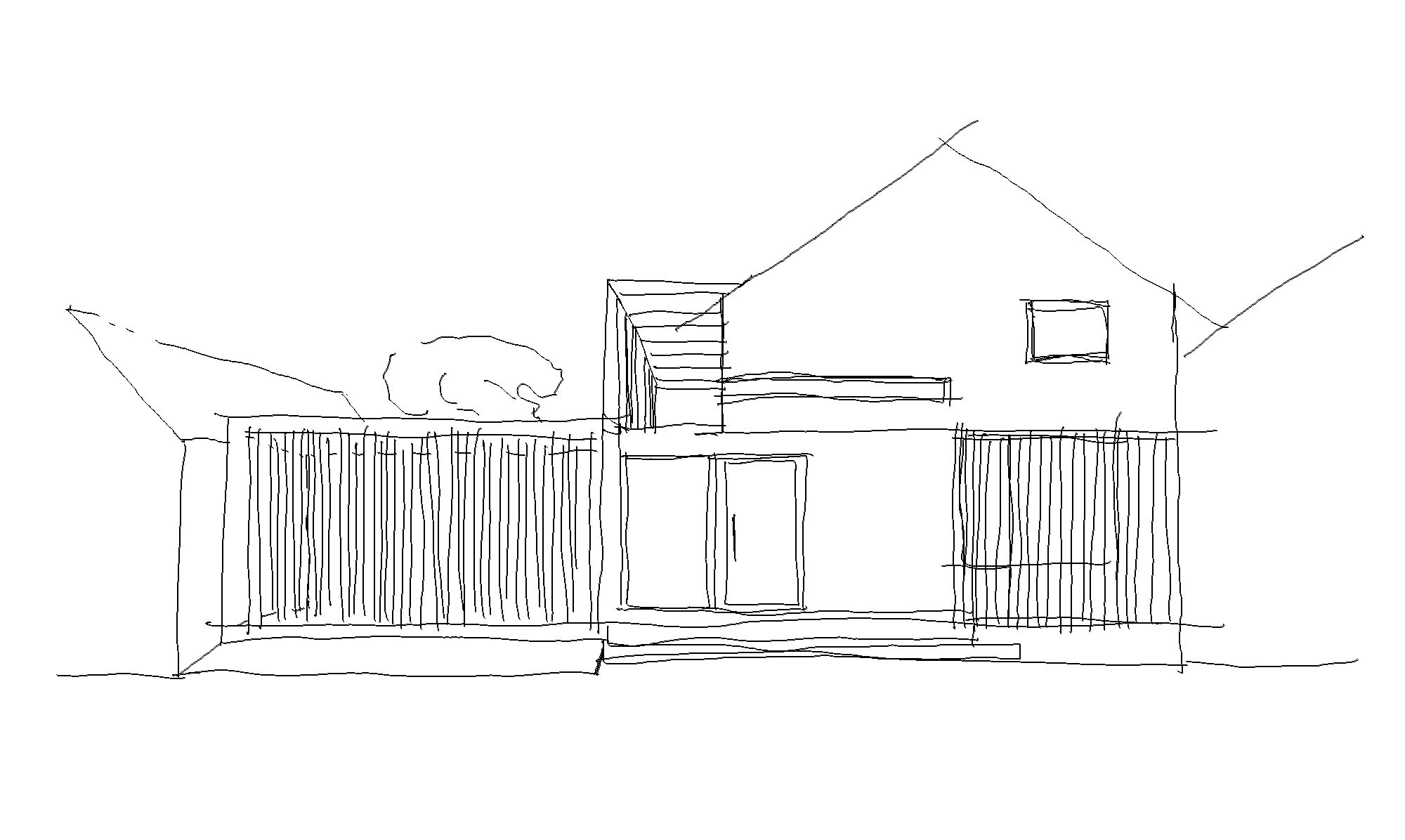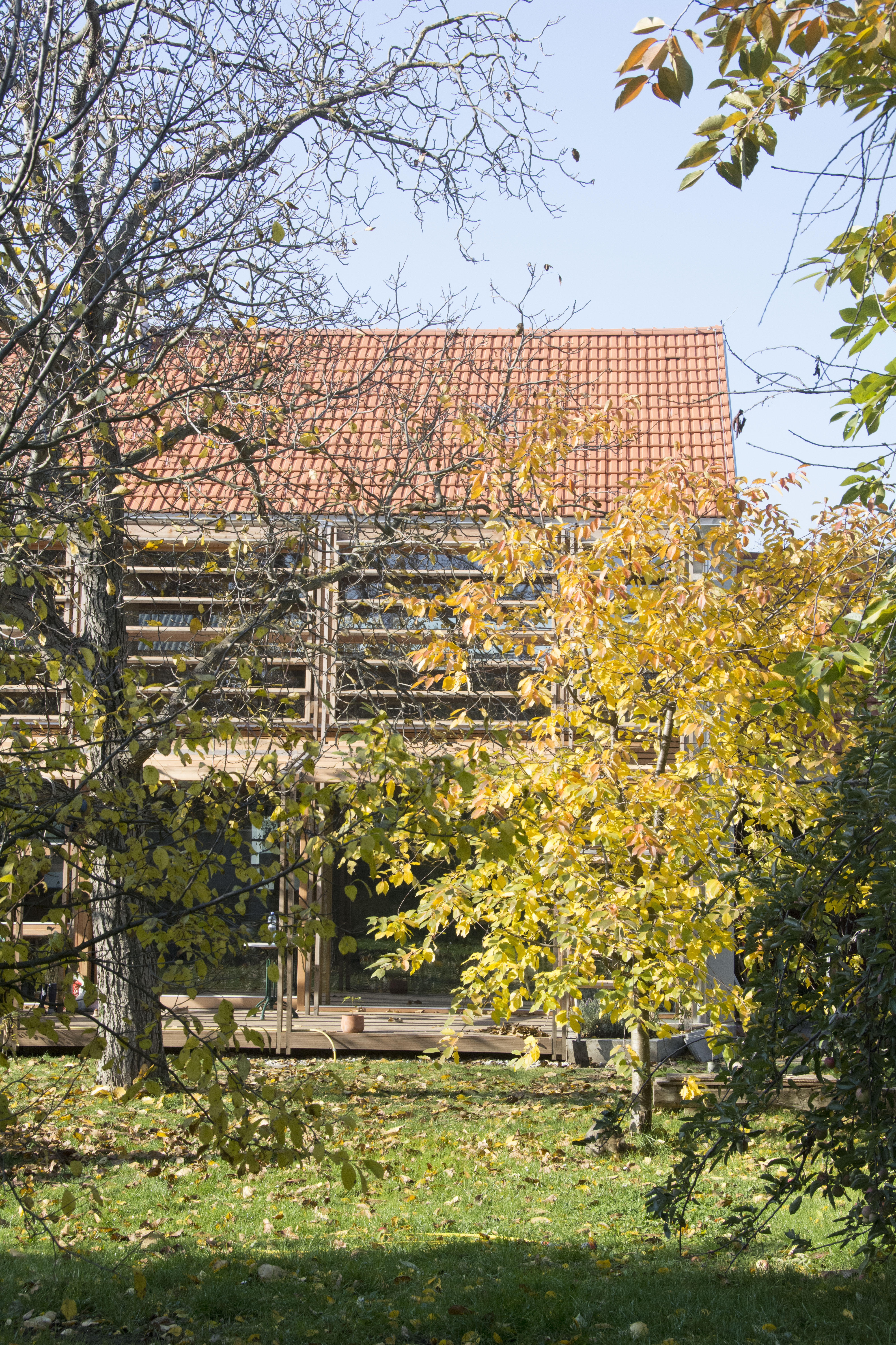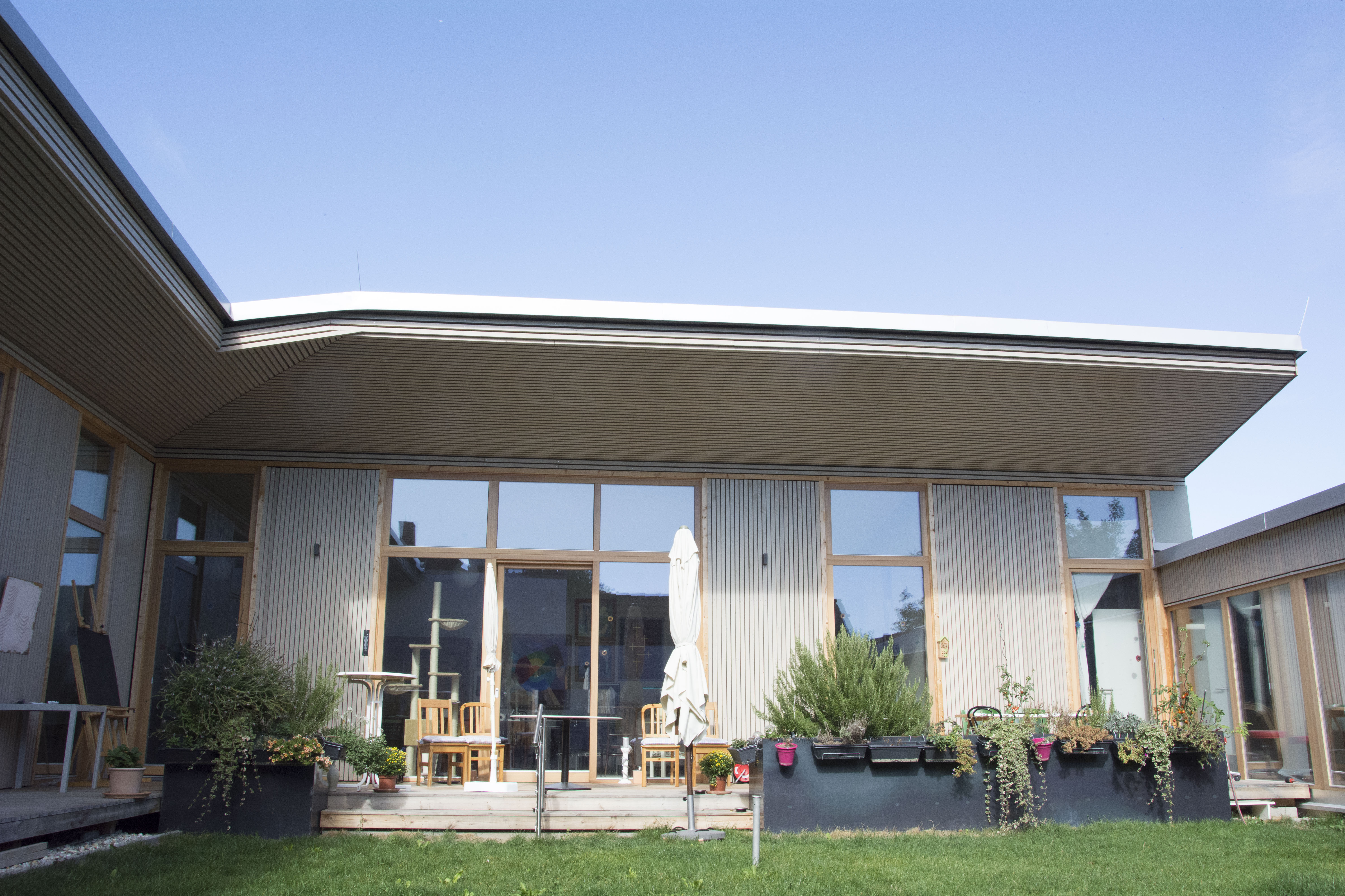 Die Holzschiebeelemente im Leichtbau ( Stahlkonstruktion d. Rahmen, beplankt mit naturbelassenen Holzlatten) bilden ein leicht transparentes wandelbares Wandelement, dass sich der Benutzung des Hauses anpasst und die Optik des Hauses je nach Verwendung verändert. Eine dritte schützende Haut bildet eine dichte Baumbepflanzung, welche nochmals Schatten spendet und als Wind und Sichtschutz dient.