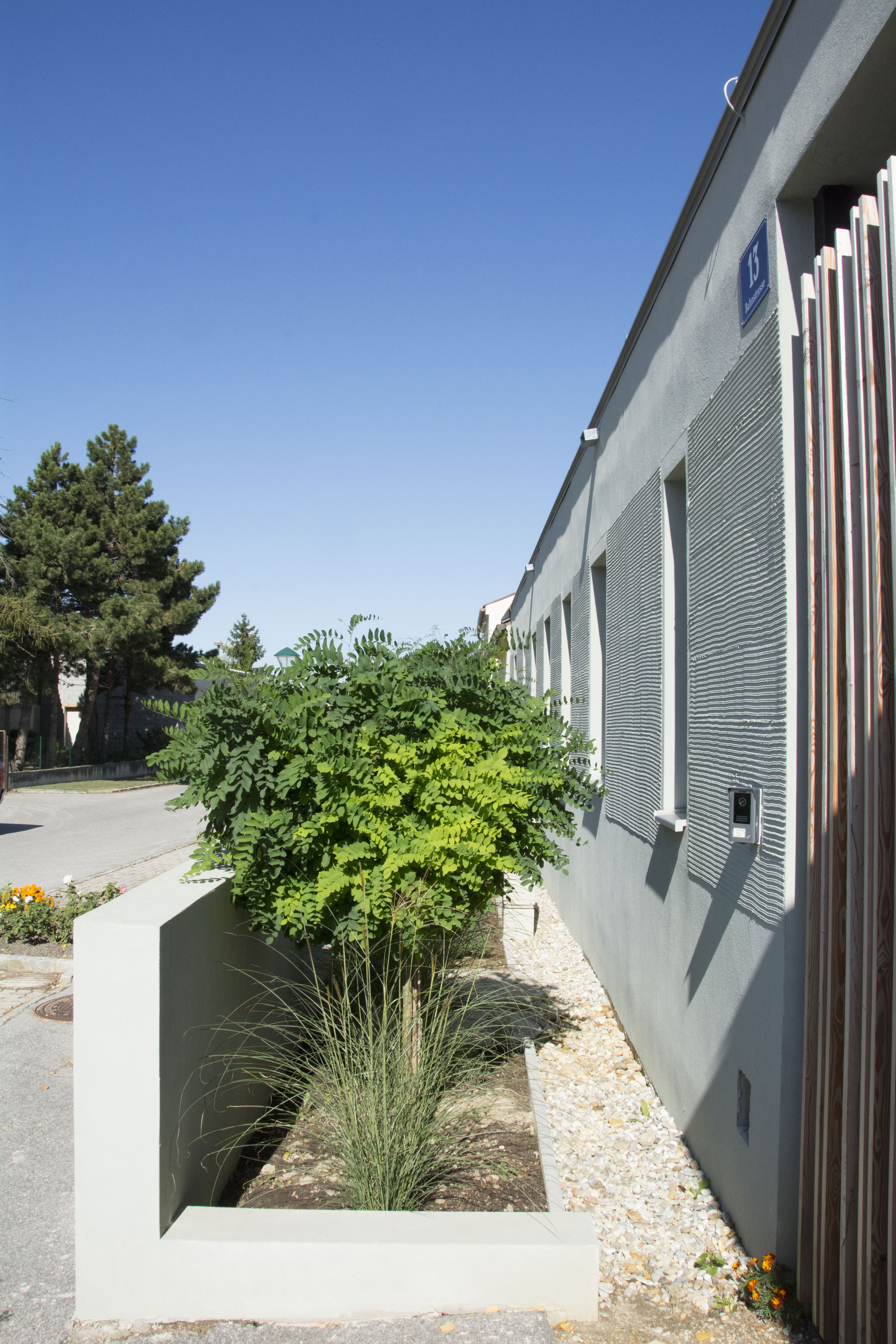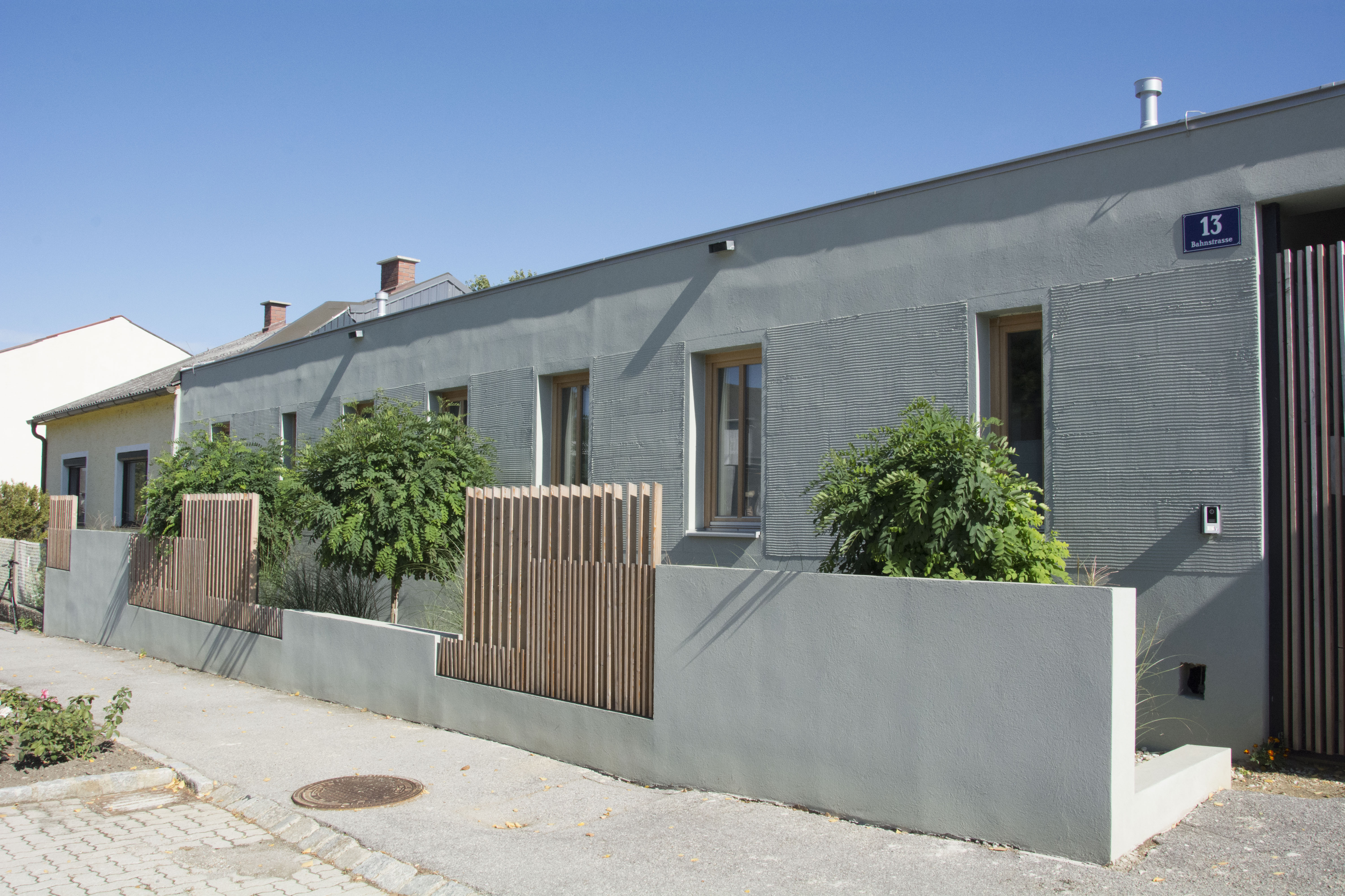 Die Architektur greift dabei typisch pannonischen Baukulturelementen auf, wie auch das zeitlose Prinzip der römischen Atriumhäuser. Das Zentrum des Wohnhause bildet in seiner Mitte ein zum Himmel geöffneter zentraler Raum. Damit jedoch eine Privatheit entstehen bleibt, kann das Atrium gegen die Straße hin geschlossen werden. Im Sommer wird es auf der Südseite zu heiß, und darum kann man auch auf die Sonnenterrase im N/O ausweichen, die Schutz vor der intensiven Sonneneinstrahlung gibt.