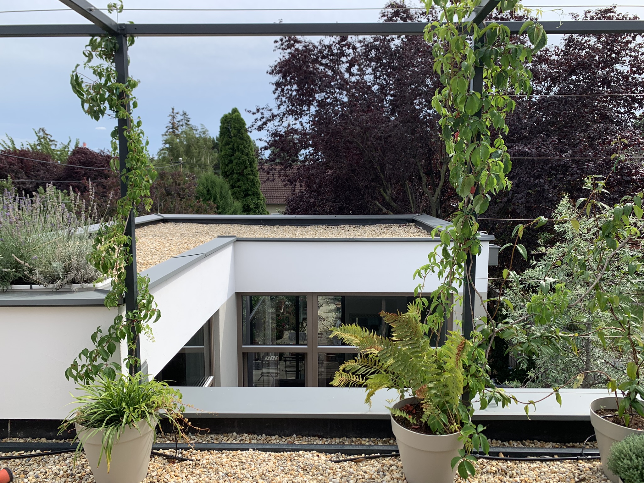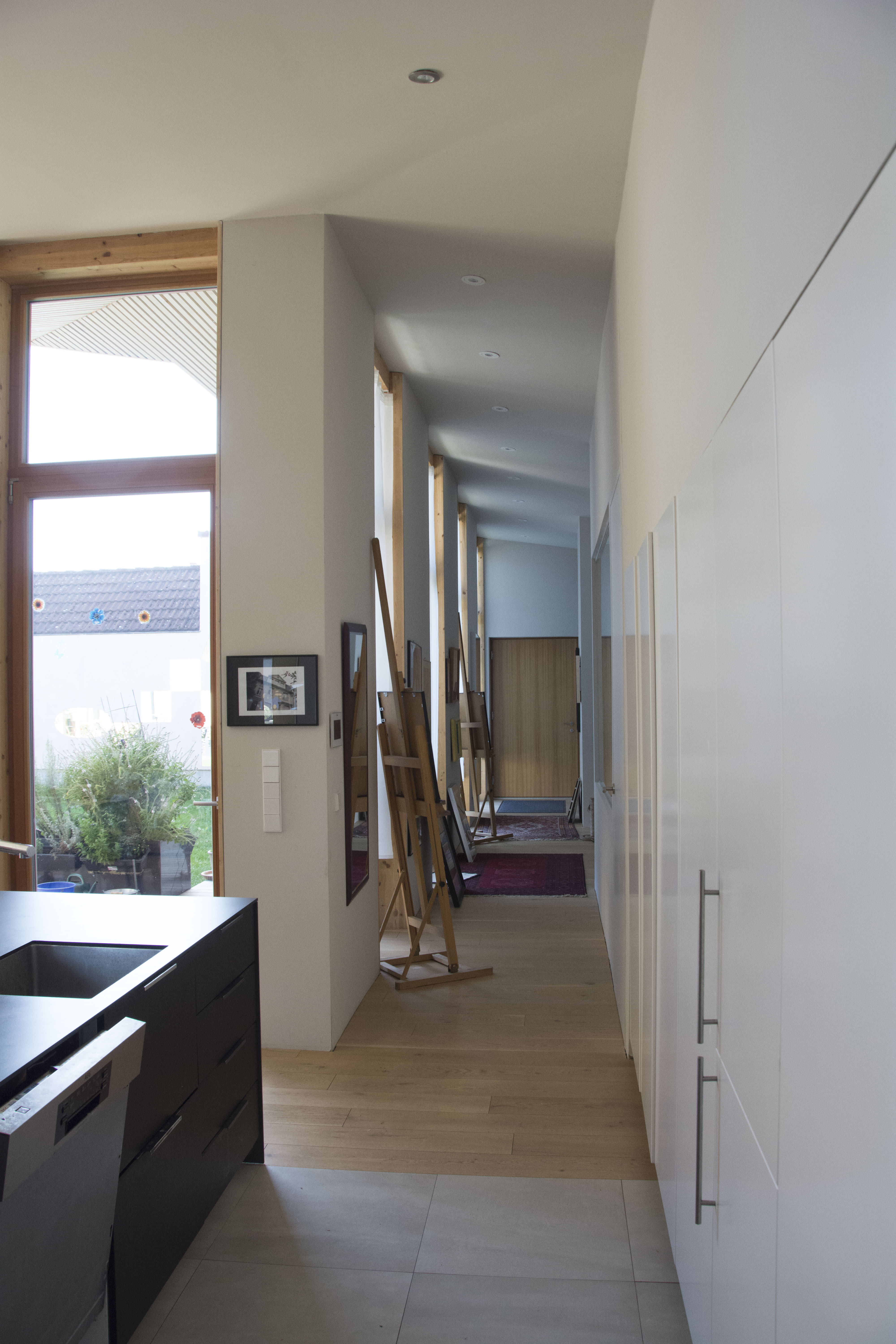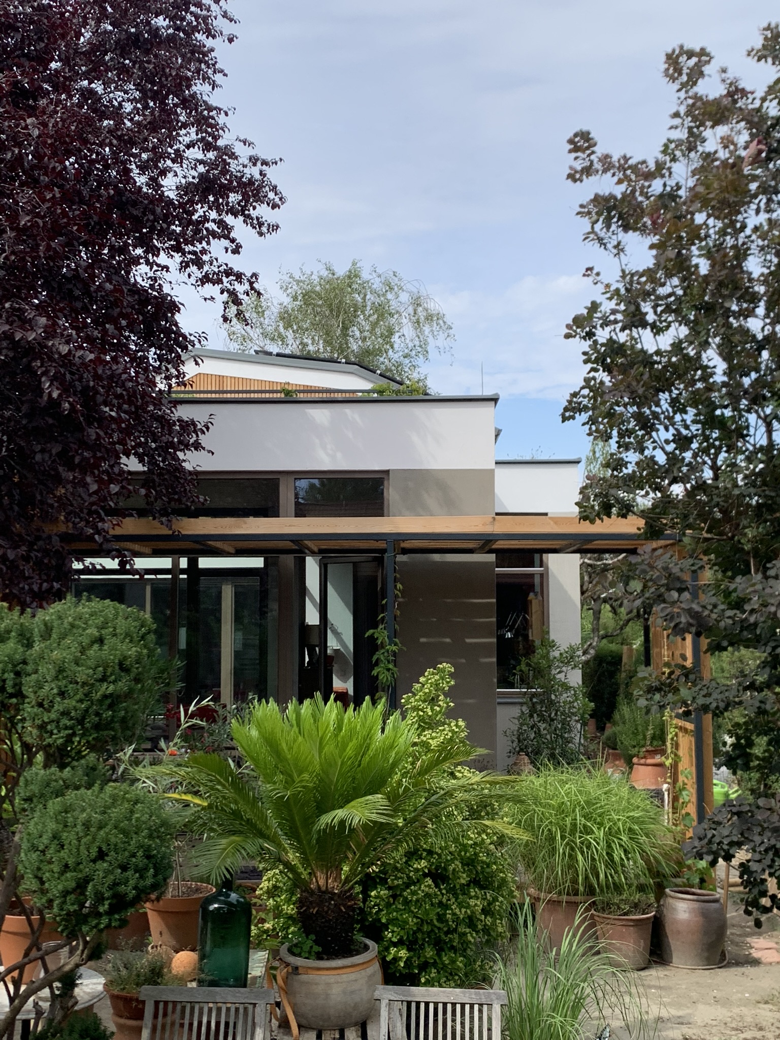 Es ist ein ebenerdiges Haus für ein älteres Ehepaar mit angeschlossenem Atelier. Das Zentrum der gesamten Wohneinheit bildet ein ca. 10 x 10m kleiner Atriumgarten, um den sich das ganze Haus geschmeidig anlehnt. Das ganze Leben spielt sich im Inneren des Grundstückes ab.