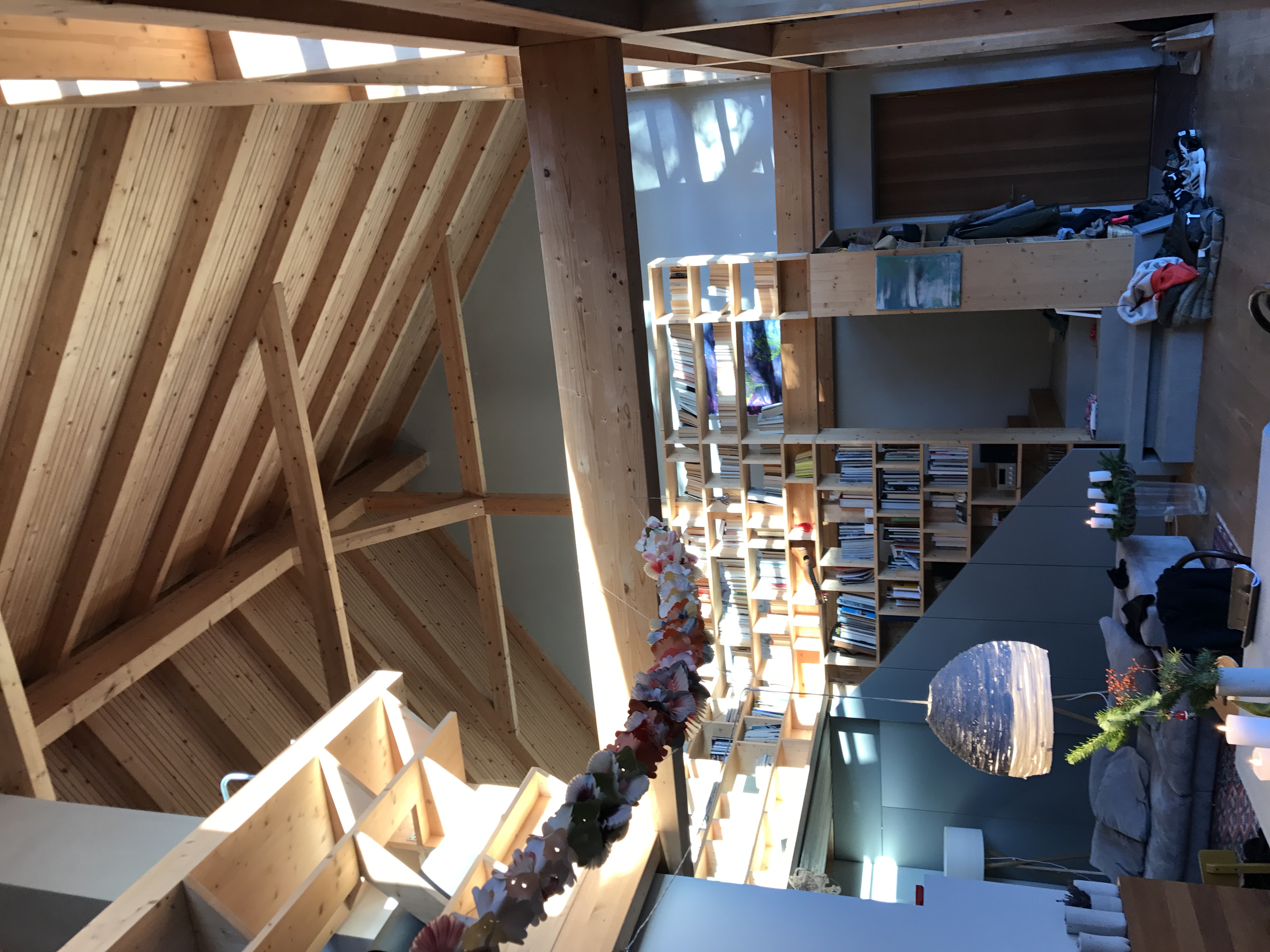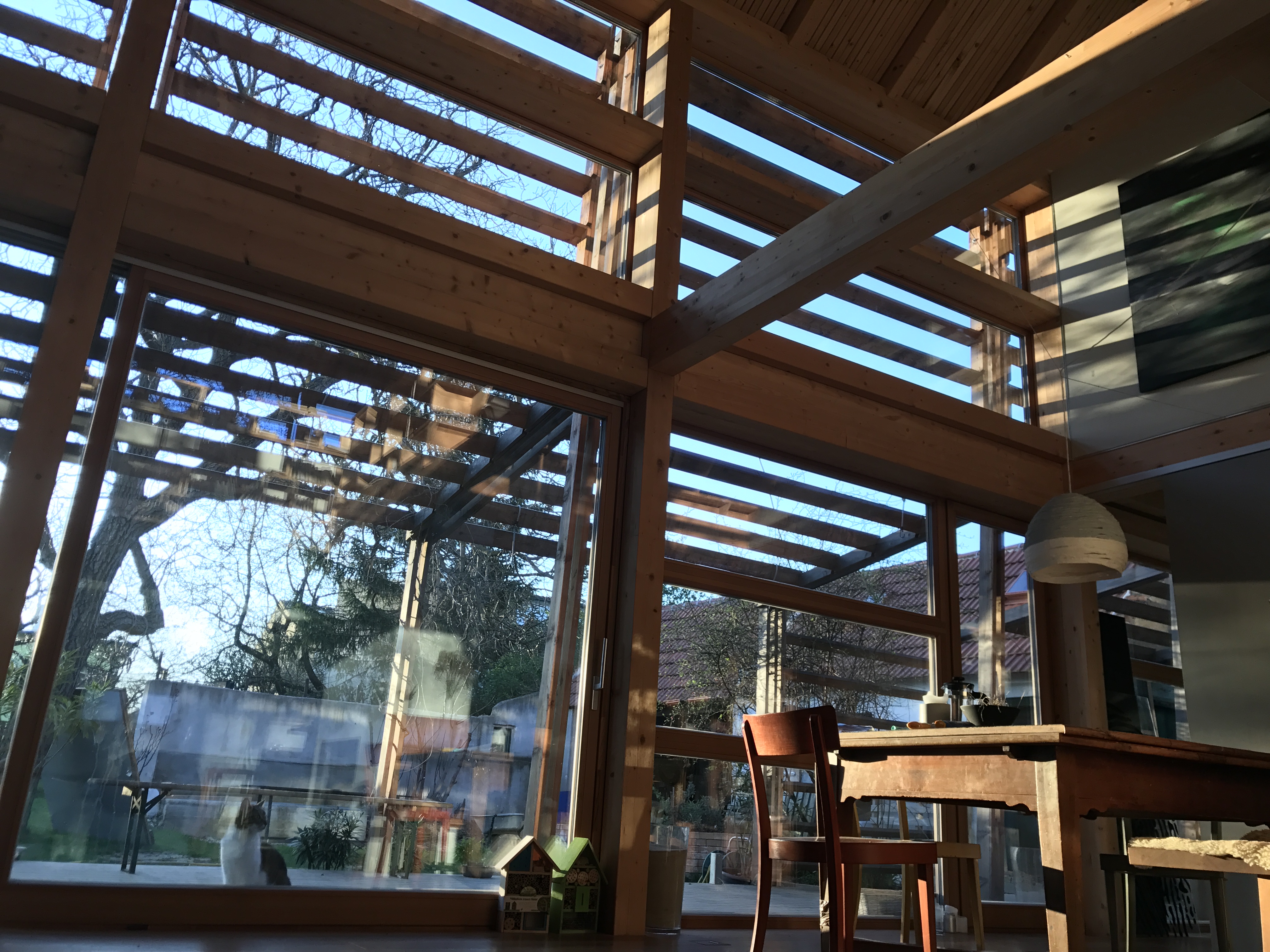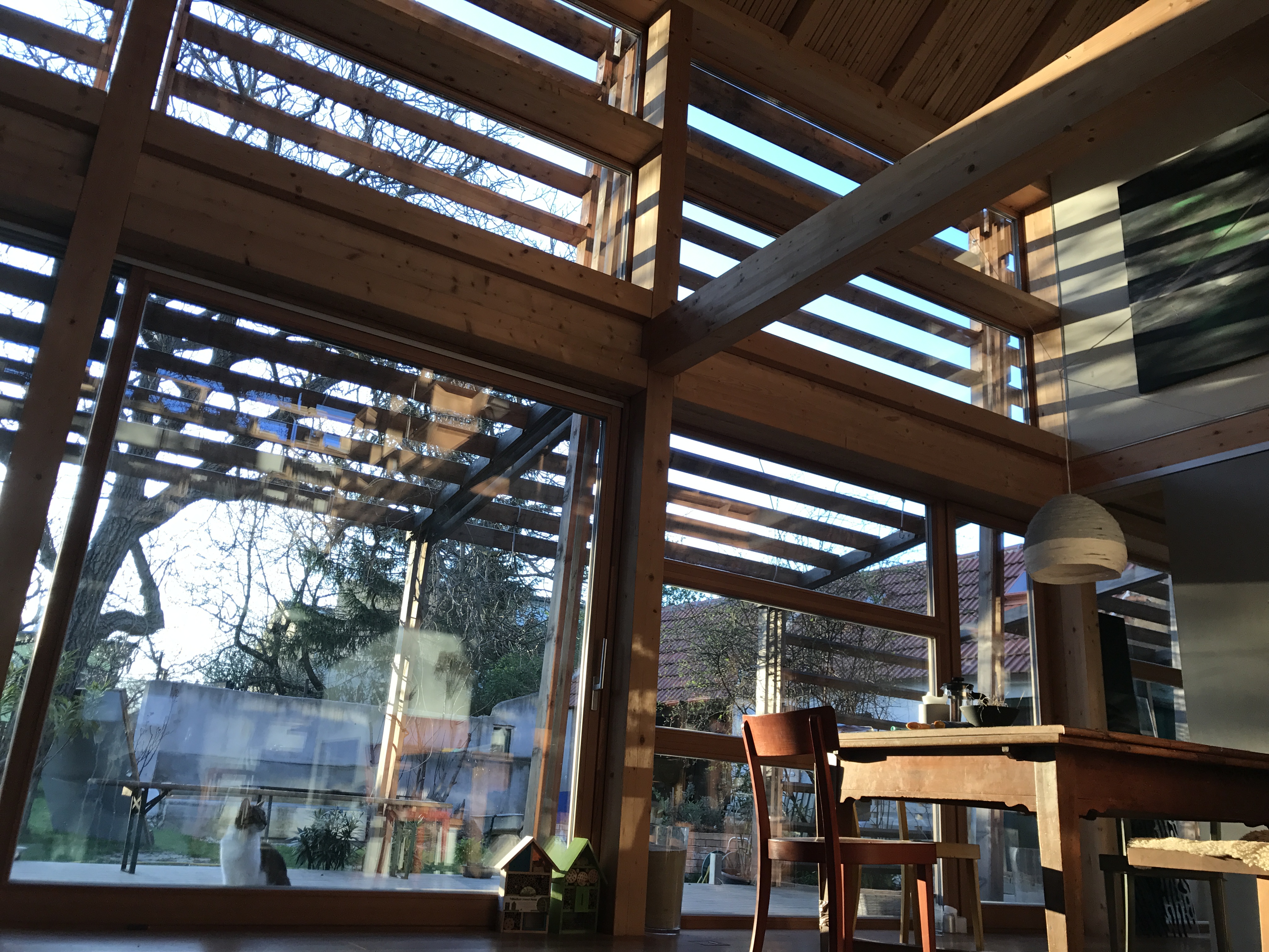 Im Sommer sind alle Räume durch intelligenten Sonnenschutz und auskragende Bauteile ausreichend beschattet. Darüber “schwebt” die 3.Ebene mit Home-Office, Bad, Wellness und Schlafräumen der Eltern. Das gesamte Haus ist nahezu Energieautark, Alle Baustoffe sind öklogisch und recylebar, viel Holz, Ziegel 3-Scheiben Isolierglas, natüreliche Dämmung. Heizung, Kühlung, Wasser, Strom usw wird mit Tiefenbohrung, PV anlage und passiver Energiegewinnung über gesteuerte Sonneneinstrahlung erzeugt.