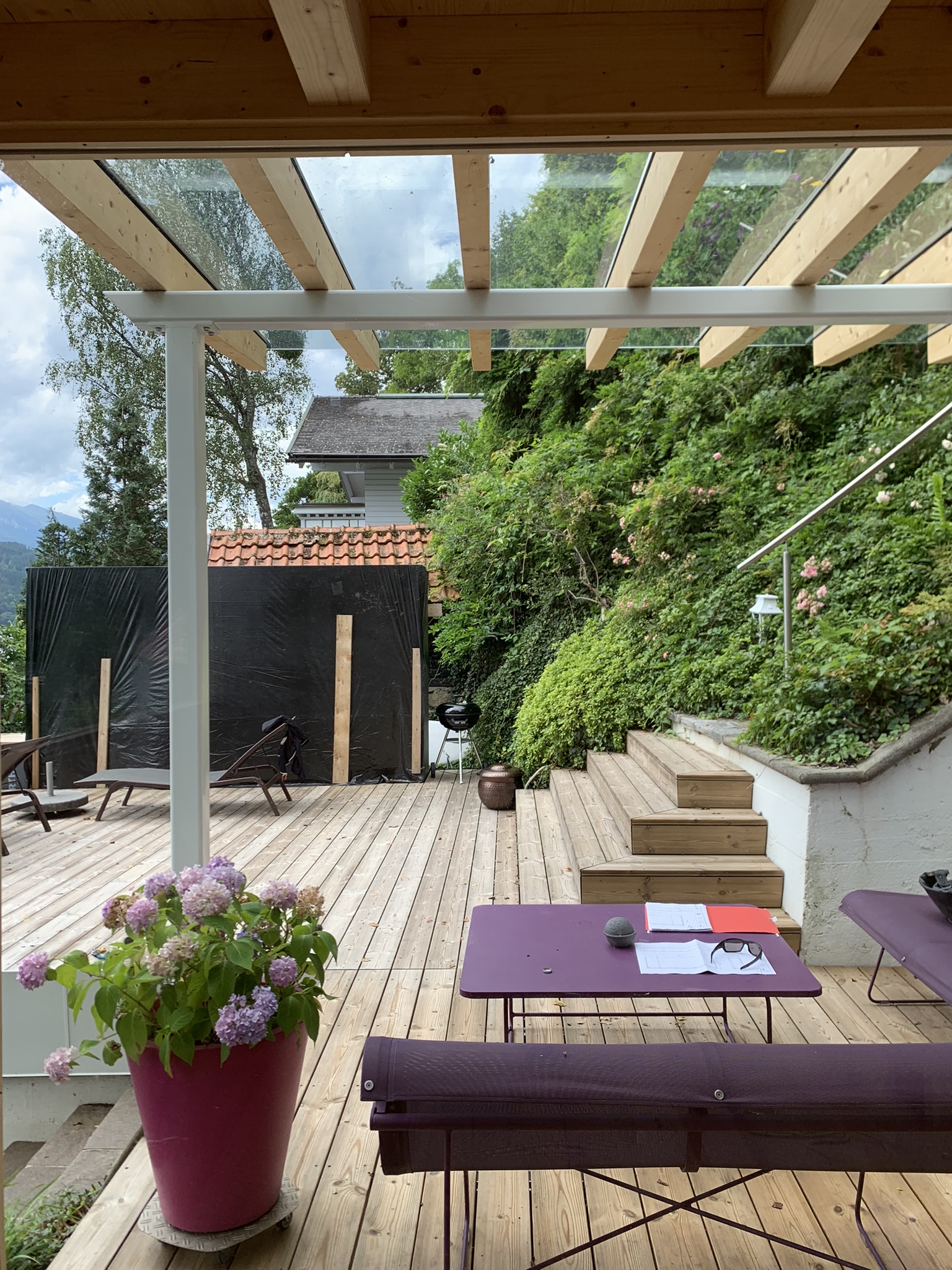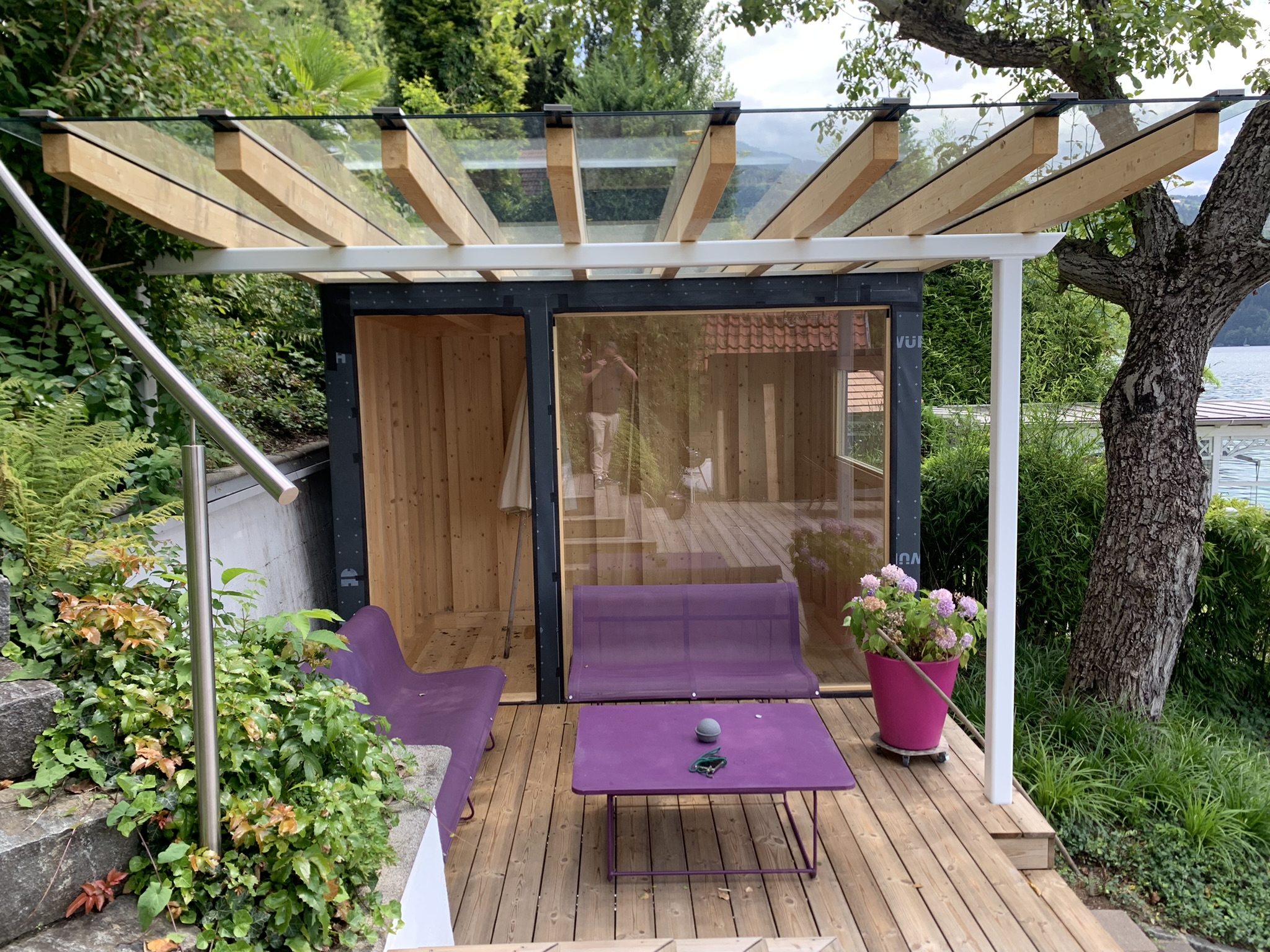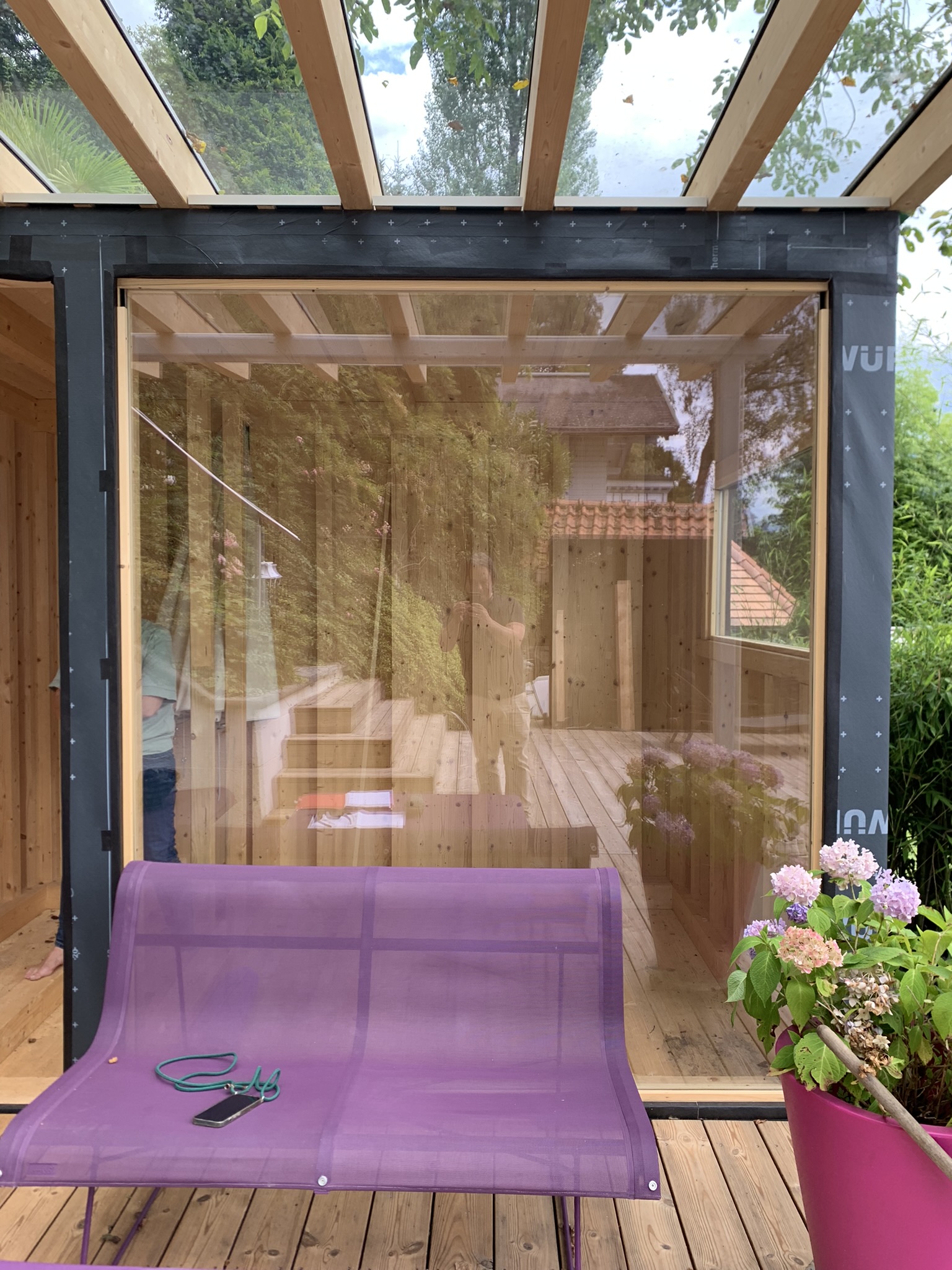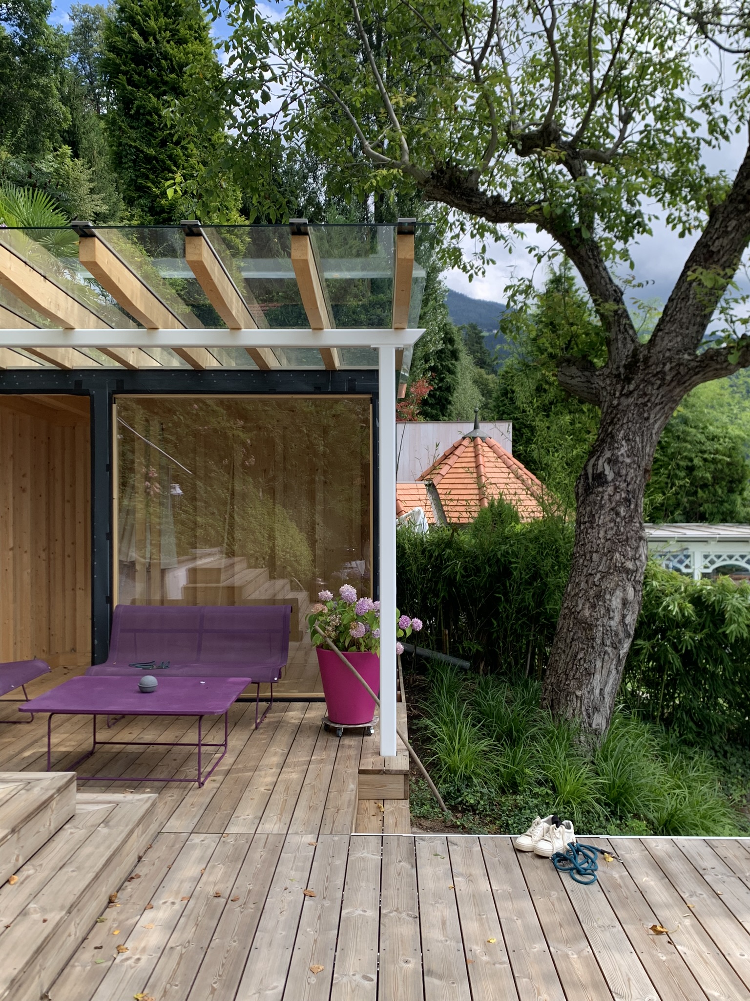 Zwischen den Schiebetoren und der transparenten Haut spannt sich ein 1,40 m breites überdachtes Holzdeck (Anlehnung an Schiffsdeck) auf. Es ist eine Erweiterung des Innenraumes und ist von alllen Wohnräumen direkt zugänglich.