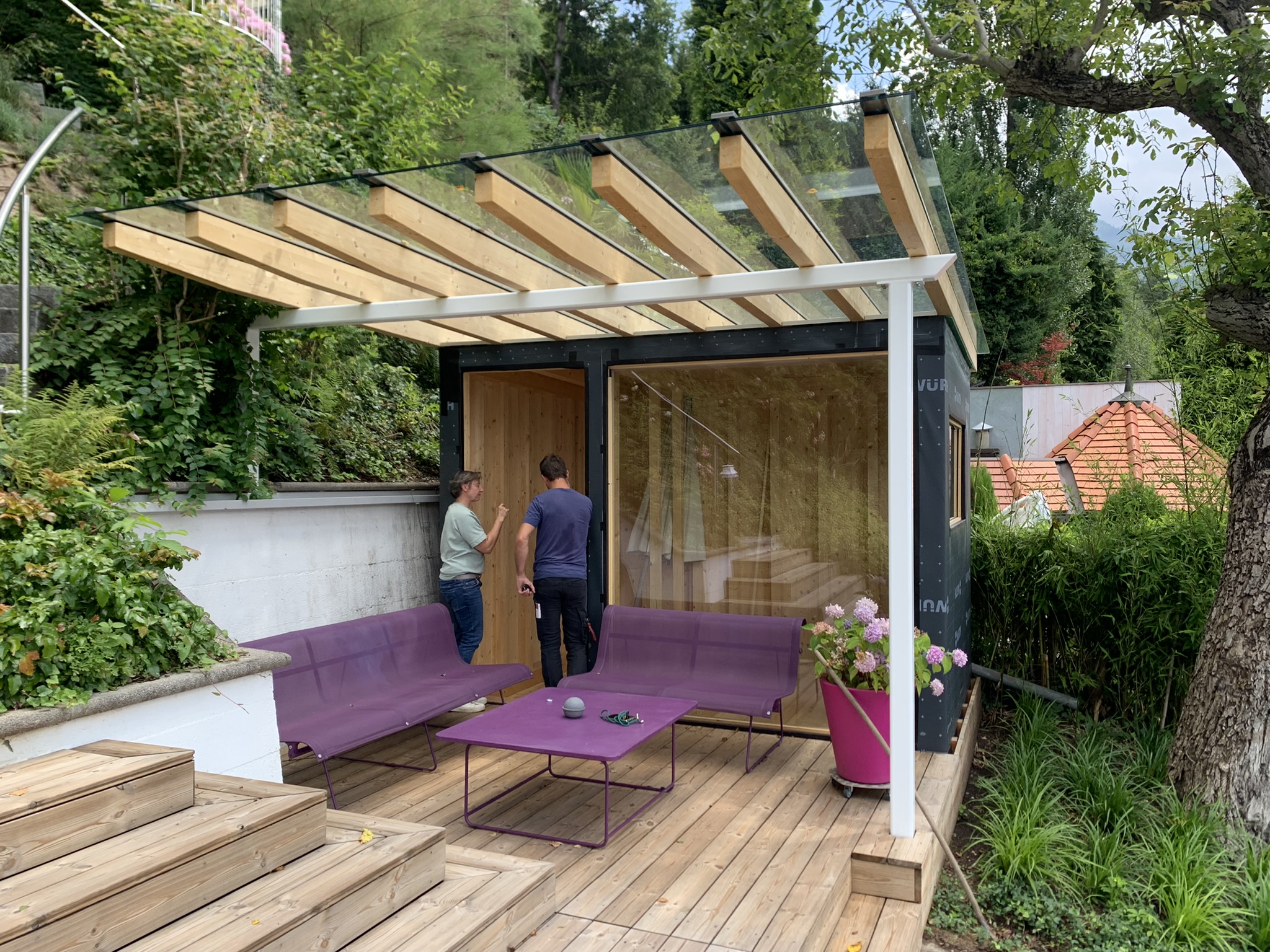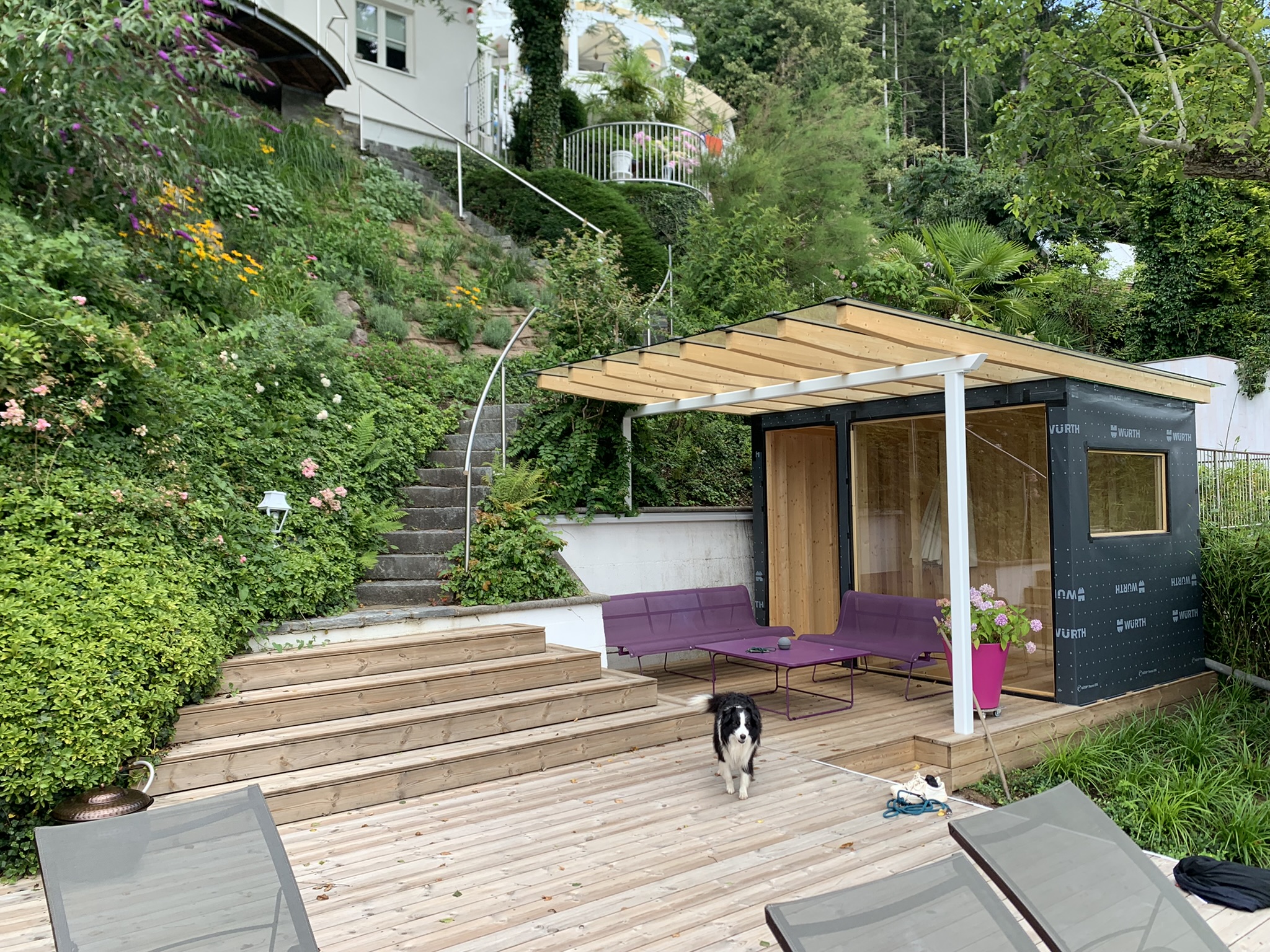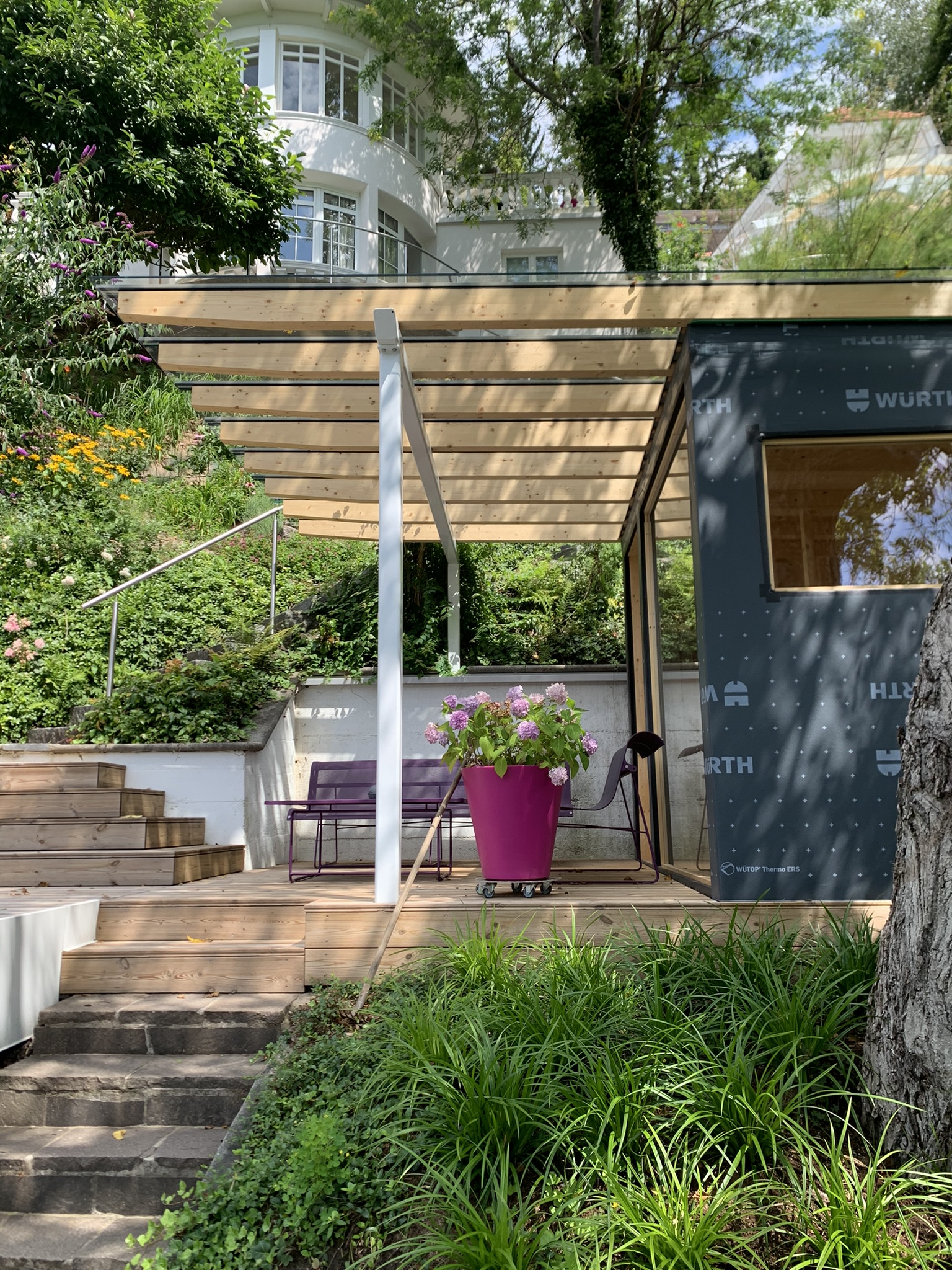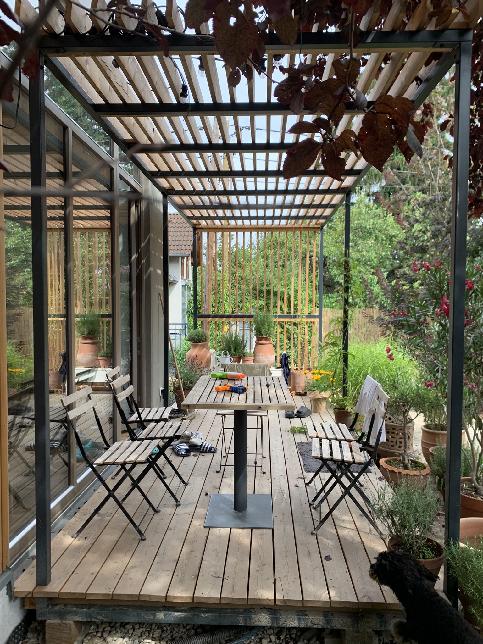 Zwischen den Schiebetoren und der transparenten Haut spannt sich ein 1,40 m breites überdachtes Holzdeck (Anlehnung an Schiffsdeck) auf. Es ist eine Erweiterung des Innenraumes und ist von alllen Wohnräumen direkt zugänglich.