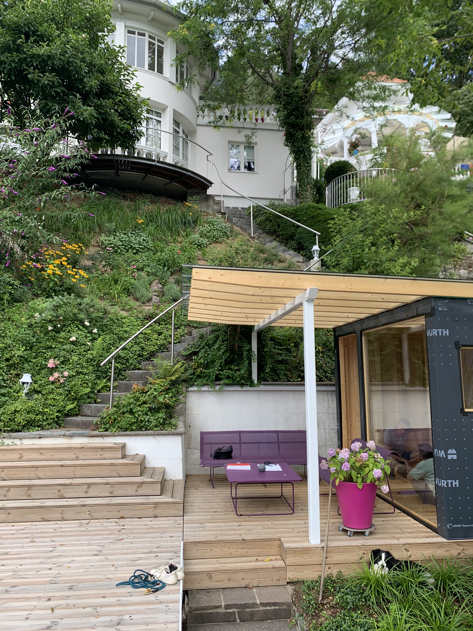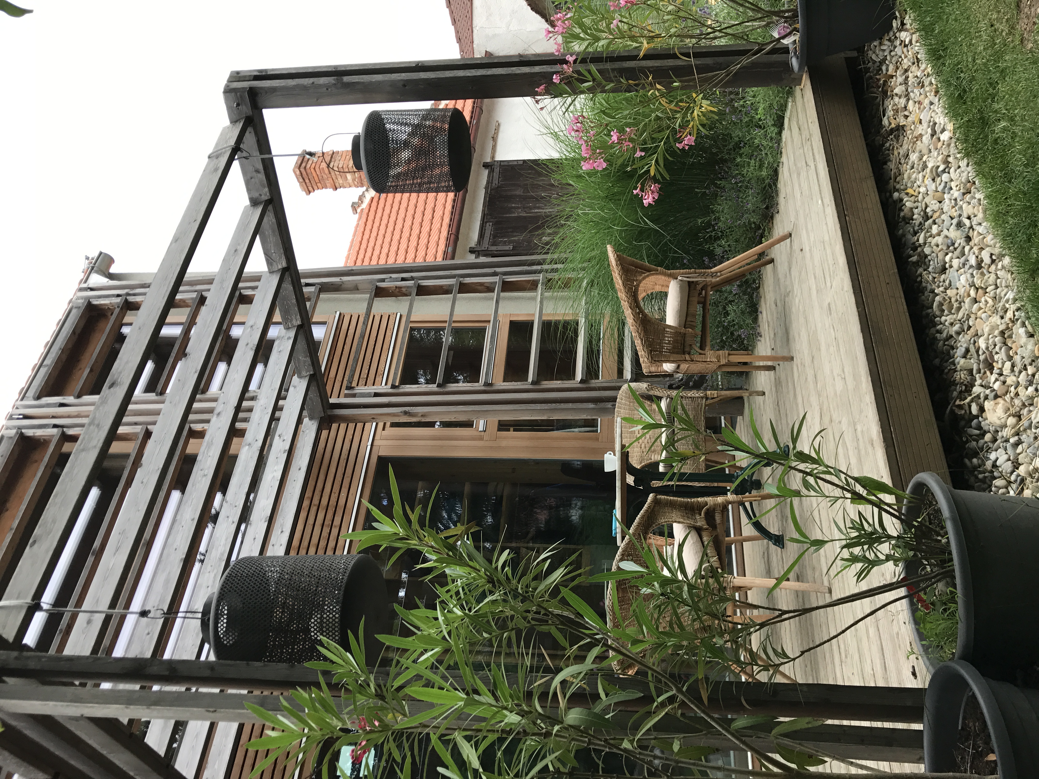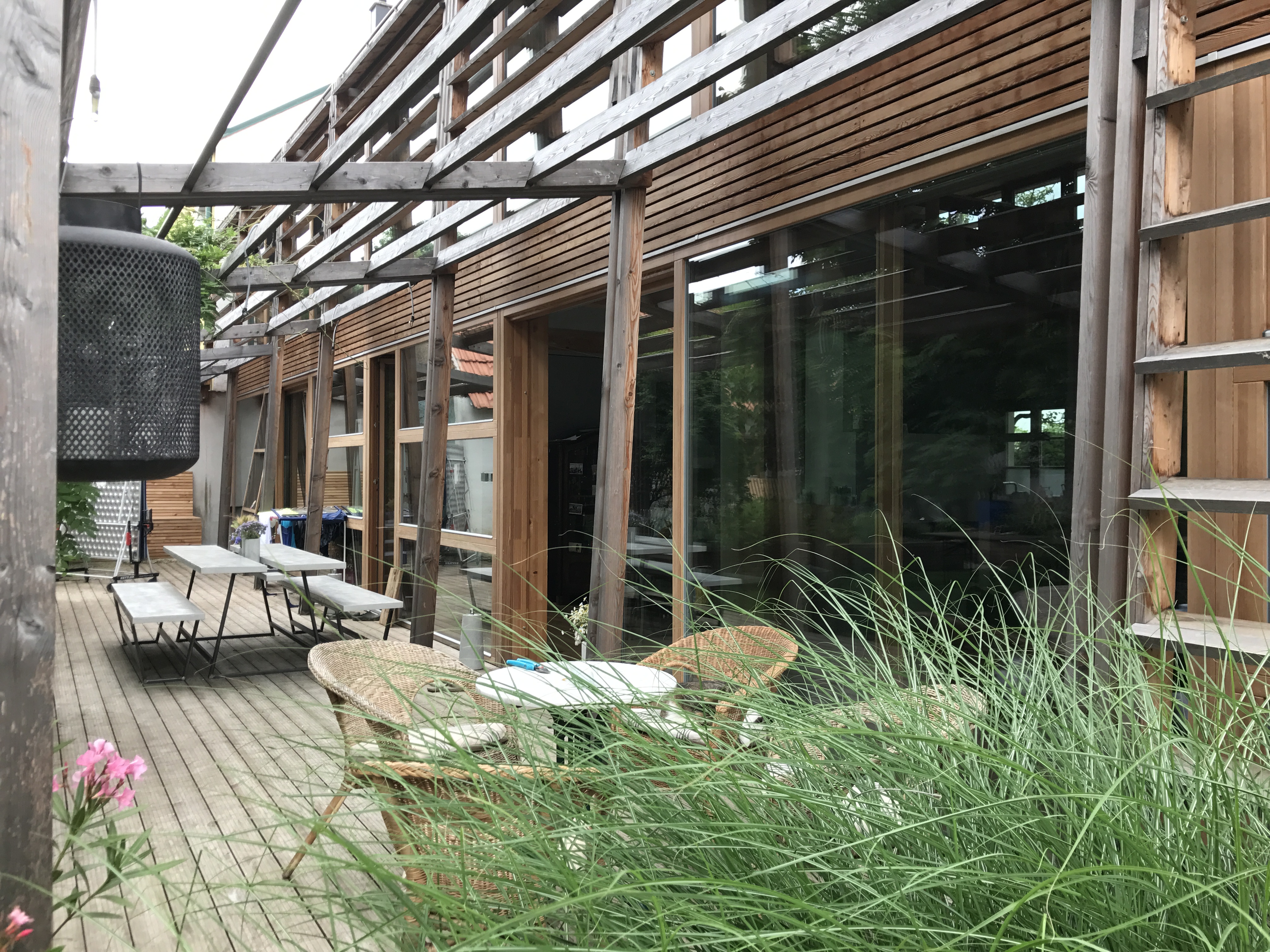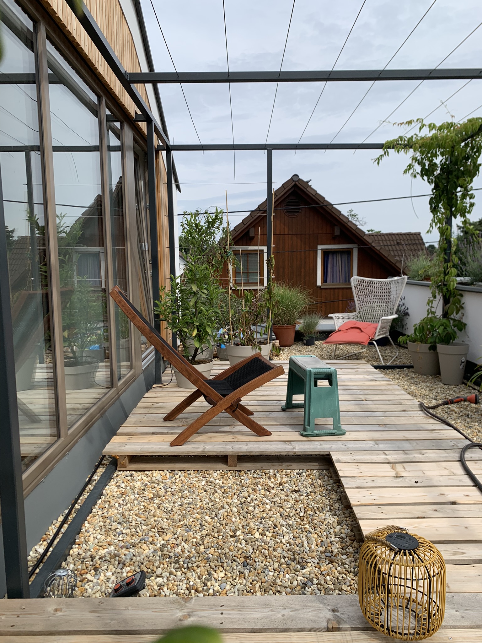 Zwischen den Schiebetoren und der transparenten Haut spannt sich ein 1,40 m breites überdachtes Holzdeck (Anlehnung an Schiffsdeck) auf. Es ist eine Erweiterung des Innenraumes und ist von alllen Wohnräumen direkt zugänglich.