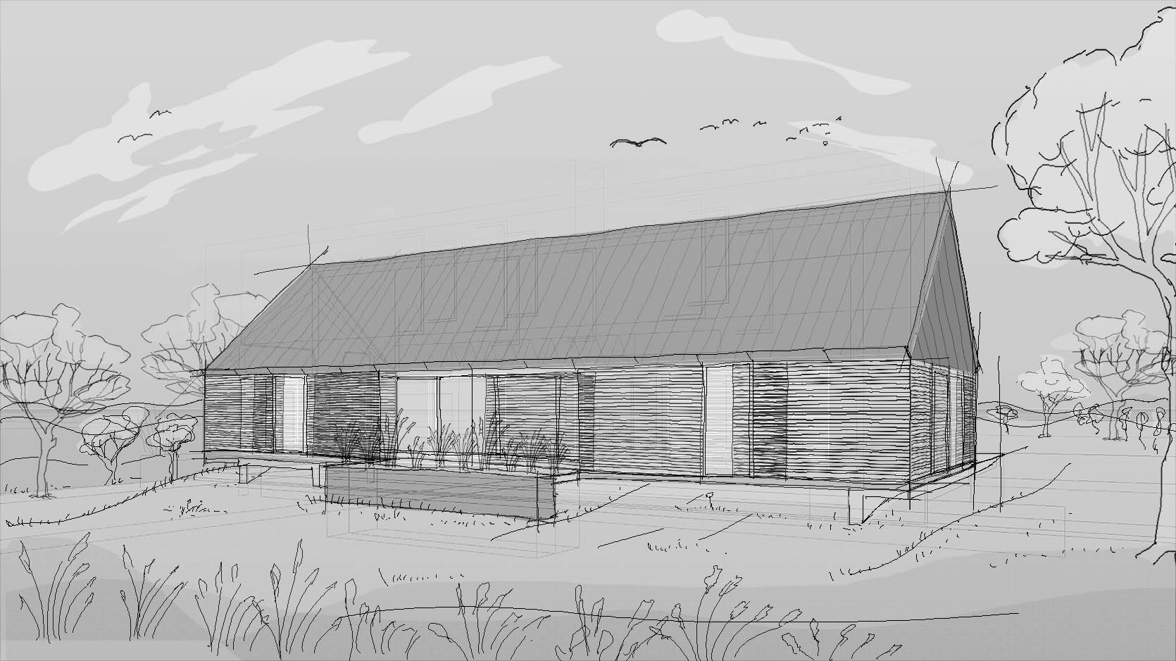 Das Toth Shelter ist ein fein ziseliertes Langhaus in Urtyform. Das Herz bildet ein Doppelstöckiger Raum, umgeben von transparenten Wänden aus 3- fach Verglasung. Angedockt gegen Osten und Westen sind Schlafzimmer mit Bad und 2,6o m Raumhöhe. Dadurch ergeben sich zwei ca. 35 m2 große Flächen / Räume im OG, die als Gästezimmer und als zusätzlicher Wohnzimmer genutzt werden können.