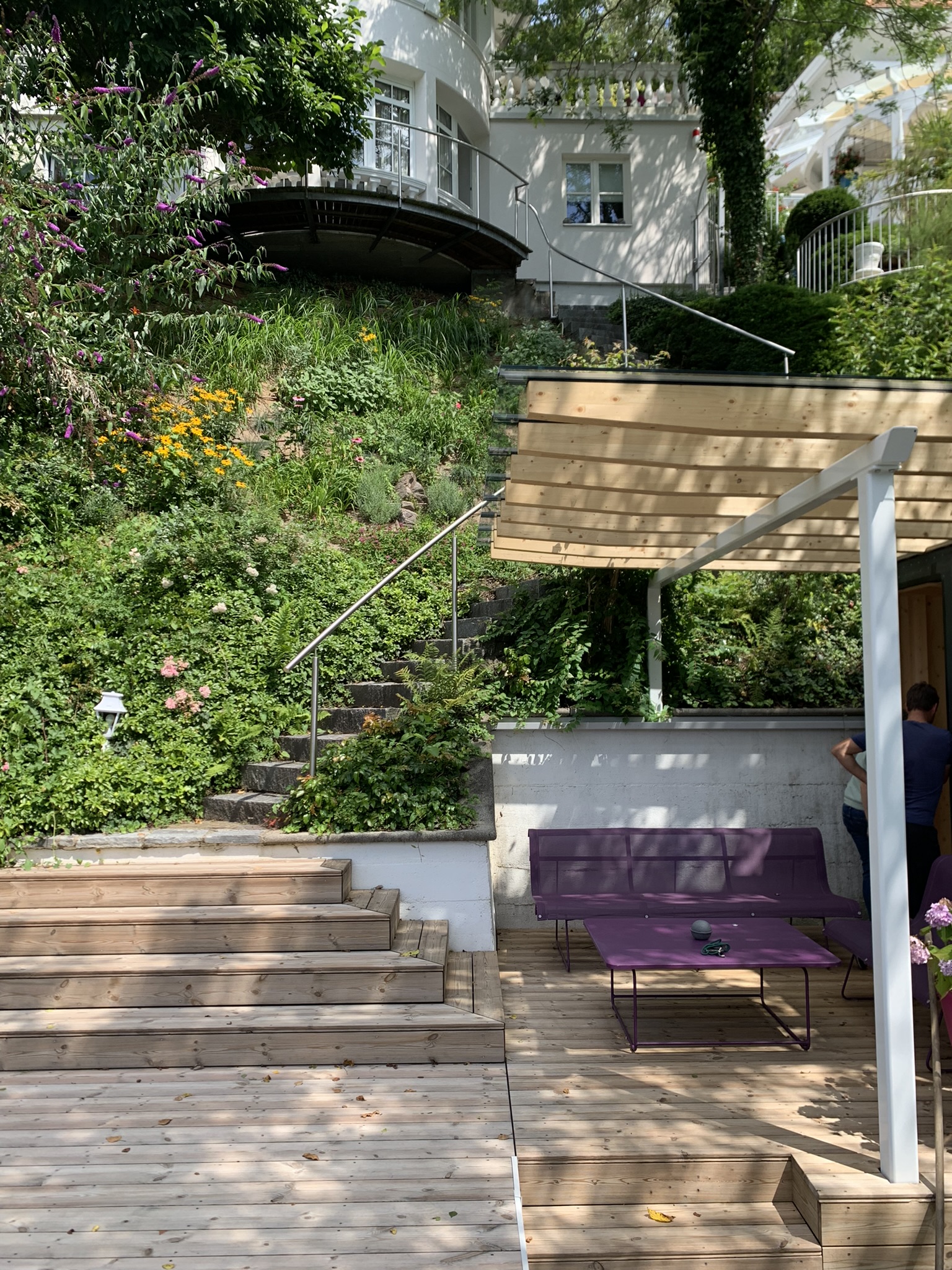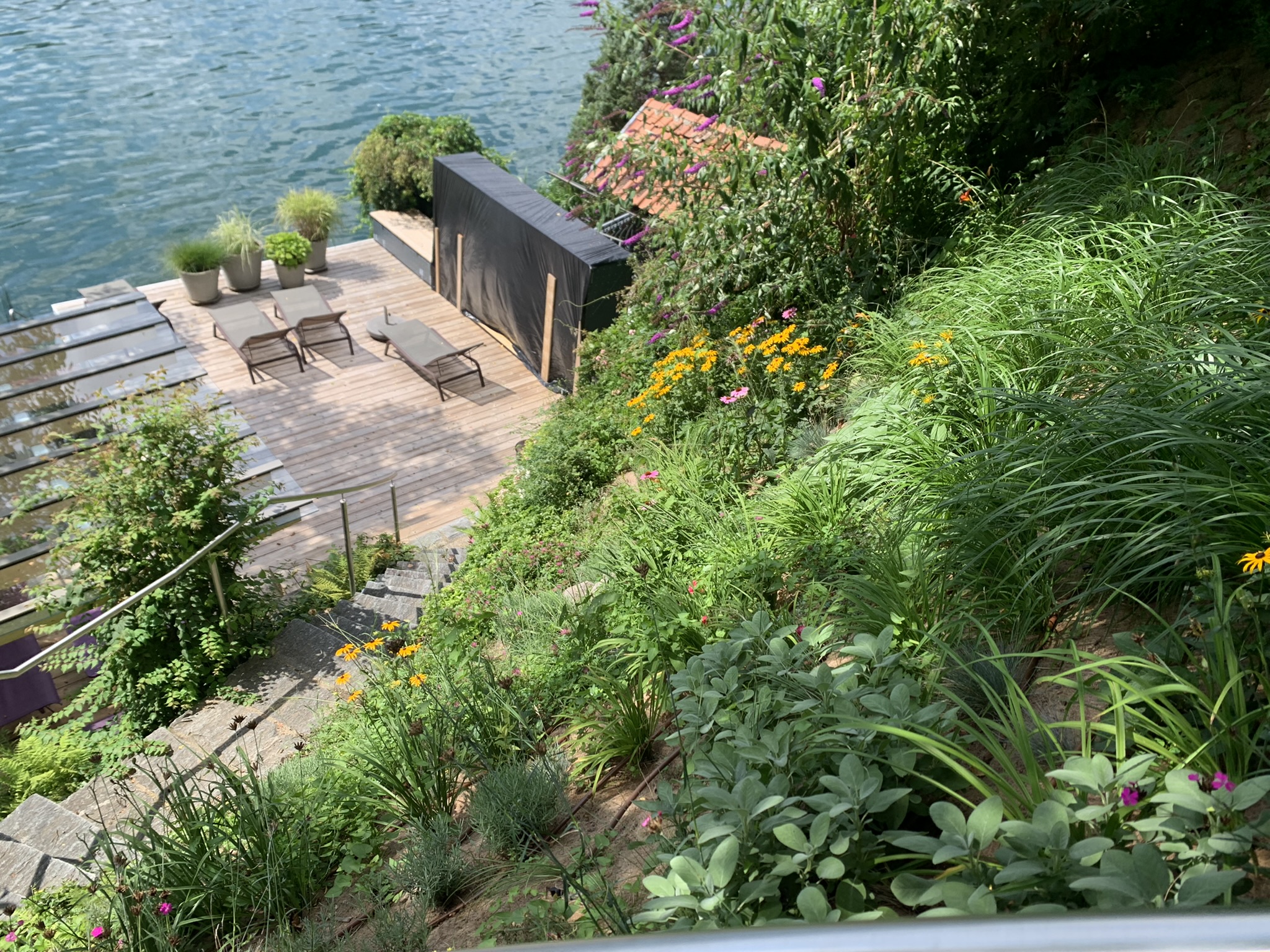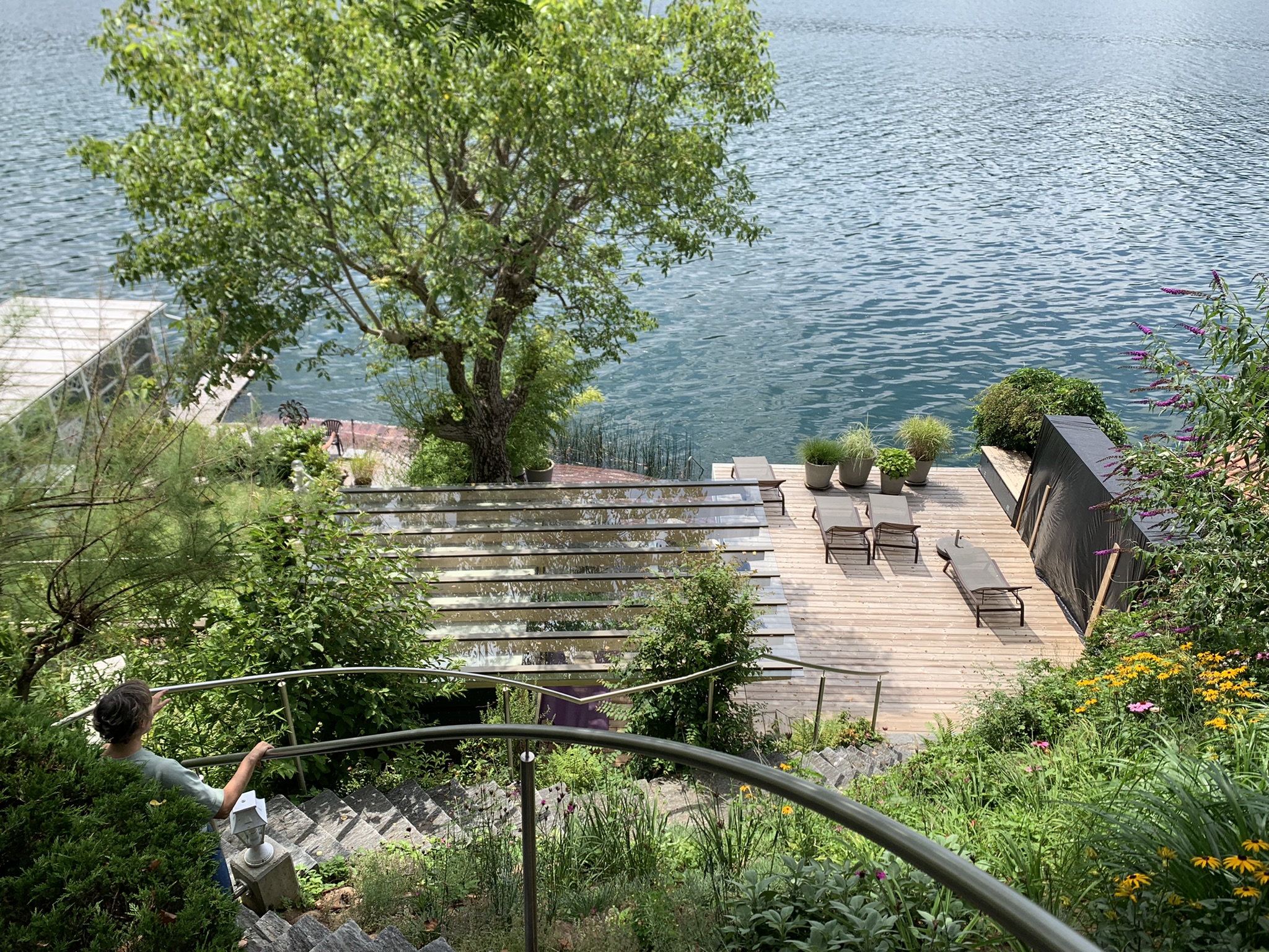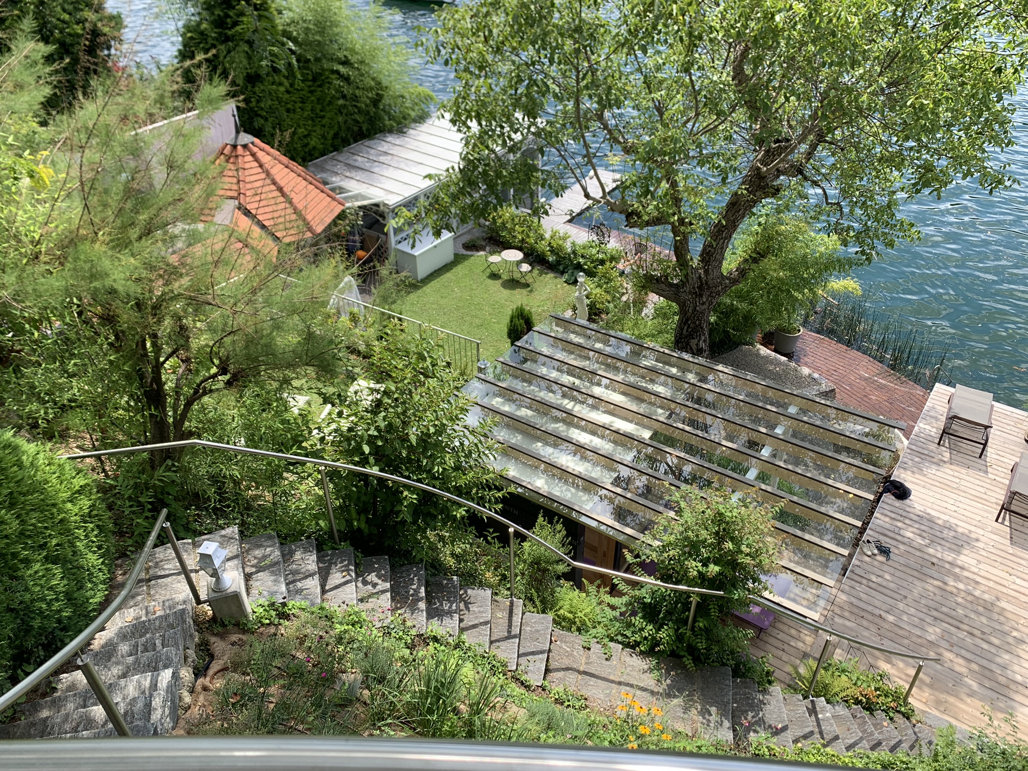 Wir entwerfen die Terrasse, das Bootshaus und die Uferzone neu, wobei so viel wie möglich vom Original erhalten wird, und dennoch alles transformiert und nun wieder hochwertig erscheint. Neue Zonen wie der “Tel Aviv Beach”, die Sauna und eine Außenküche sowie eine Sonnenterrasse enstehen. Ein und Ausblicke werden sanft und elegant umgelenkt. Die südlich exponierte Hangbepflanzung komplett neu angedacht (mit Hilfe des Biologen Dr. Gerald Navara), frisch, hell und leicht mediteran angehaucht. Opulente, kitschige Geländer werden entfernt bzw teilweise neu designed.