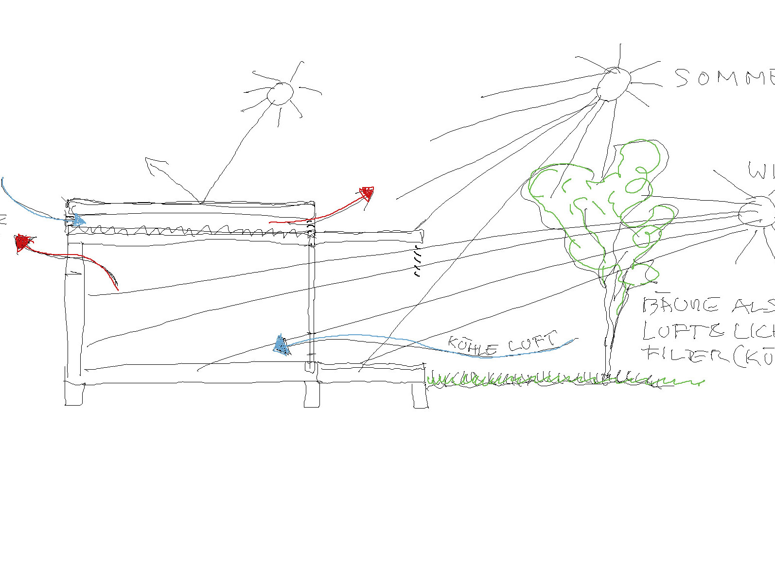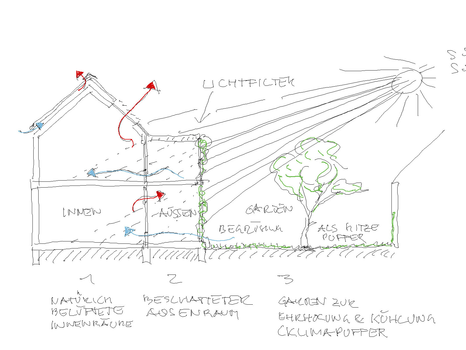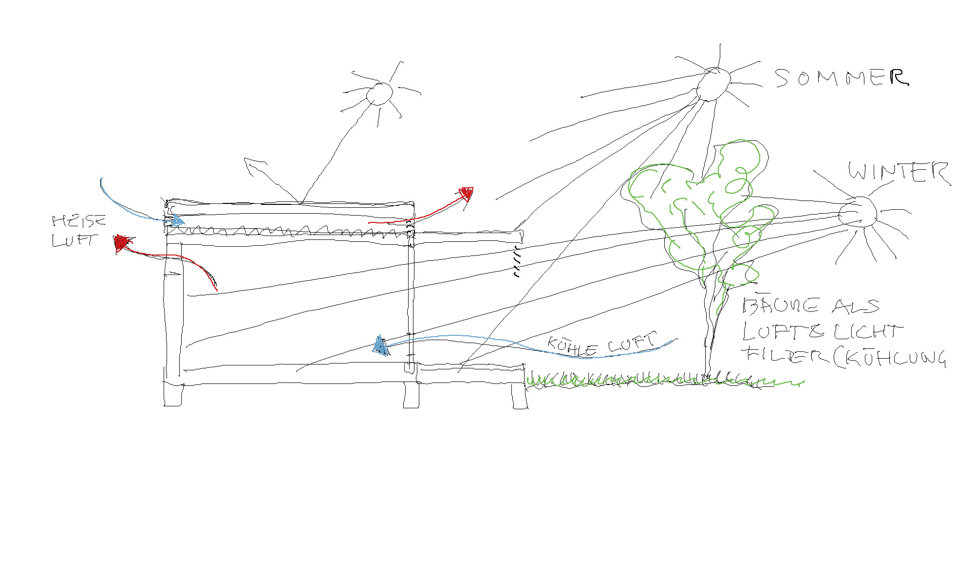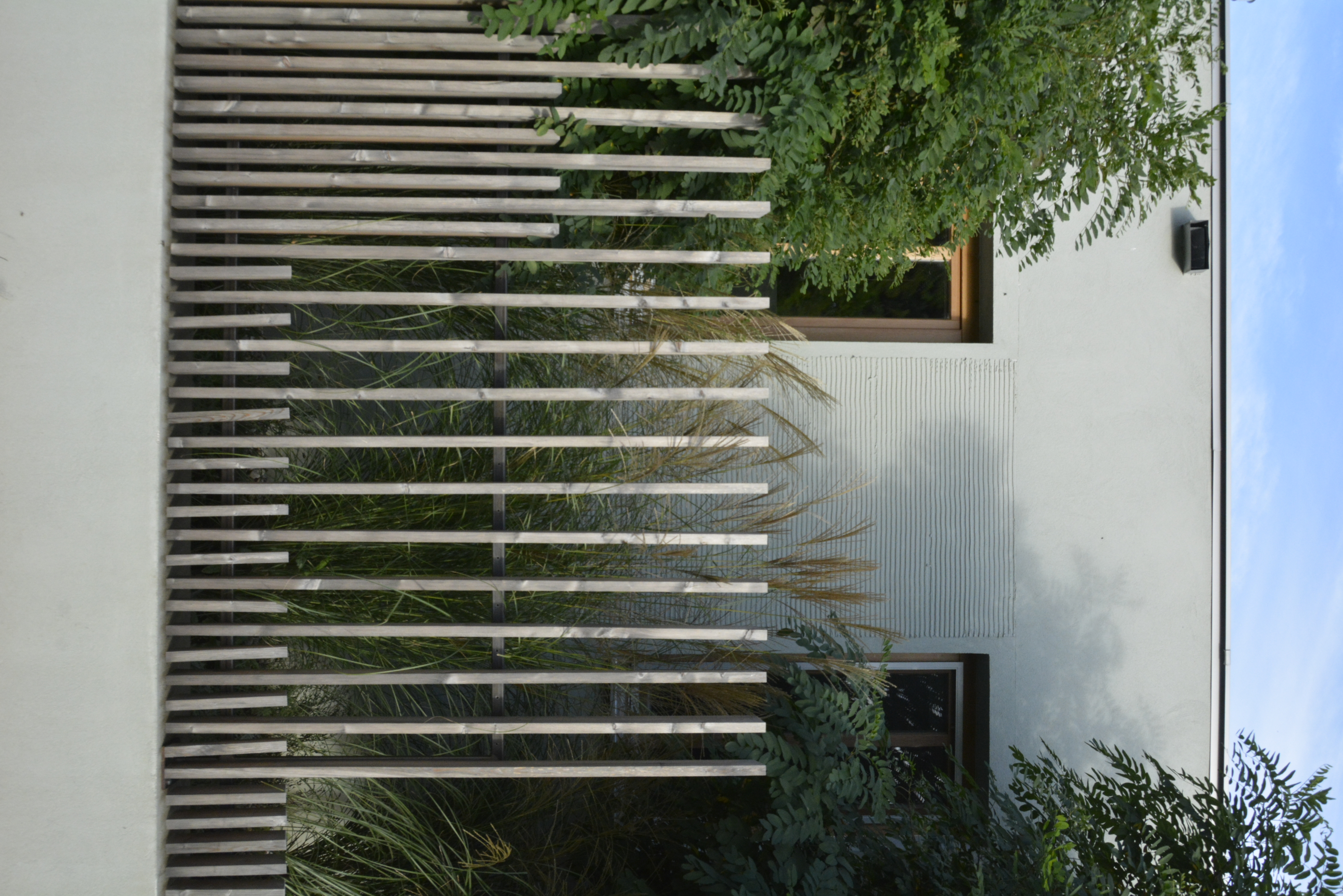 Die Holzschiebeelemente im Leichtbau ( Stahlkonstruktion d. Rahmen, beplankt mit naturbelassenen Holzlatten) bilden ein leicht transparentes wandelbares Wandelement, dass sich der Benutzung des Hauses anpasst und die Optik des Hauses je nach Verwendung verändert. Eine dritte schützende Haut bildet eine dichte Baumbepflanzung, welche nochmals Schatten spendet und als Wind und Sichtschutz dient.