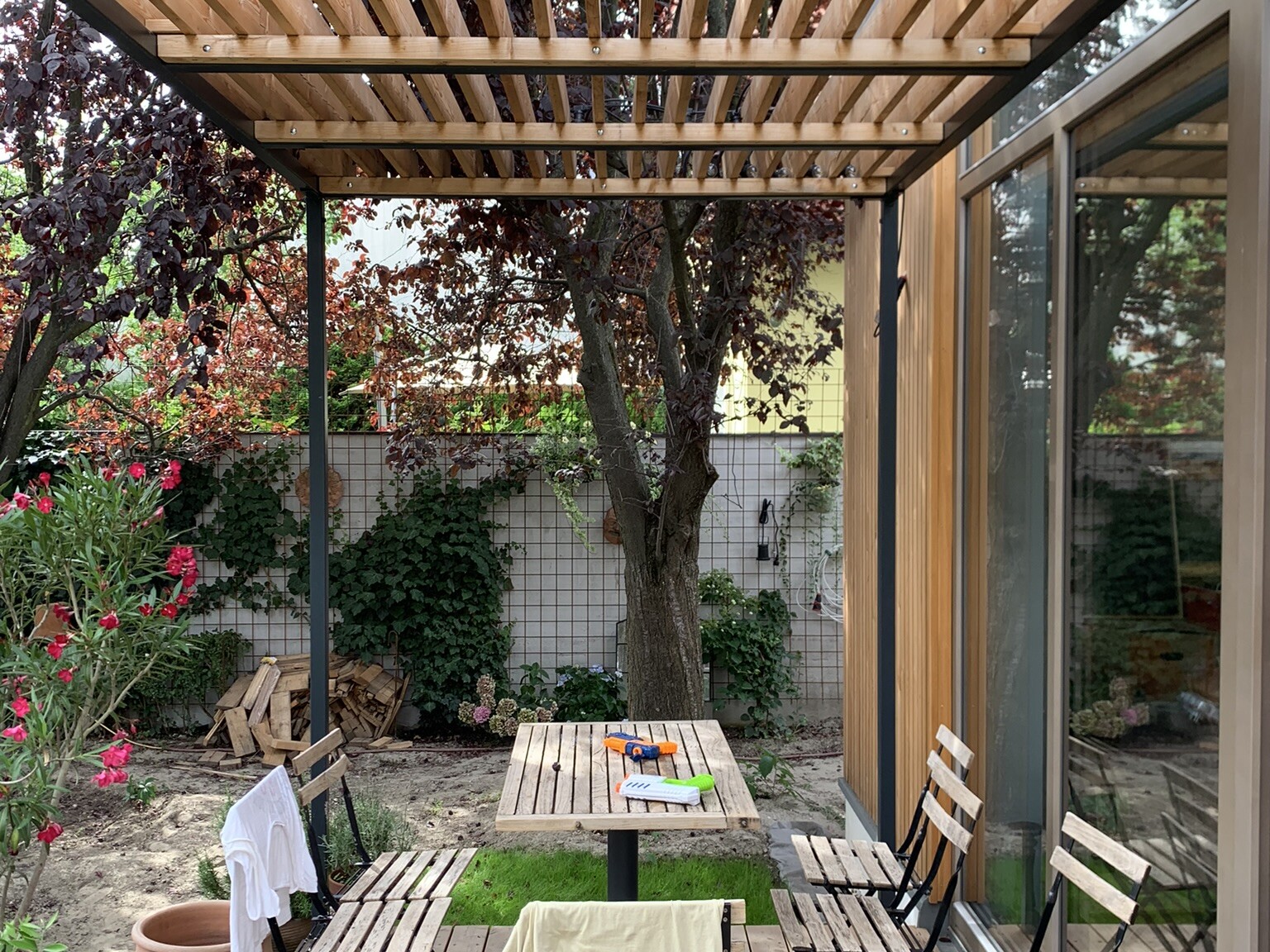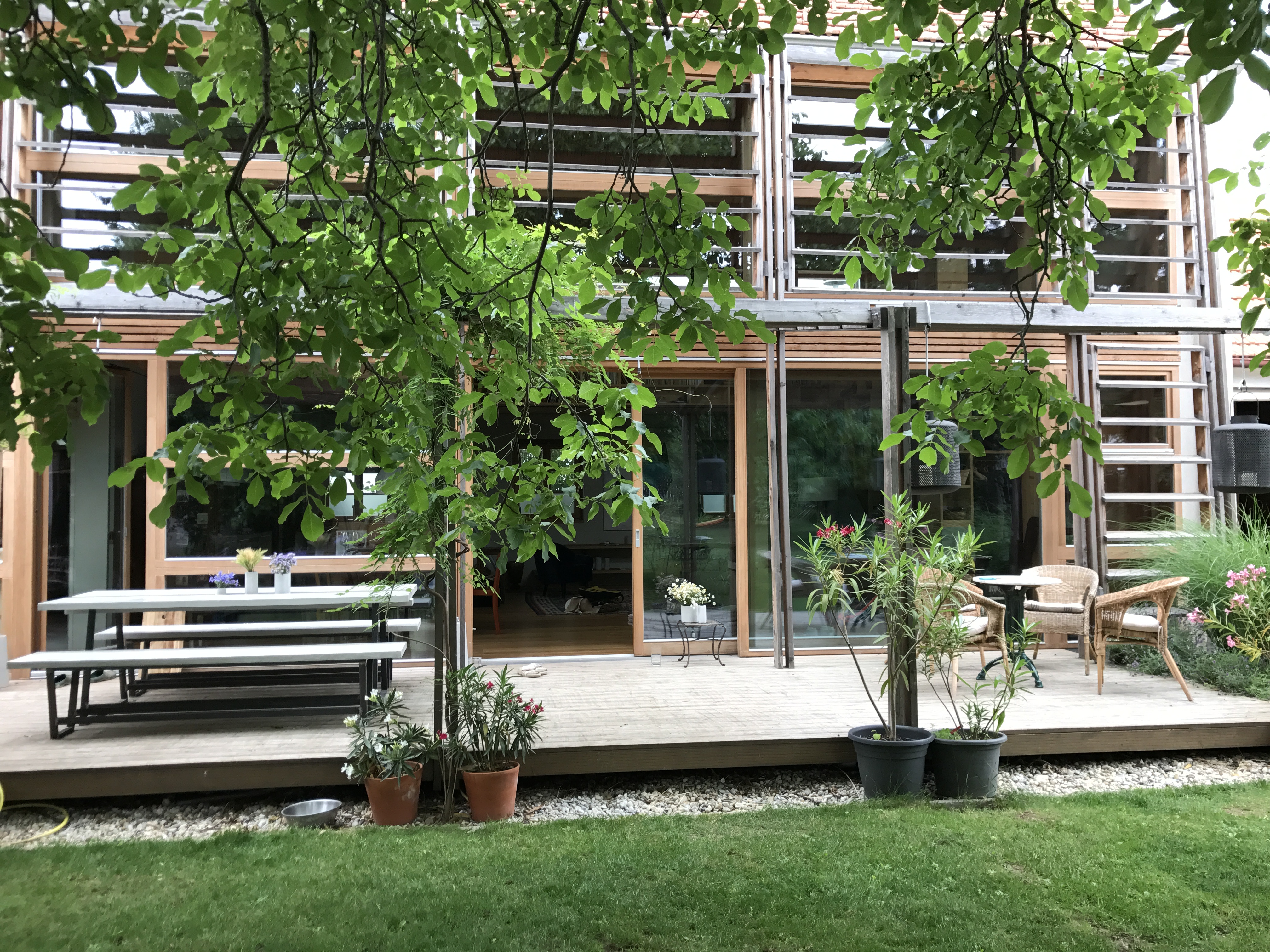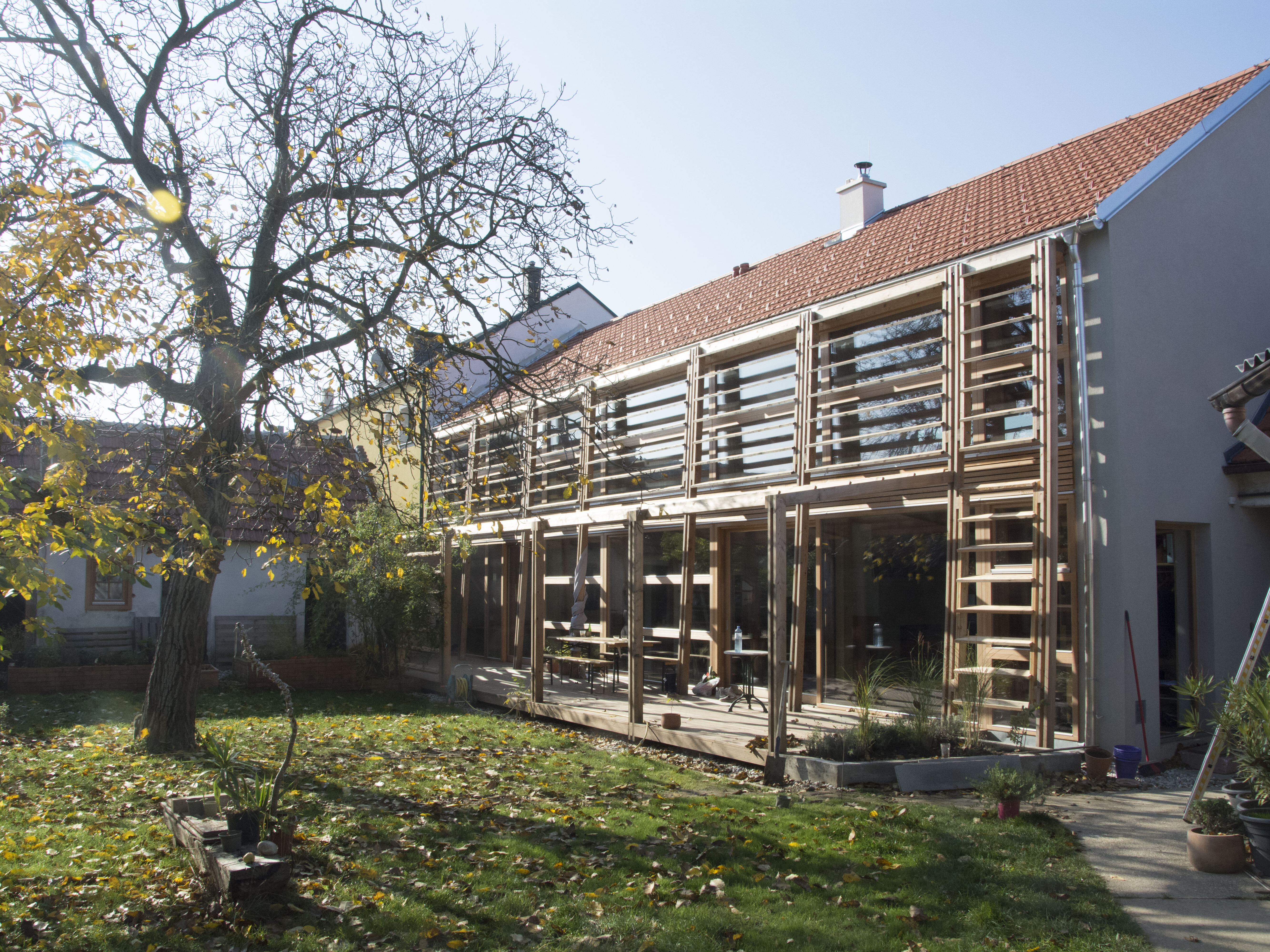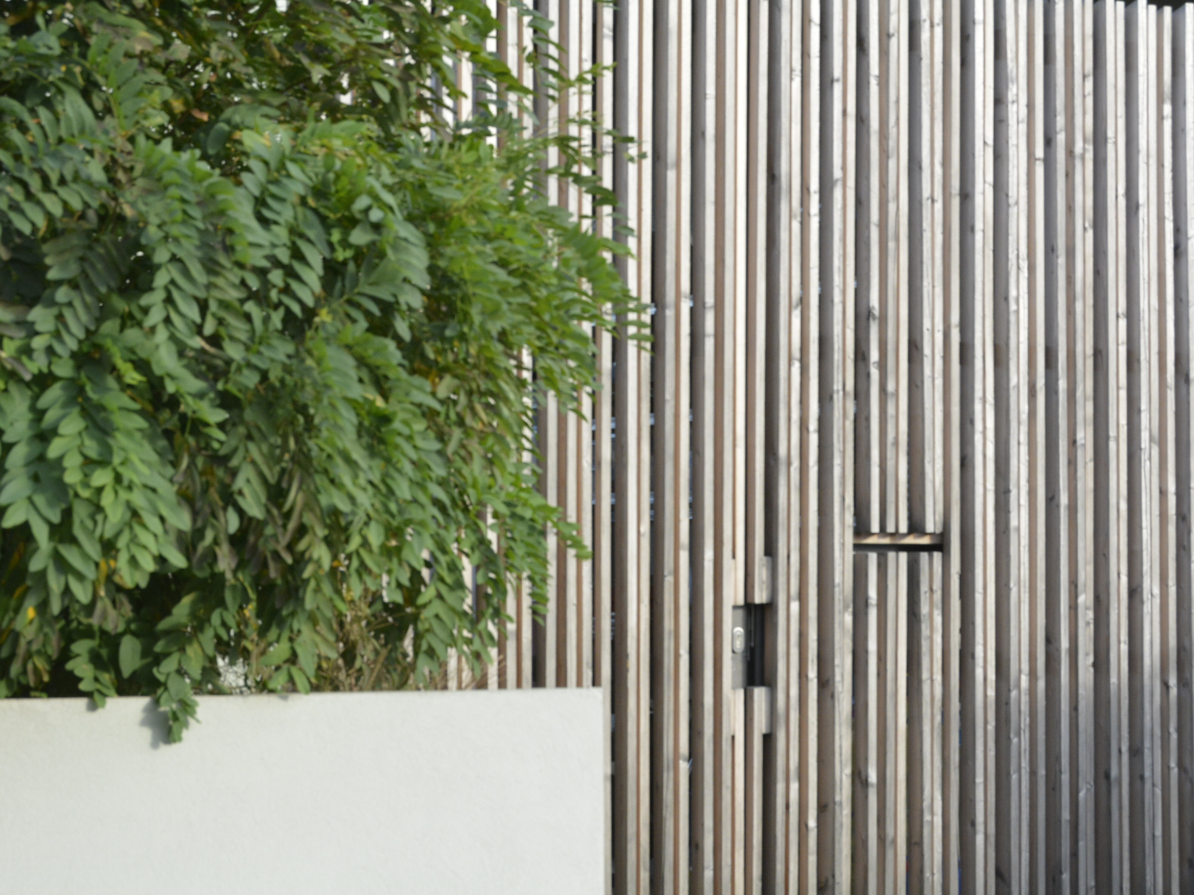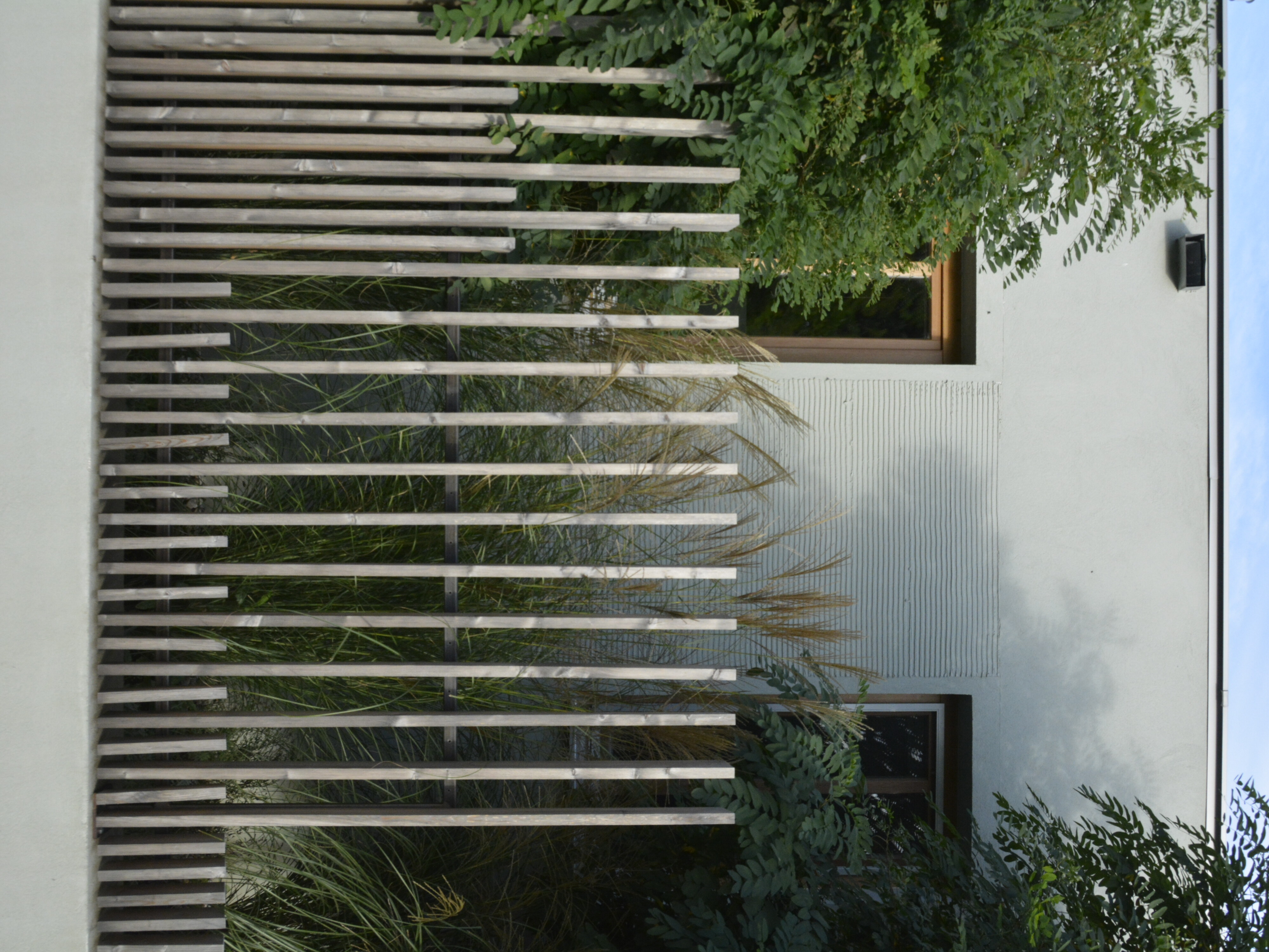 Die Holzschiebeelemente im Leichtbau ( Stahlkonstruktion d. Rahmen, beplankt mit naturbelassenen Holzlatten) bilden ein leicht transparentes wandelbares Wandelement, dass sich der Benutzung des Hauses anpasst und die Optik des Hauses je nach Verwendung verändert. Eine dritte schützende Haut bildet eine dichte Baumbepflanzung, welche nochmals Schatten spendet und als Wind und Sichtschutz dient.
