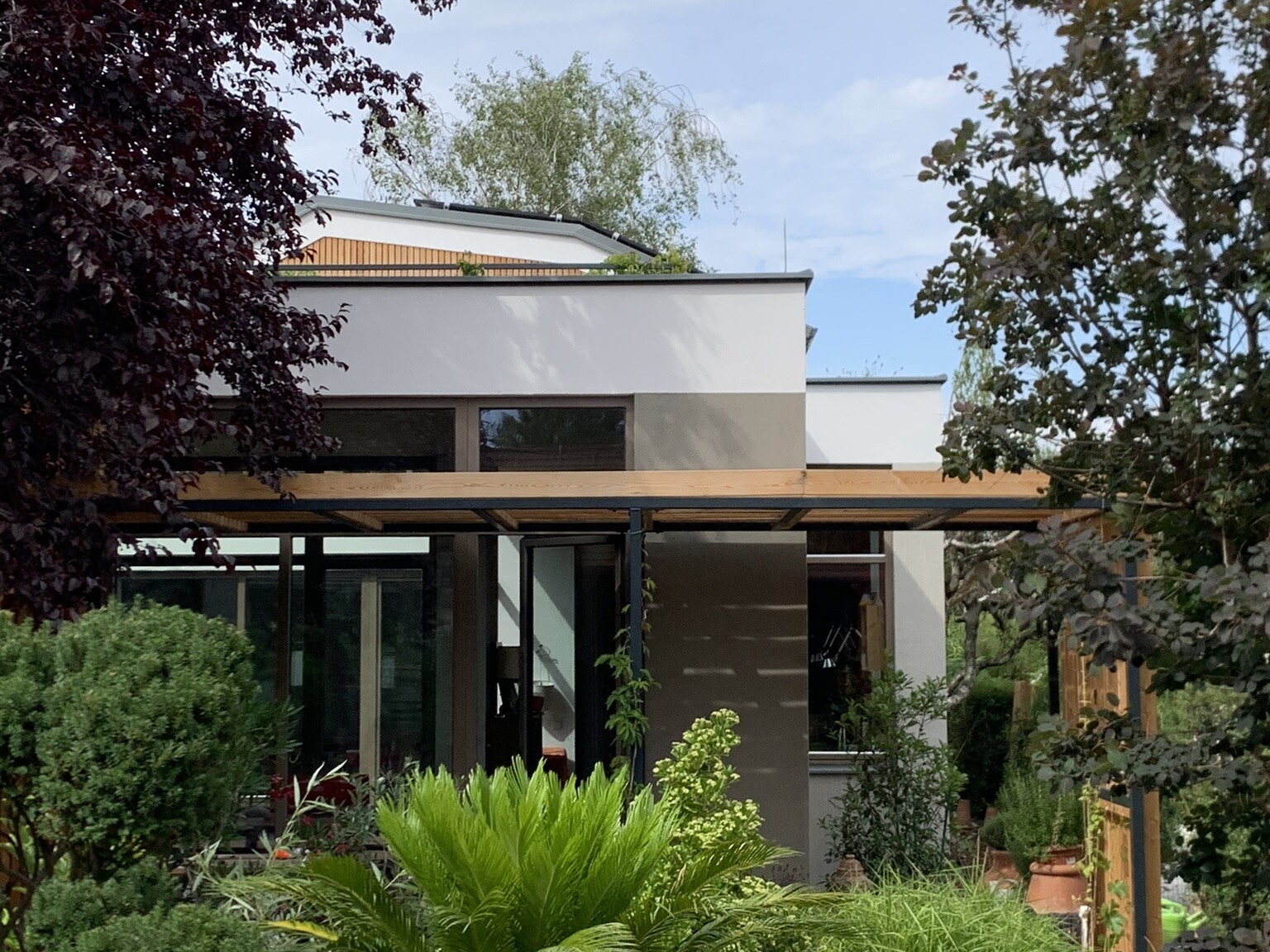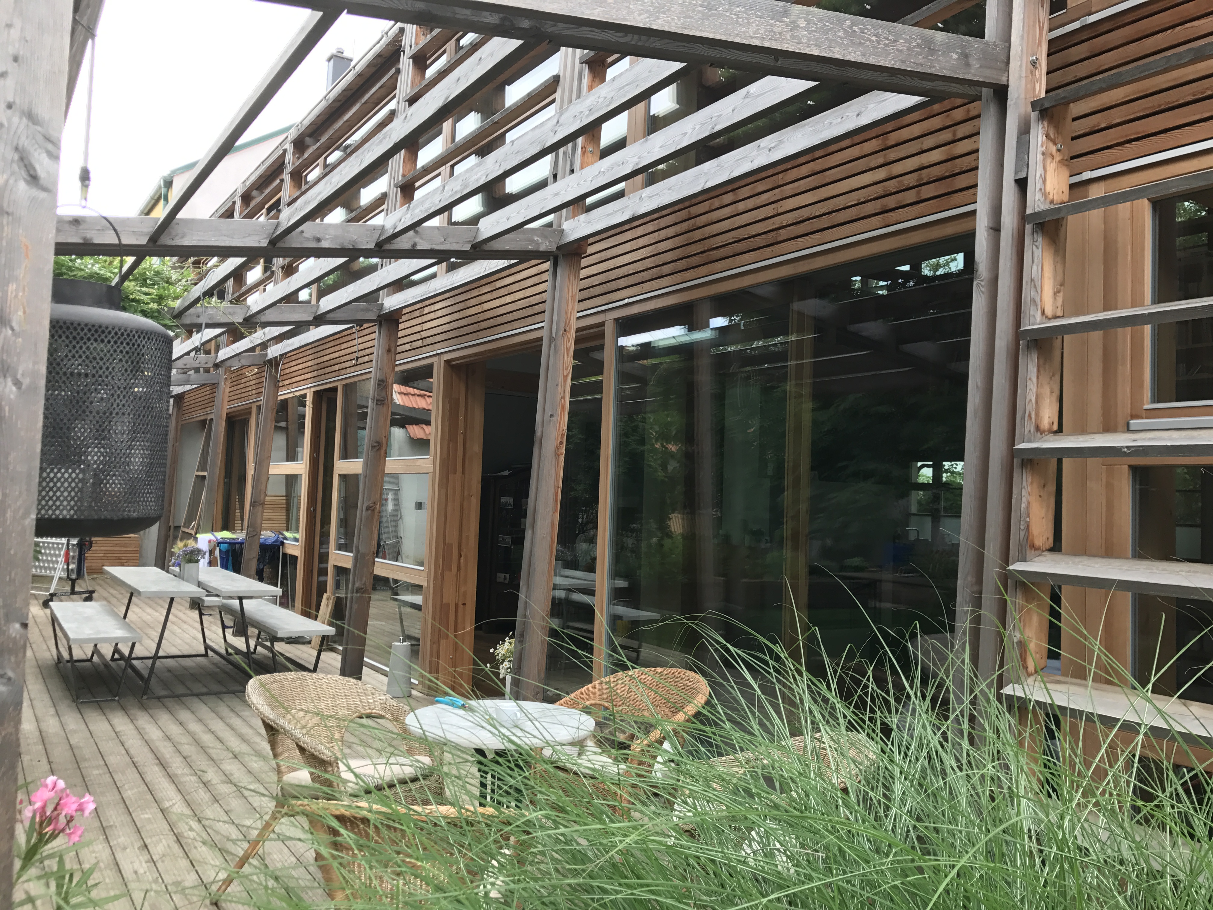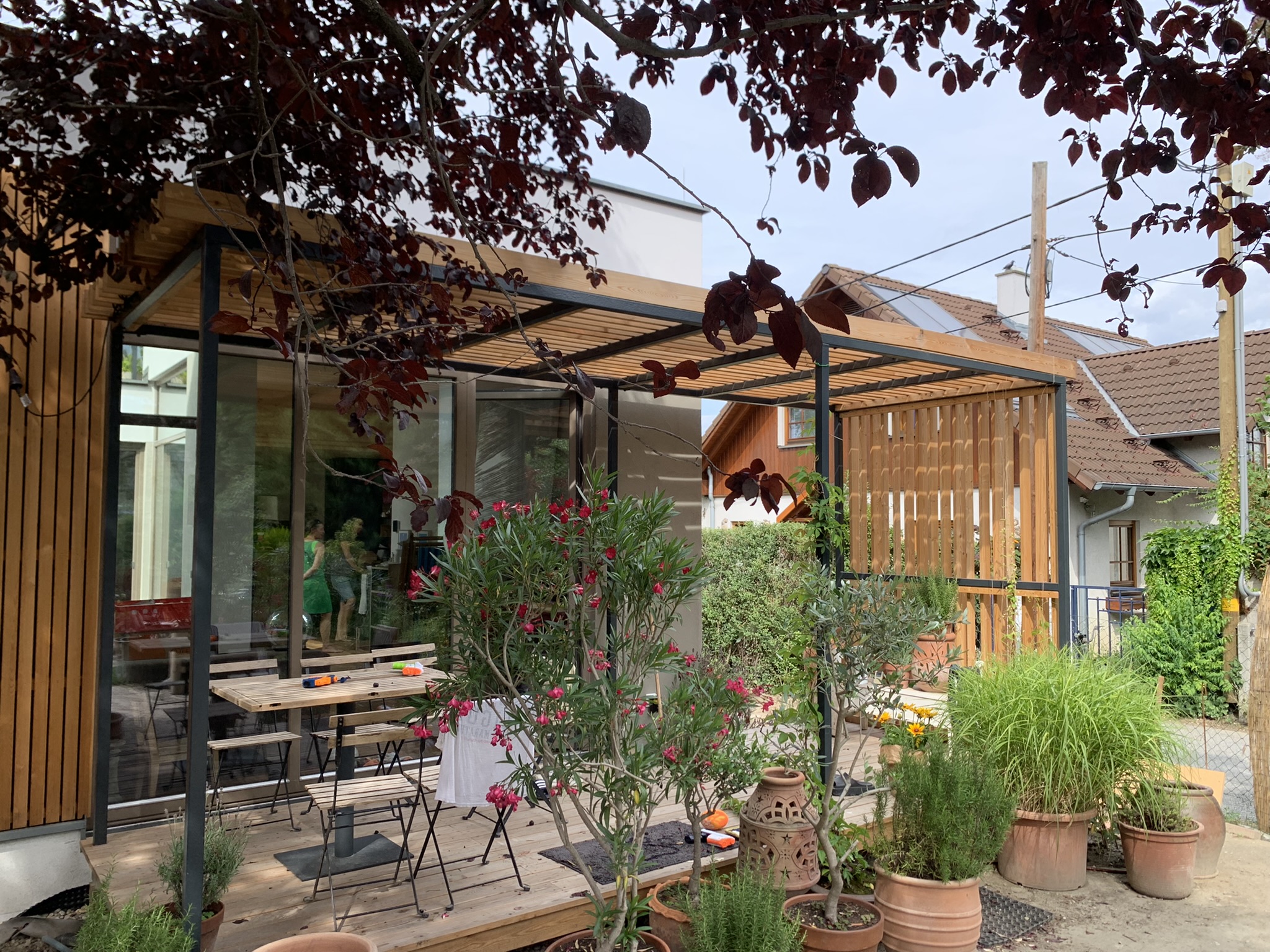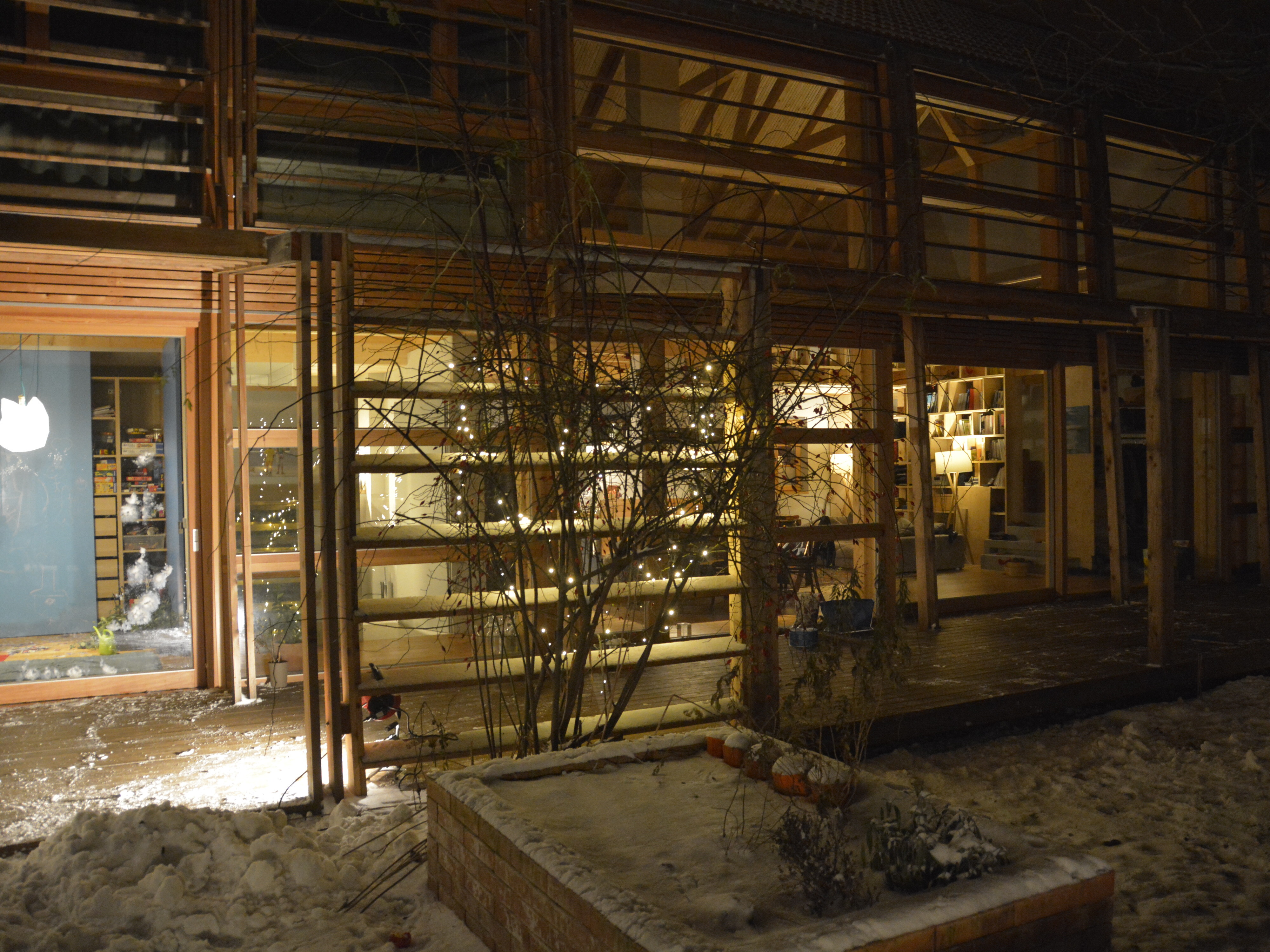 Die Holzschiebeelemente im Leichtbau ( Stahlkonstruktion d. Rahmen, beplankt mit naturbelassenen Holzlatten) bilden ein leicht transparentes wandelbares Wandelement, dass sich der Benutzung des Hauses anpasst und die Optik des Hauses je nach Verwendung verändert. Eine dritte schützende Haut bildet eine dichte Baumbepflanzung, welche nochmals Schatten spendet und als Wind und Sichtschutz dient.