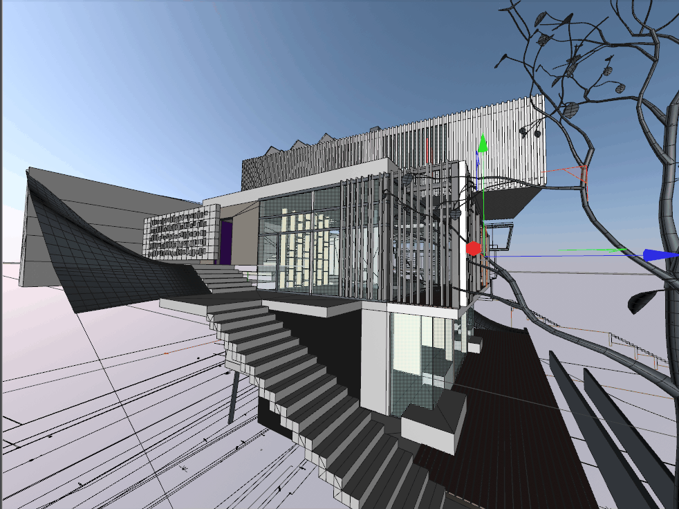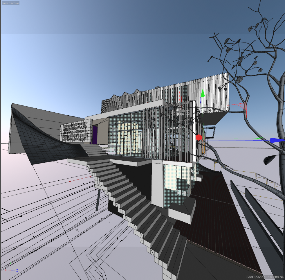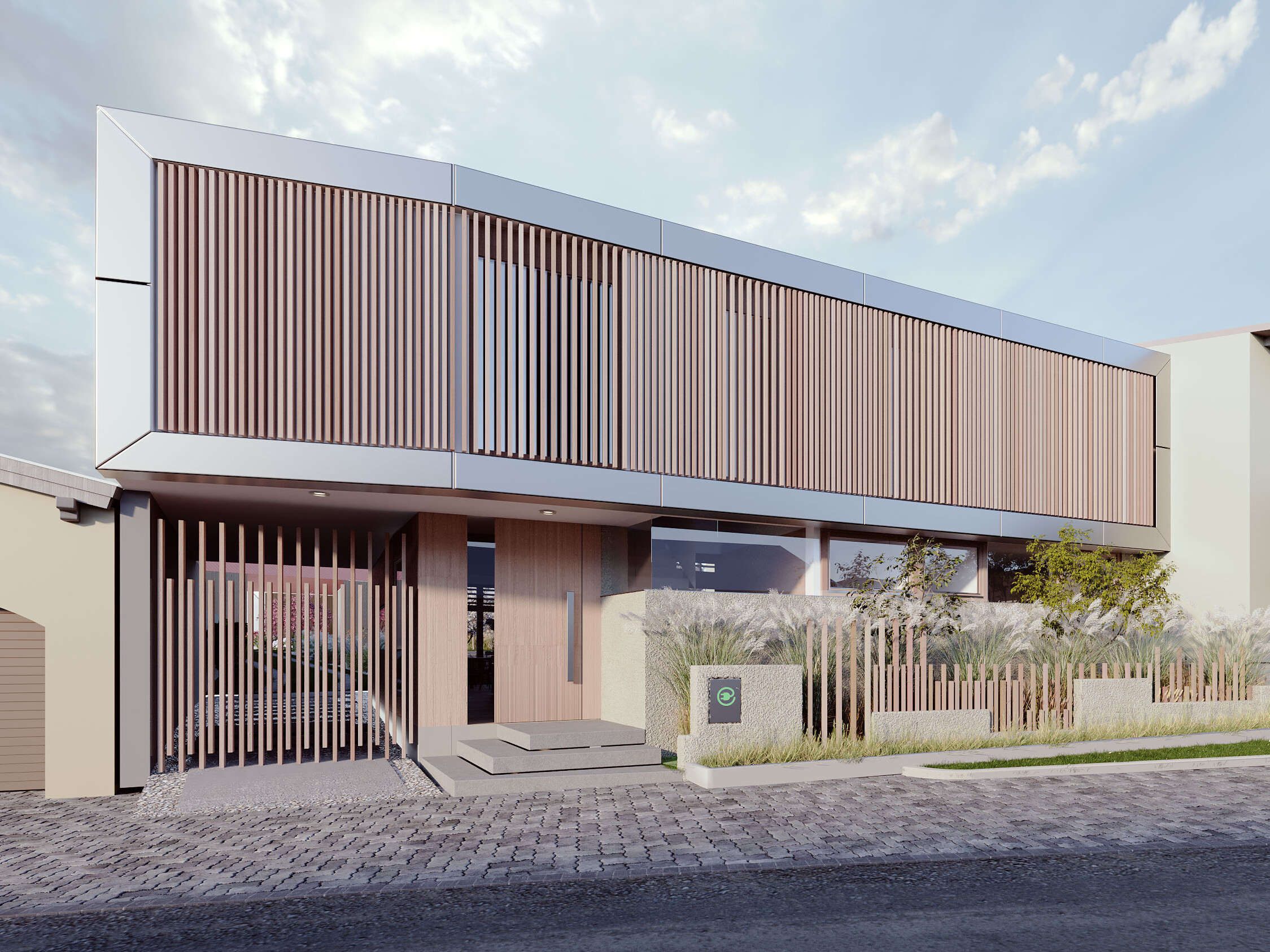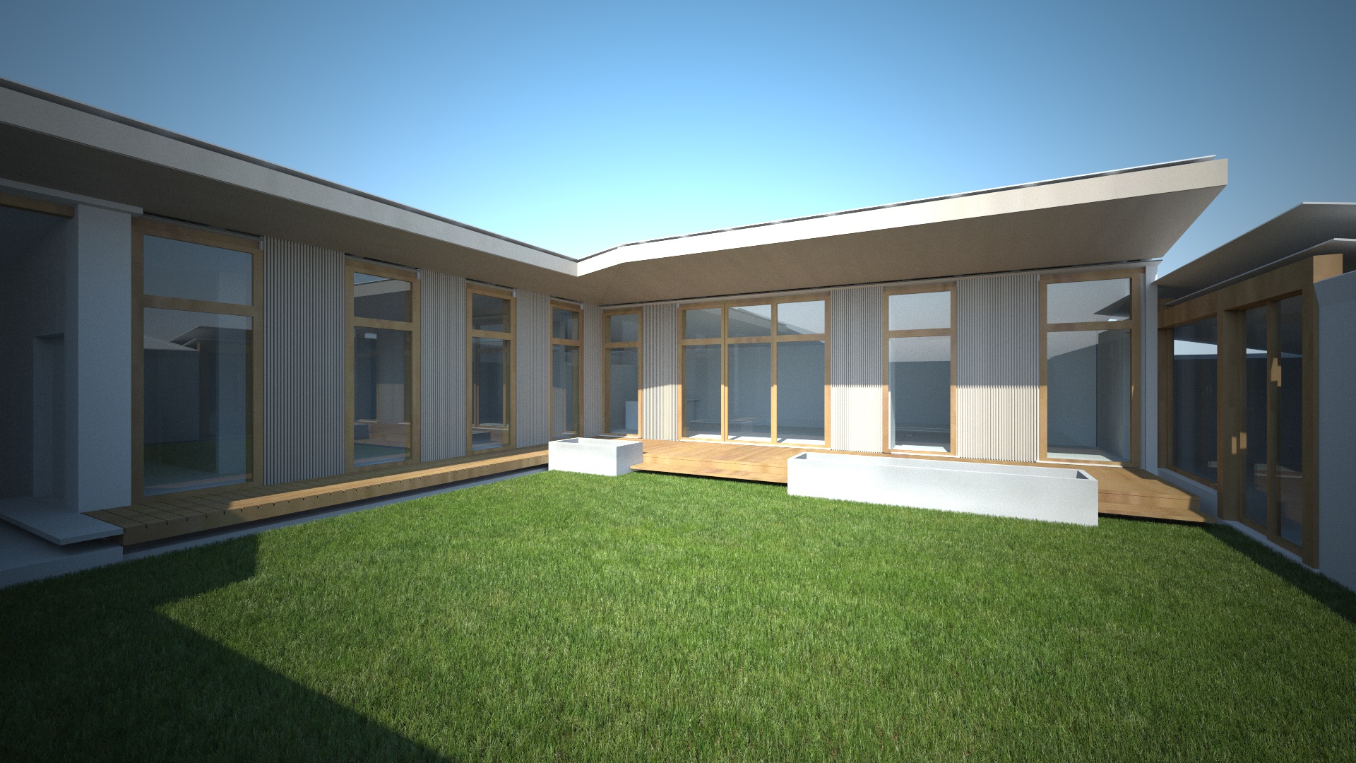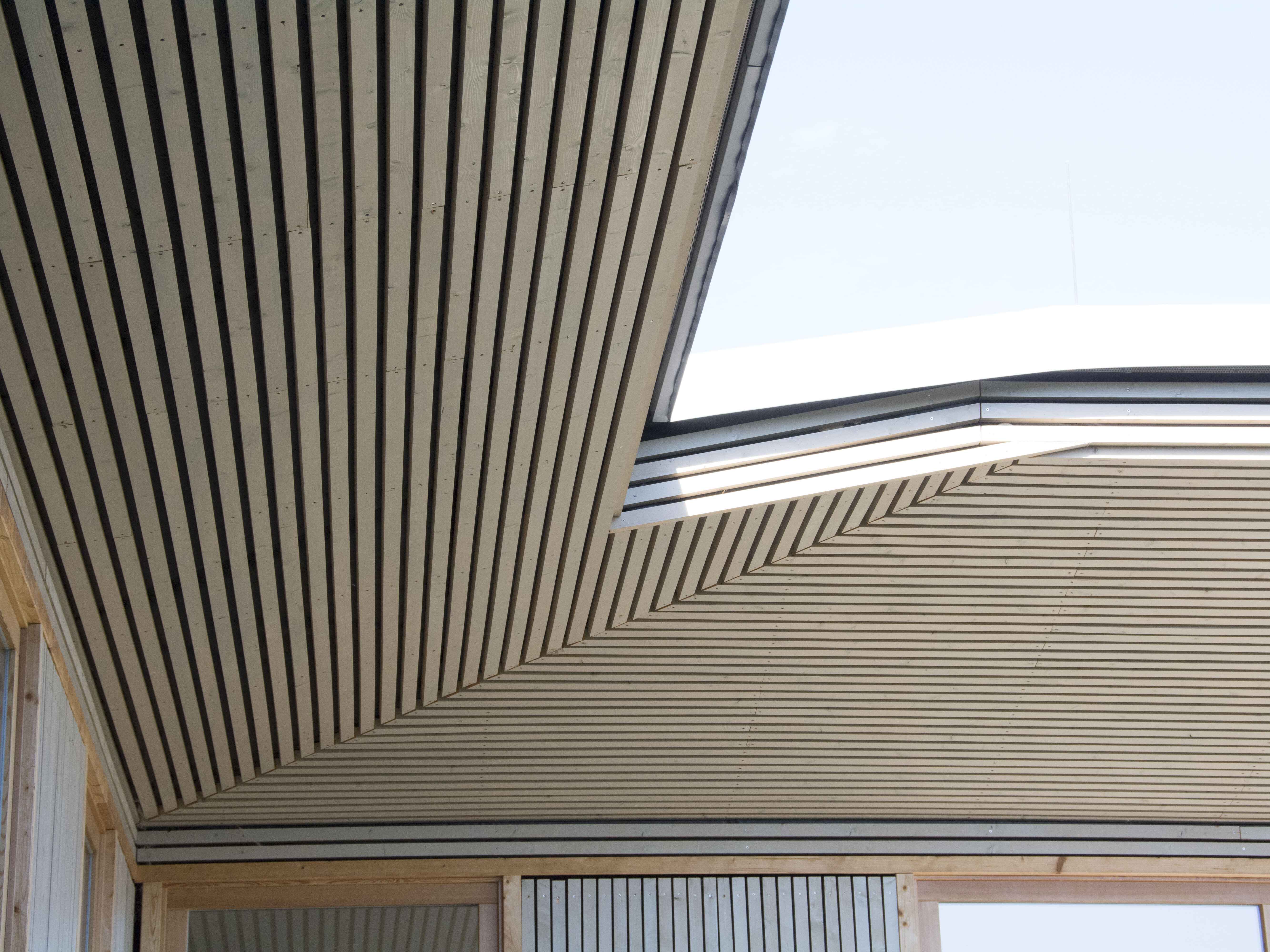 Die Holzschiebeelemente im Leichtbau ( Stahlkonstruktion d. Rahmen, beplankt mit naturbelassenen Holzlatten) bilden ein leicht transparentes wandelbares Wandelement, dass sich der Benutzung des Hauses anpasst und die Optik des Hauses je nach Verwendung verändert. Eine dritte schützende Haut bildet eine dichte Baumbepflanzung, welche nochmals Schatten spendet und als Wind und Sichtschutz dient.