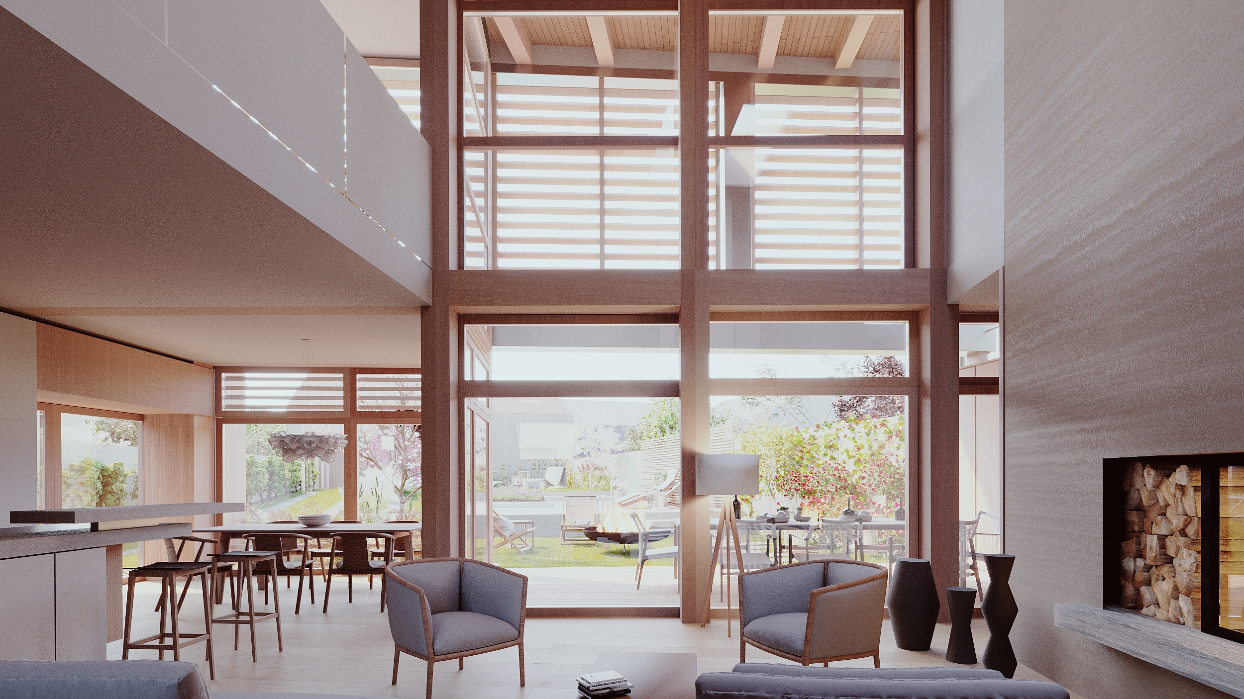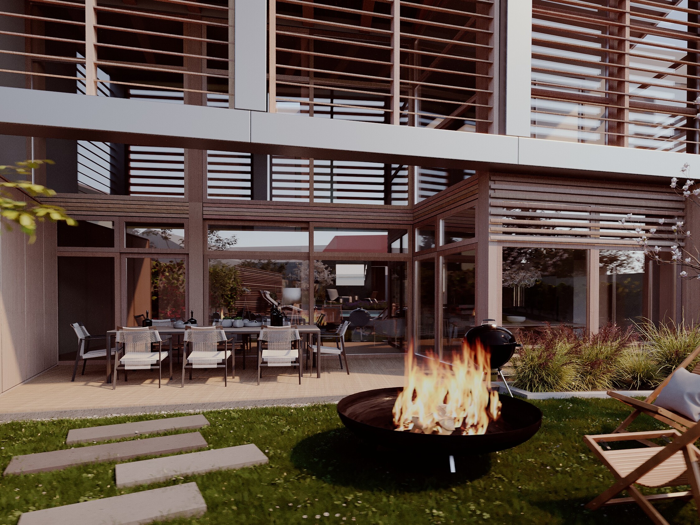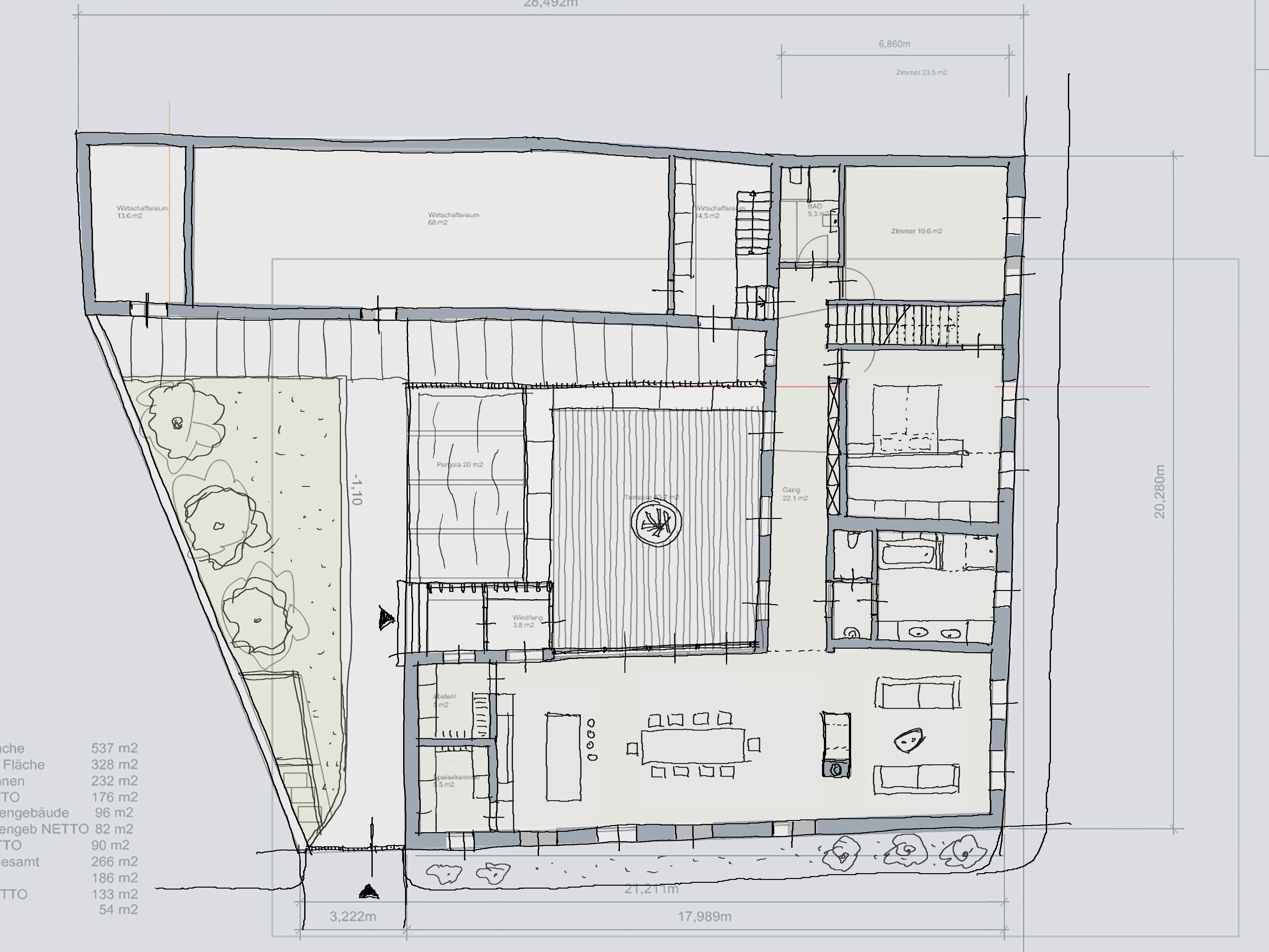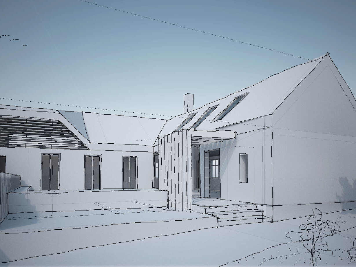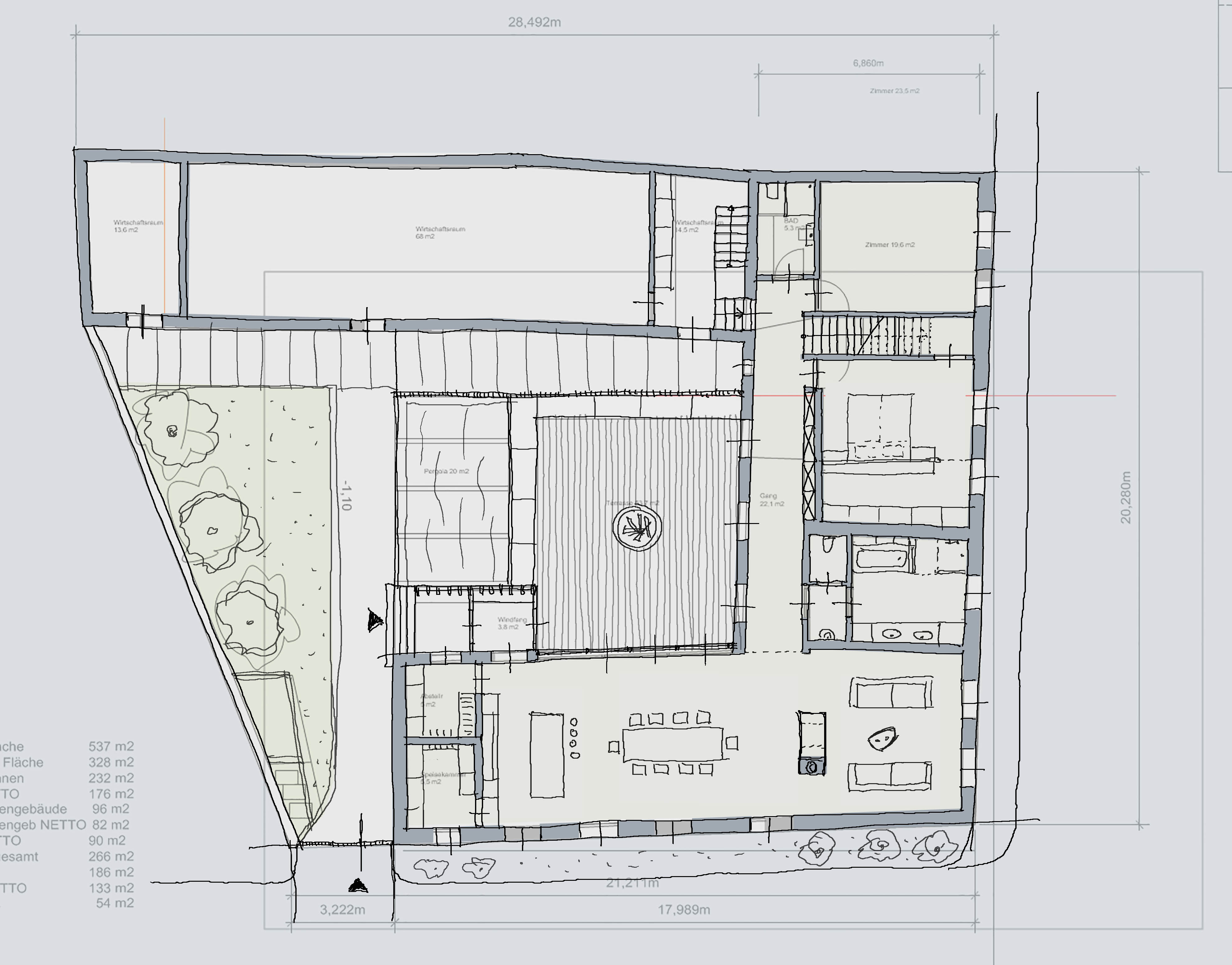 Ein Bestandshaus wird als neues Zuhause für einen Koch und Grillmeister und seine Familie in einen modernen Lebensraum transfomiert. Auch hier bildet ein Atrium das Zentrum des Geschehens im Aussenraum, wohin sich die Räume und das Leben orientierten. Ein zusätzlicher Dachaufbau im Westen des Hauses schenkt den zwei Söhnen einen neuen großzügigen Wohnraum. Der Hauptraum wird hingegen in seiner vollen Höhe genutzt. Der alte Dachstuhl bleibt mit sichtbaren Blaken sichtbar bestehen.