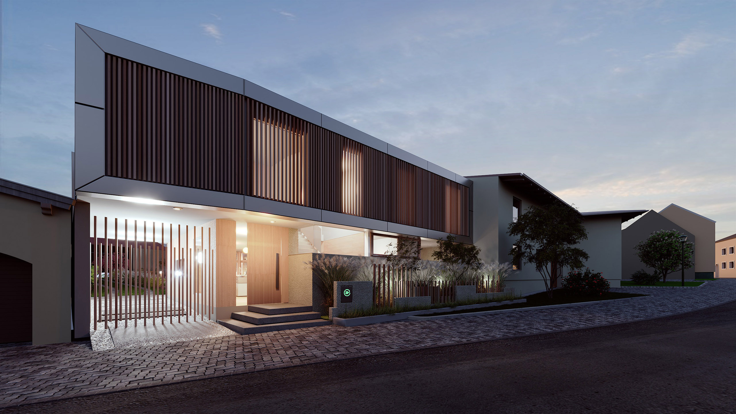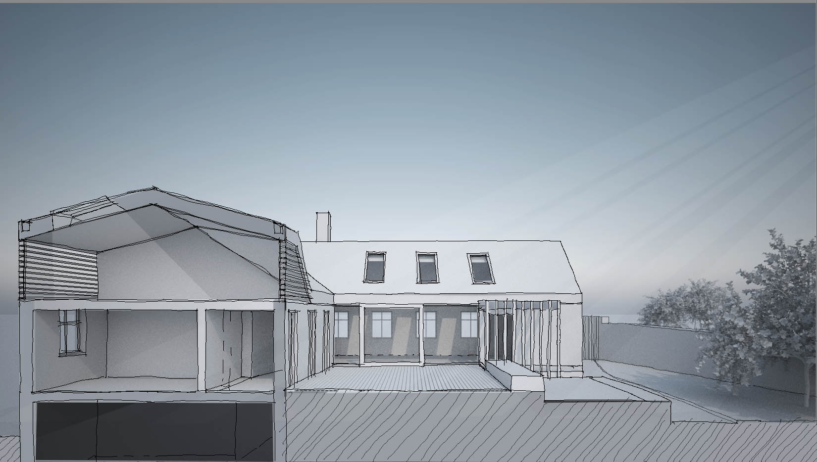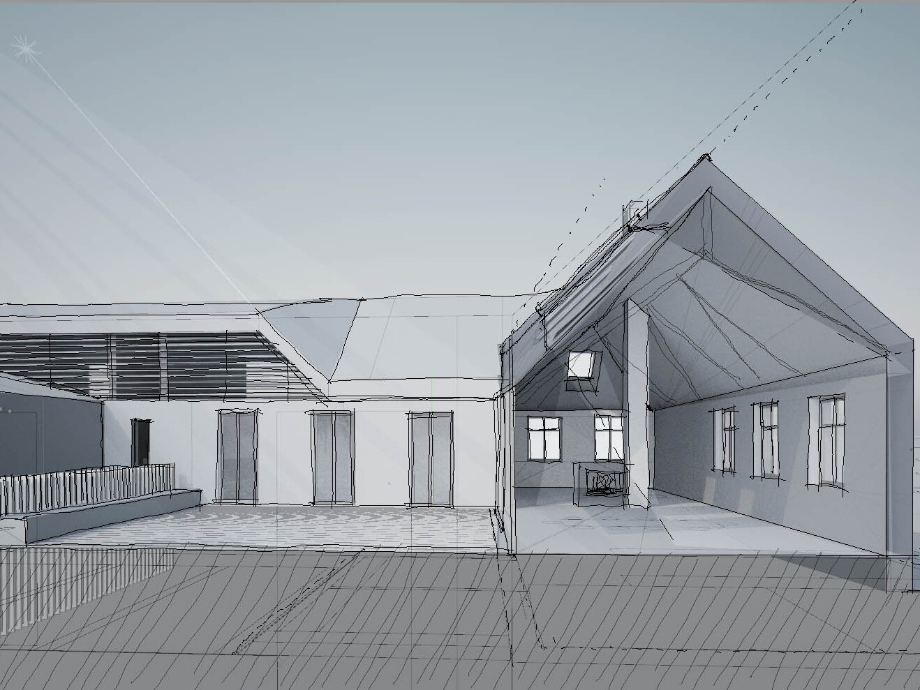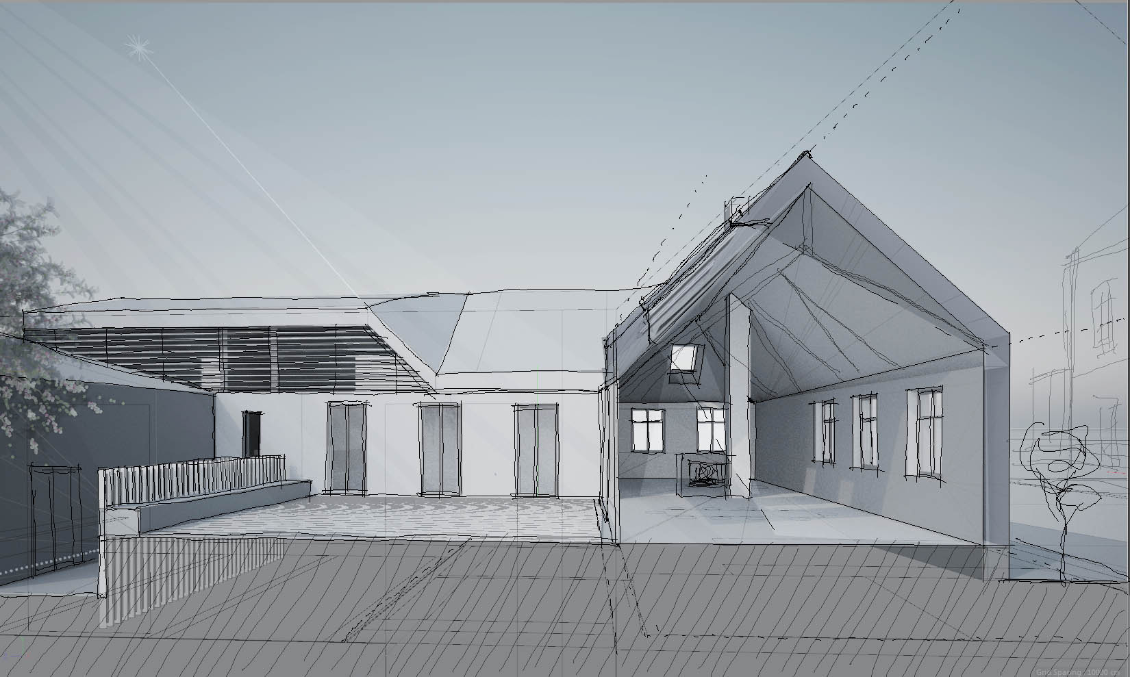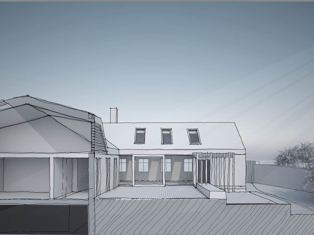 Ein Bestandshaus wird als neues Zuhause für einen Koch und Grillmeister und seine Familie in einen modernen Lebensraum transfomiert. Auch hier bildet ein Atrium das Zentrum des Geschehens im Aussenraum, wohin sich die Räume und das Leben orientierten. Ein zusätzlicher Dachaufbau im Westen des Hauses schenkt den zwei Söhnen einen neuen großzügigen Wohnraum. Der Hauptraum wird hingegen in seiner vollen Höhe genutzt. Der alte Dachstuhl bleibt mit sichtbaren Blaken sichtbar bestehen.