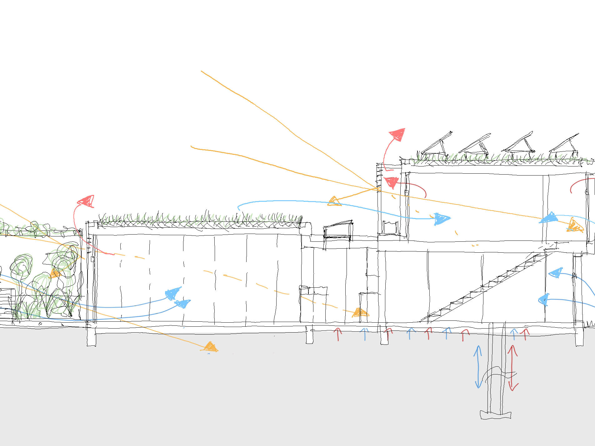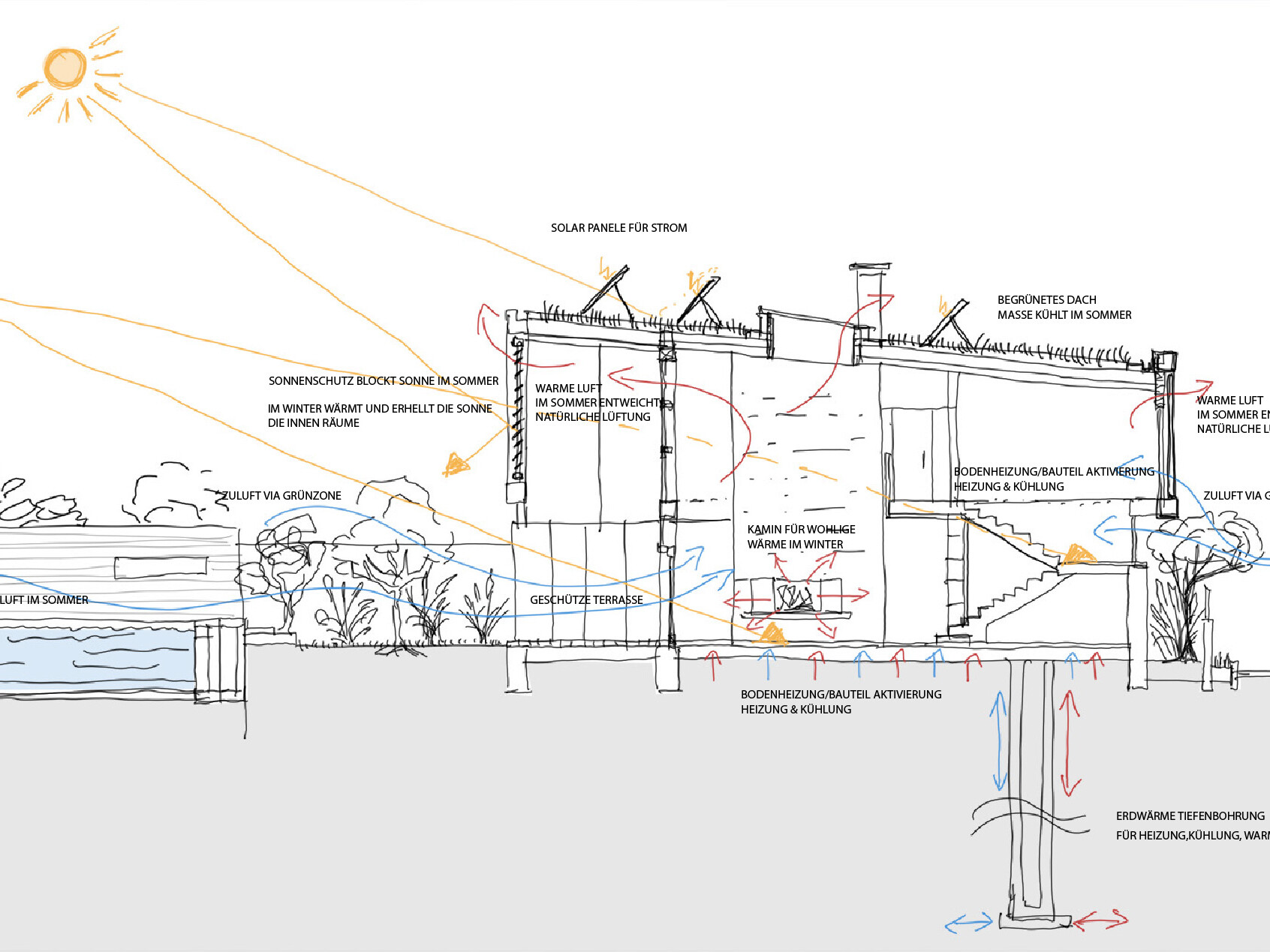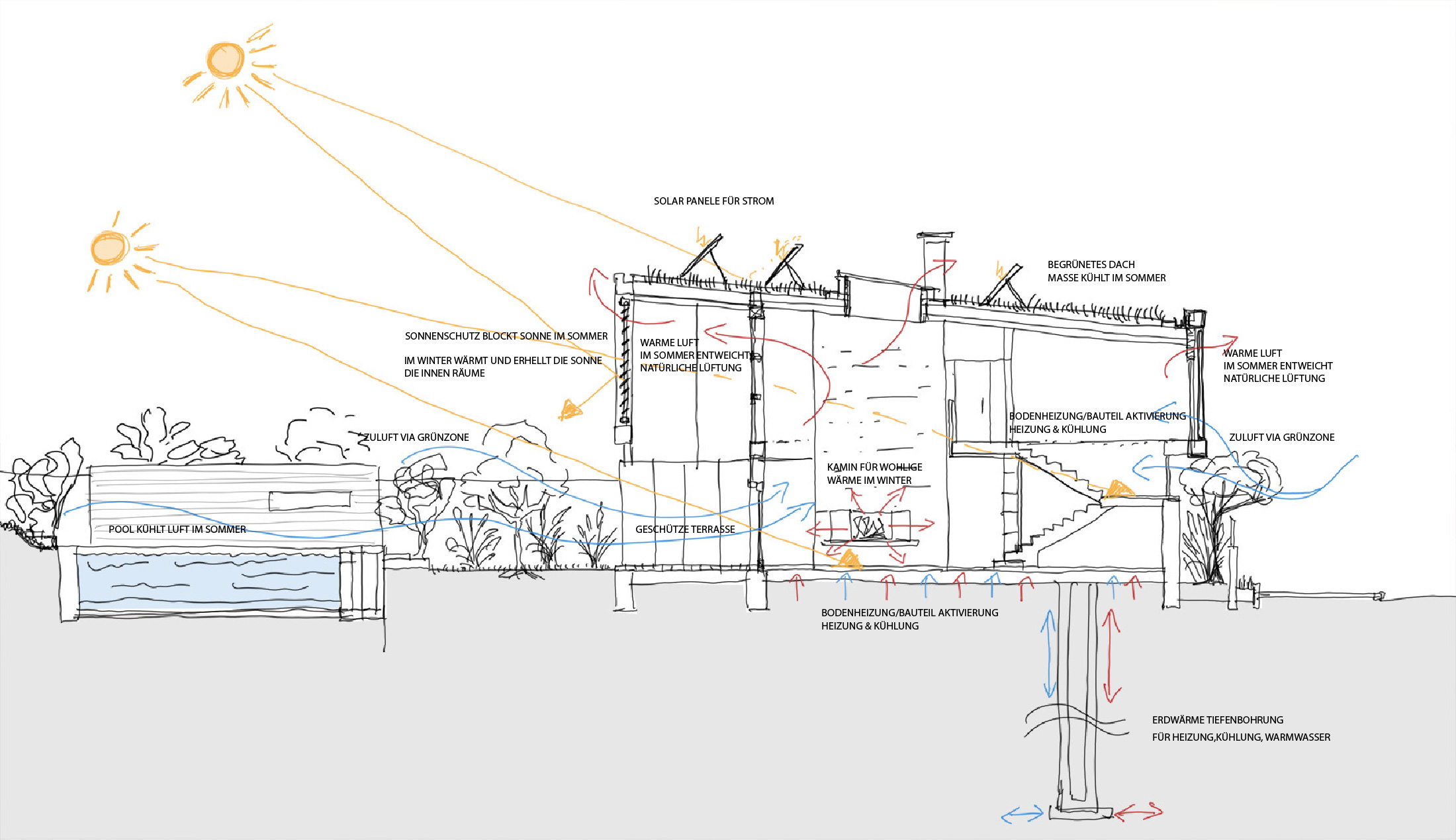 Im Sommer sind alle Räume durch intelligenten Sonnenschutz und auskragende Bauteile ausreichend beschattet. Darüber “schwebt” die 3.Ebene mit Home-Office, Bad, Wellness und Schlafräumen der Eltern. Das gesamte Haus ist nahezu Energieautark, Alle Baustoffe sind öklogisch und recylebar, viel Holz, Ziegel 3-Scheiben Isolierglas, natüreliche Dämmung. Heizung, Kühlung, Wasser, Strom usw wird mit Tiefenbohrung, PV anlage und passiver Energiegewinnung über gesteuerte Sonneneinstrahlung erzeugt.