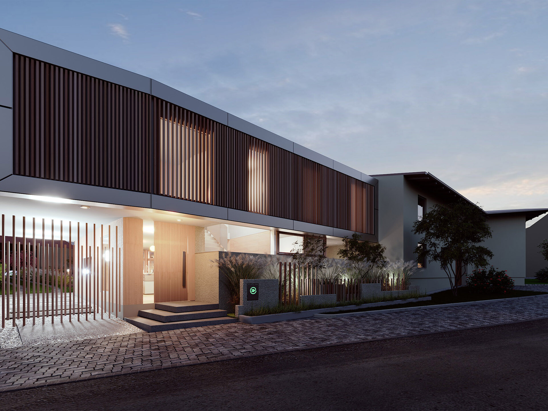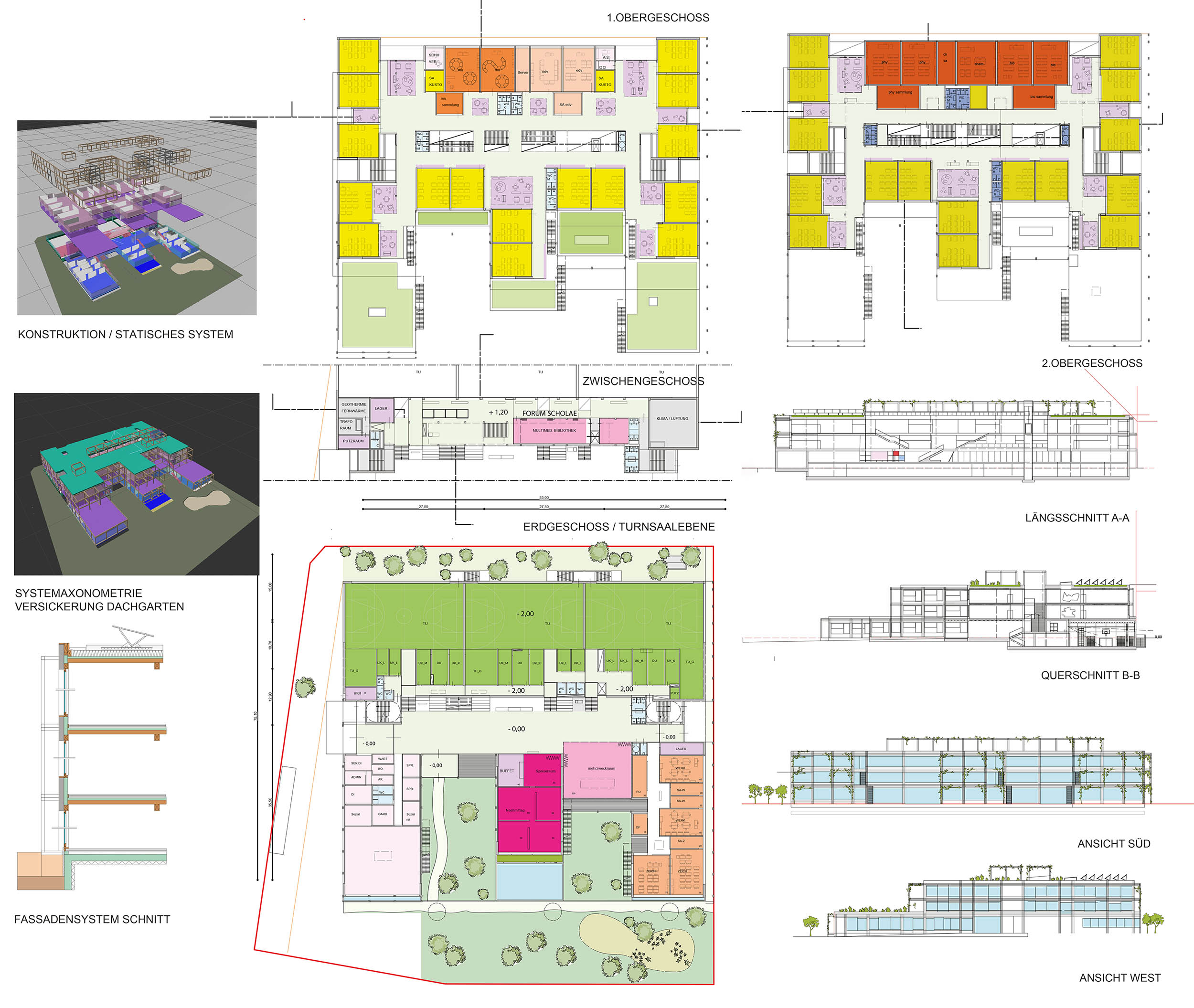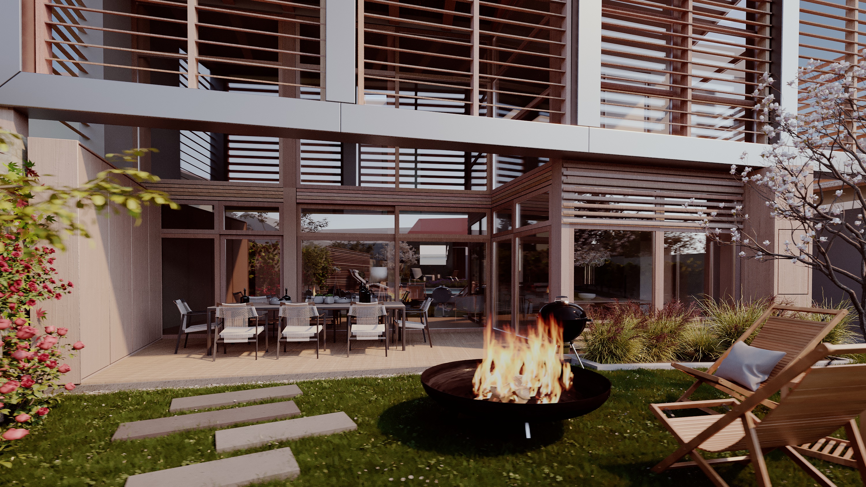 Im Sommer sind alle Räume durch intelligenten Sonnenschutz und auskragende Bauteile ausreichend beschattet. Darüber “schwebt” die 3.Ebene mit Home-Office, Bad, Wellness und Schlafräumen der Eltern. Das gesamte Haus ist nahezu Energieautark, Alle Baustoffe sind öklogisch und recylebar, viel Holz, Ziegel 3-Scheiben Isolierglas, natüreliche Dämmung. Heizung, Kühlung, Wasser, Strom usw wird mit Tiefenbohrung, PV anlage und passiver Energiegewinnung über gesteuerte Sonneneinstrahlung erzeugt.