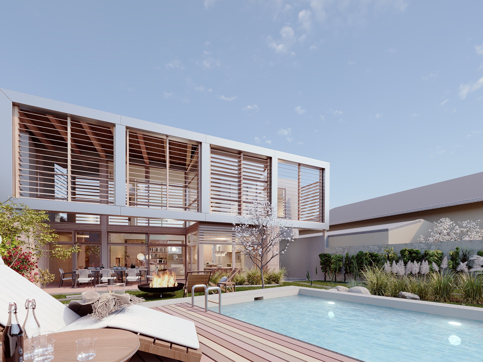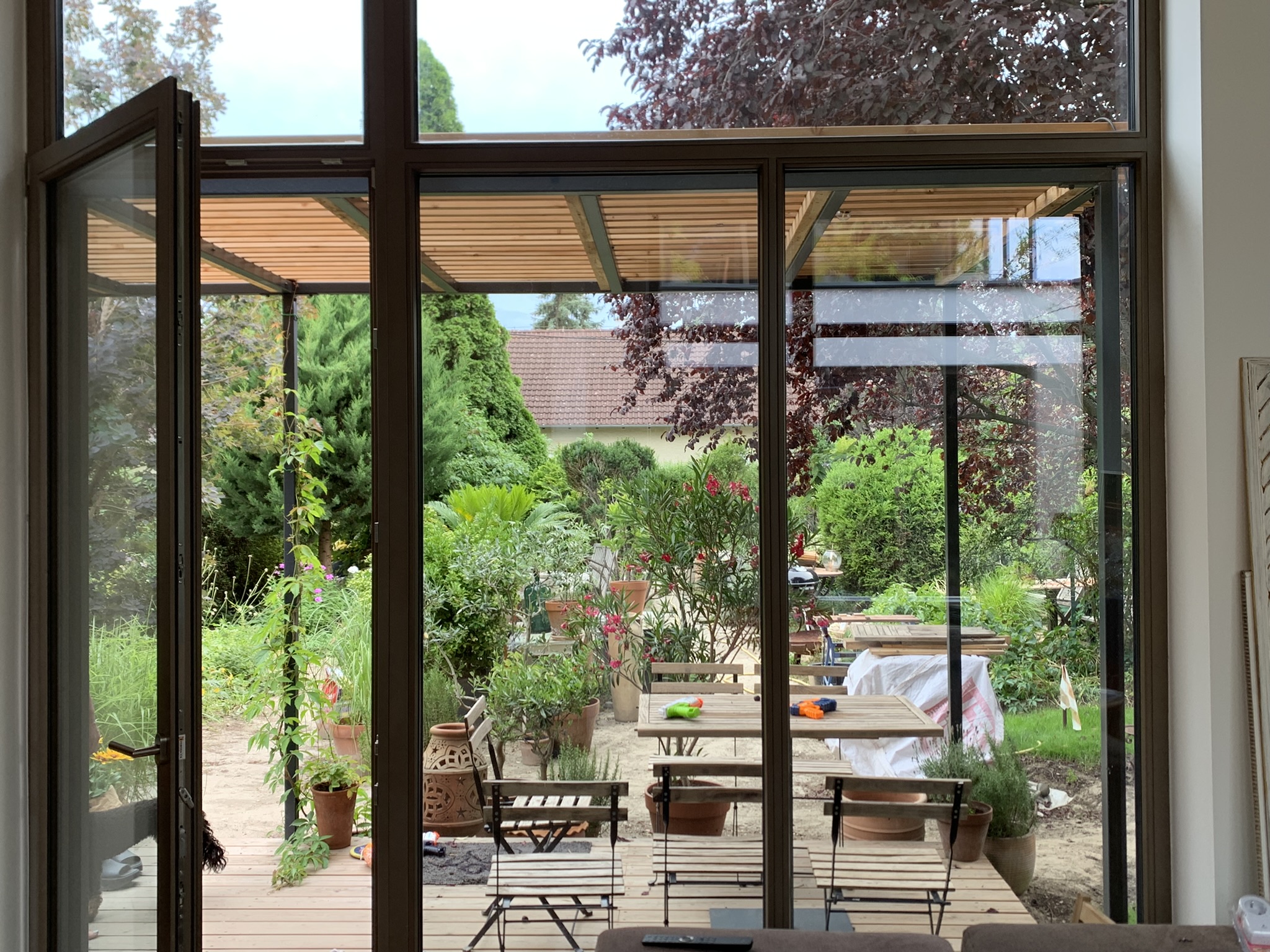 Als allgemein schützende Haut, im speziellen gegen Sonne, Hitze, Wind und Einblicke umgeben Holzschiebeelemente das innere Herzstück.