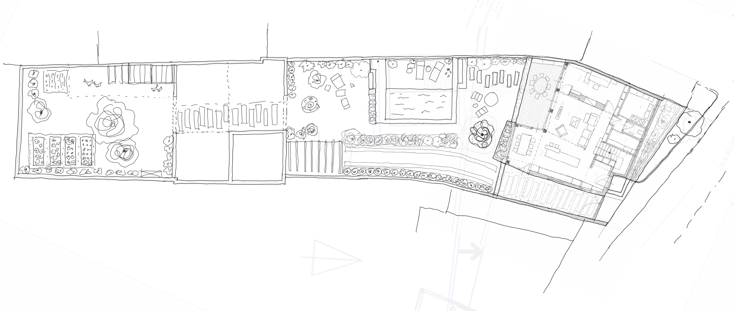 Es ist ein ebenerdiges Haus für ein älteres Ehepaar mit angeschlossenem Atelier. Das Zentrum der gesamten Wohneinheit bildet ein ca. 10 x 10m kleiner Atriumgarten, um den sich das ganze Haus geschmeidig anlehnt. Das ganze Leben spielt sich im Inneren des Grundstückes ab.