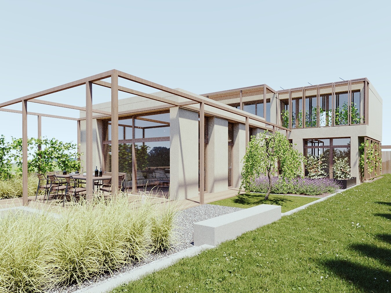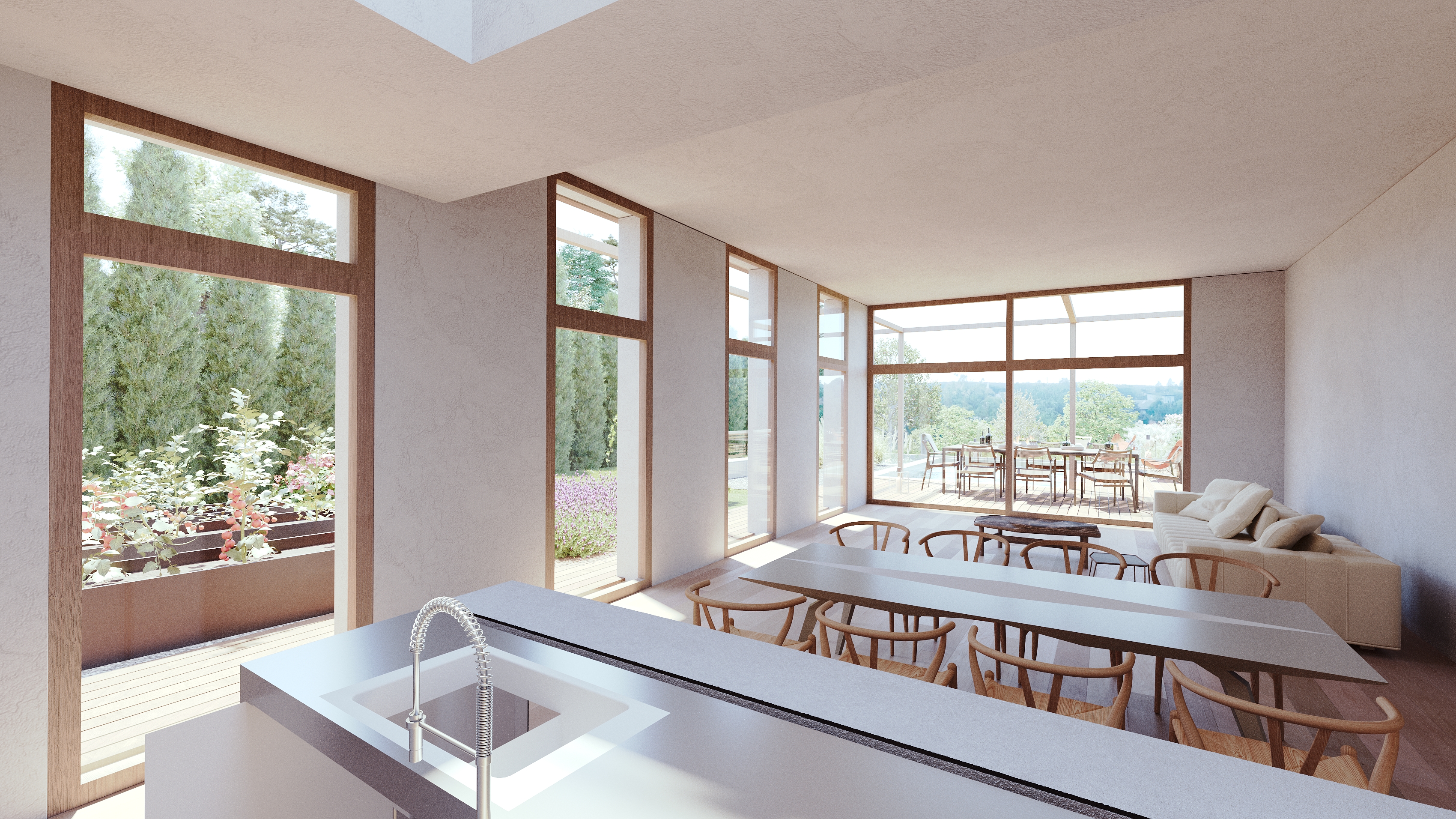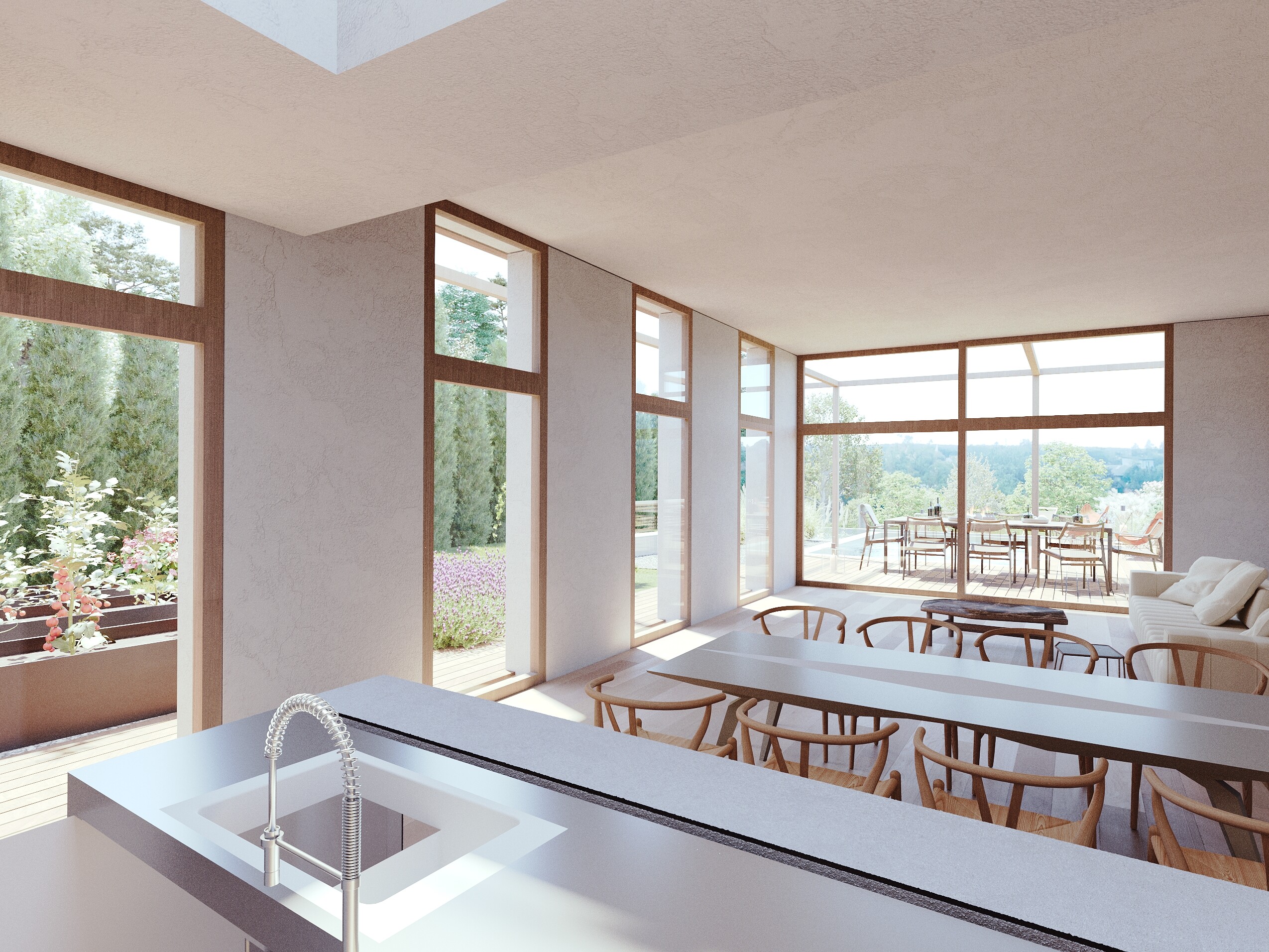 Über eine großzügige Terrasse, die überdacht Schutz vor Sonne und Regen spendet, kann man alle Räume des Hauses betreten. Der Hauptraum ist eine großzügige Wohnküche, das auch das Zentrum des Hauses bildet. Die warmen Beigetöne kombiniert mit den rhytmischen gegliederten Fenstern bilden eine ruhige und angenehme Wohnkulisse.