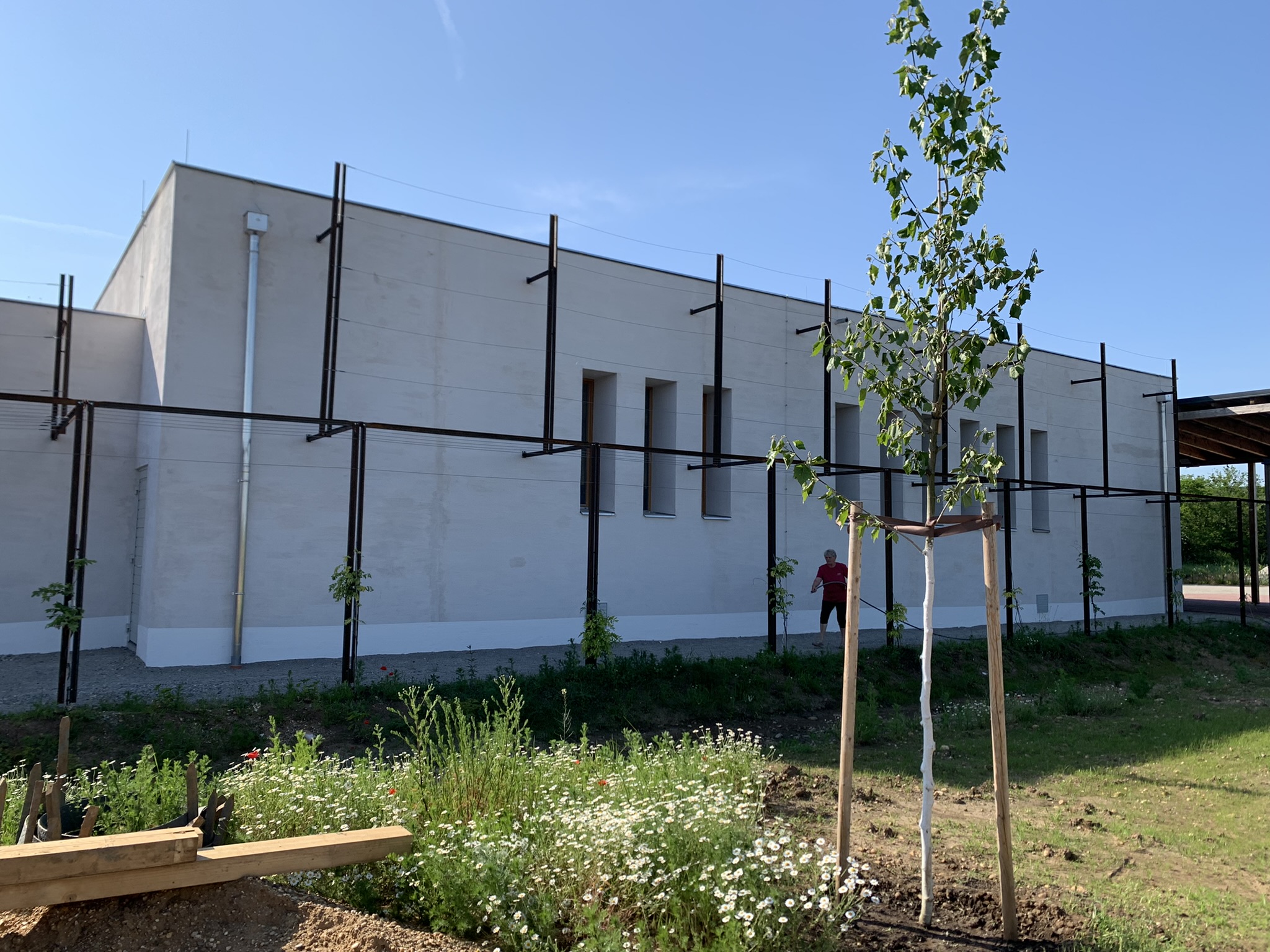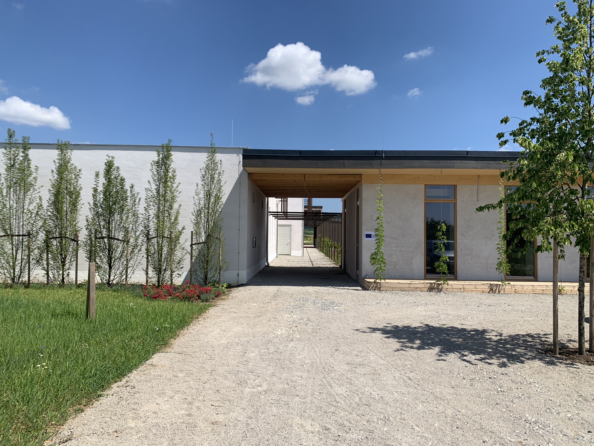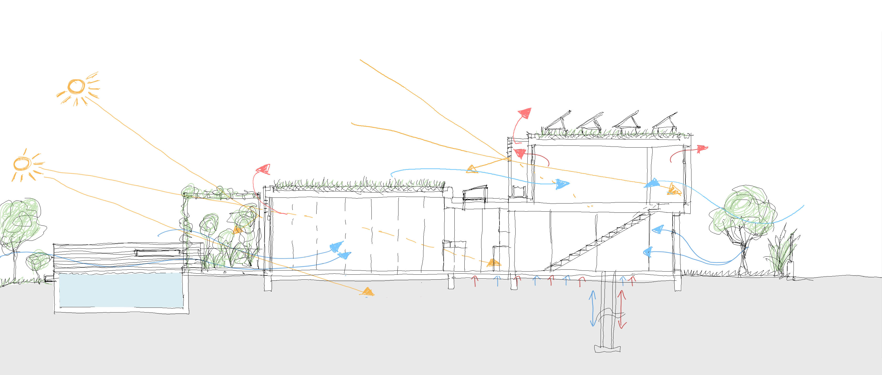 Ein Weingut das ohne extra Klimaanlange und Lüftungen auskommt, mit 80cm dicken massiven Wänden aus Ziegel, das ein ausgeglichenes langsames Klima schafft. Mit begrühntem Dach, Ranken und Bäume zur Selbstbeschattung. Dies ermöglichst den betrieb mit stark reduziertem externen Energieaufwand. Auch das verwendetet Wasser versickert direkt am Grund und bewässert Kräuter, Wiesen , Blumen und Bäume, die wiederum das Weingut selbst beschatten und im Sommer kühlen, alles im biologischen Kreislauf.
