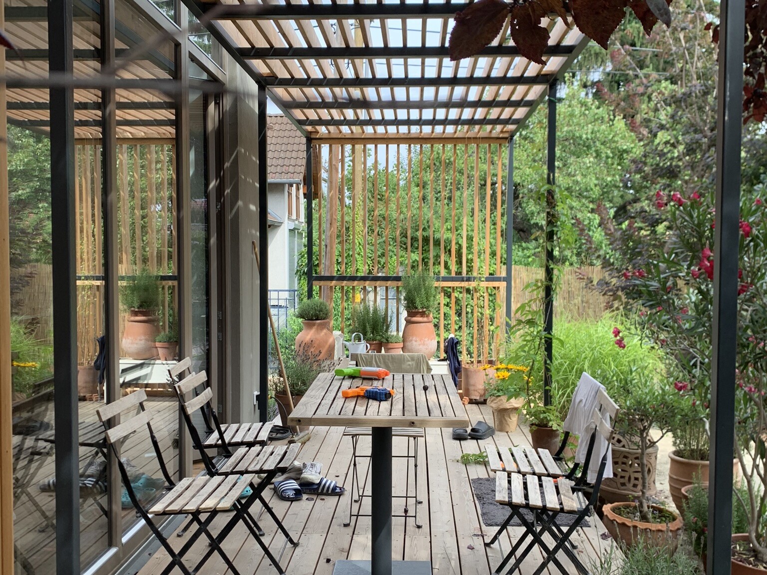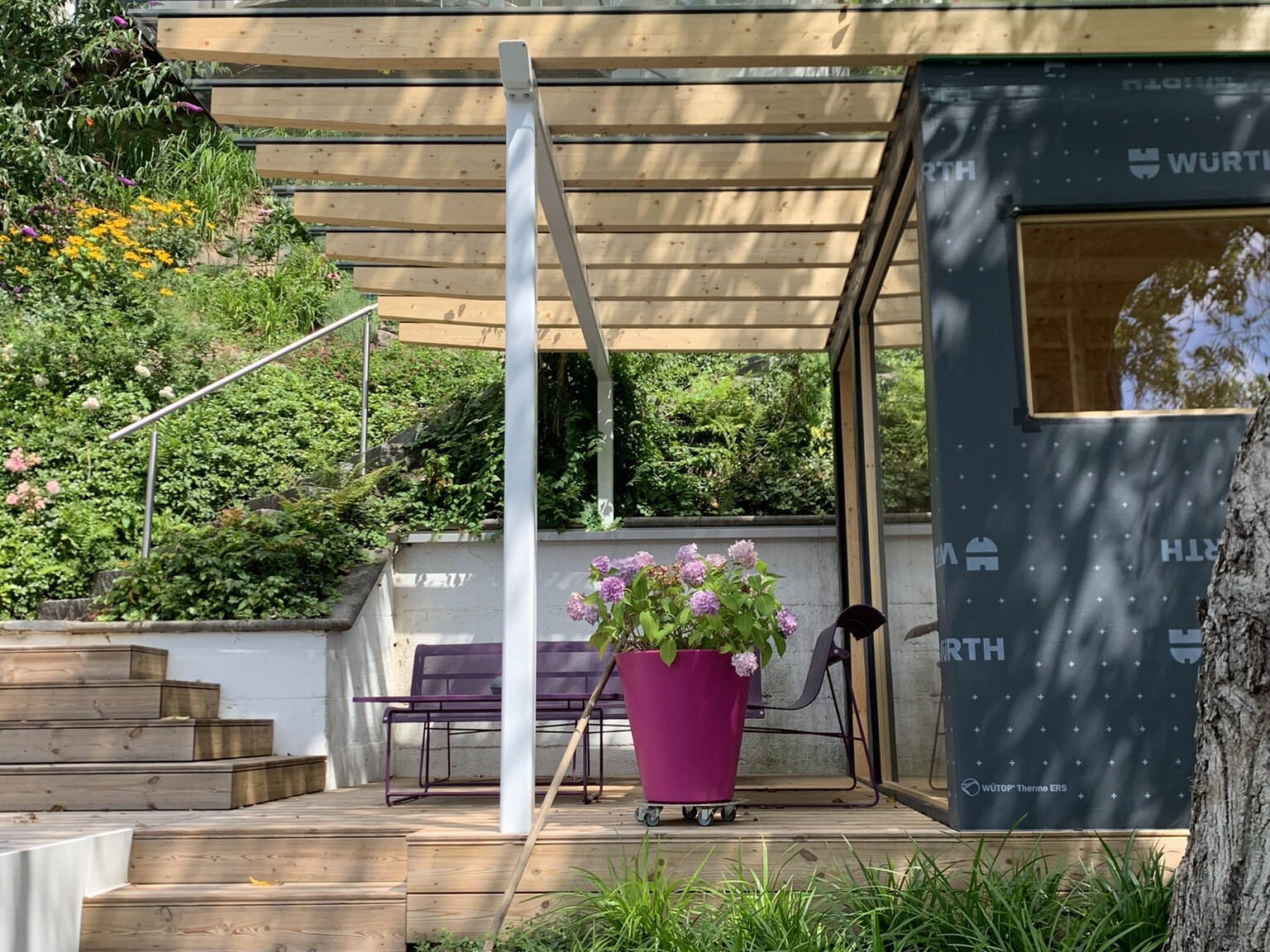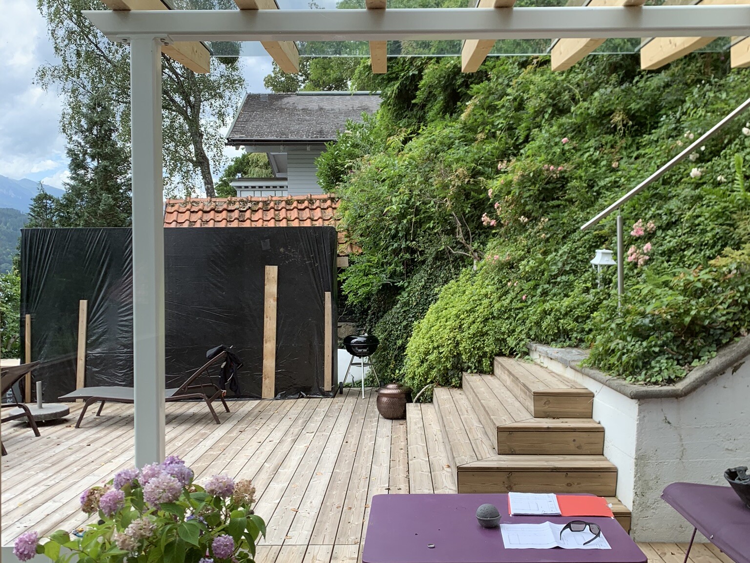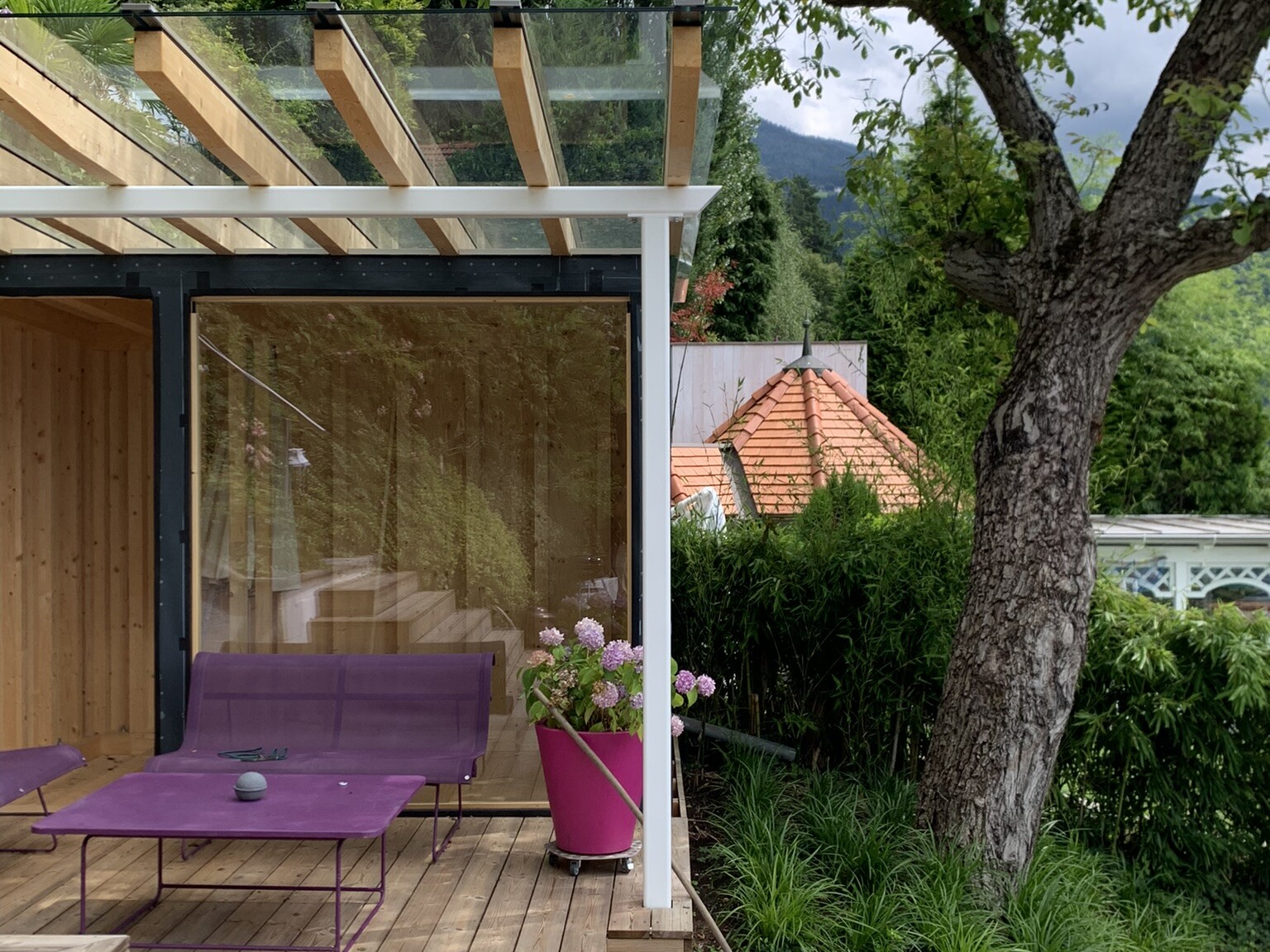 Zwischen den Schiebetoren und der transparenten Haut spannt sich ein 1,40 m breites überdachtes Holzdeck (Anlehnung an Schiffsdeck) auf. Es ist eine Erweiterung des Innenraumes und ist von alllen Wohnräumen direkt zugänglich.